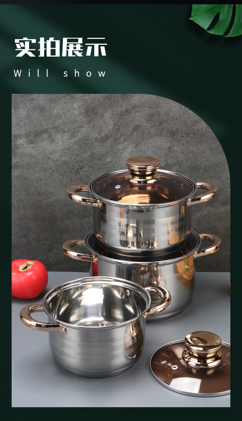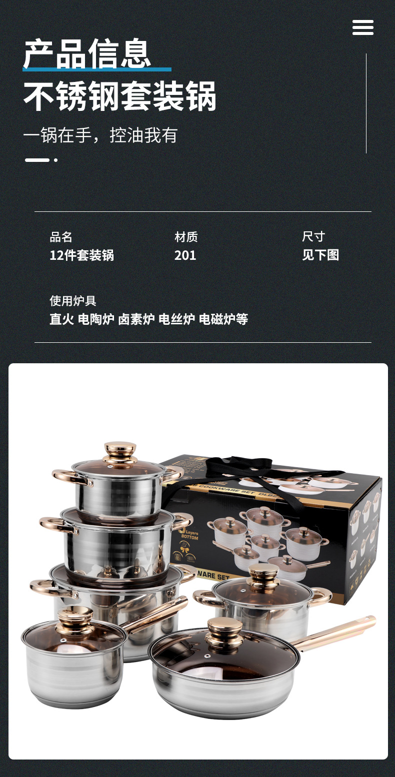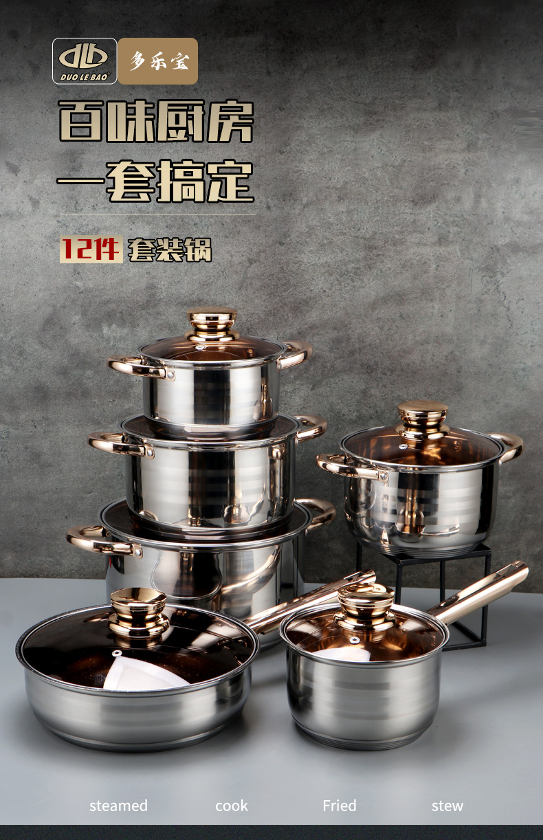外贸跨境不锈钢12件套锅商用锅具批发奶锅煎锅复底礼品汤锅套装锅