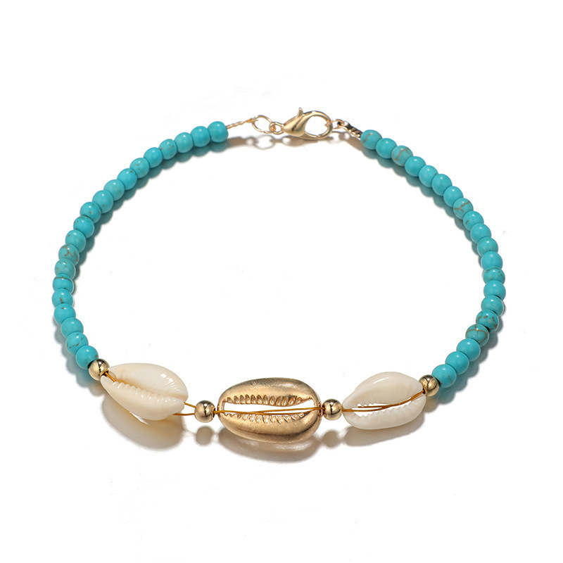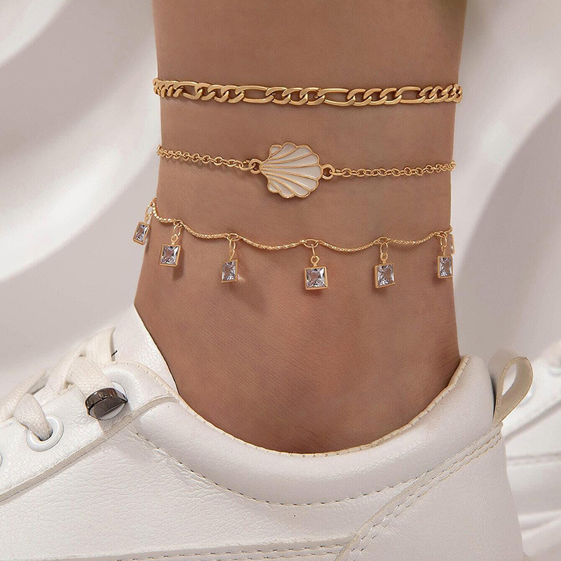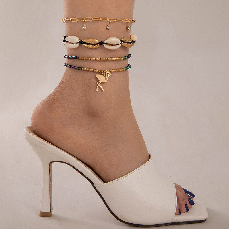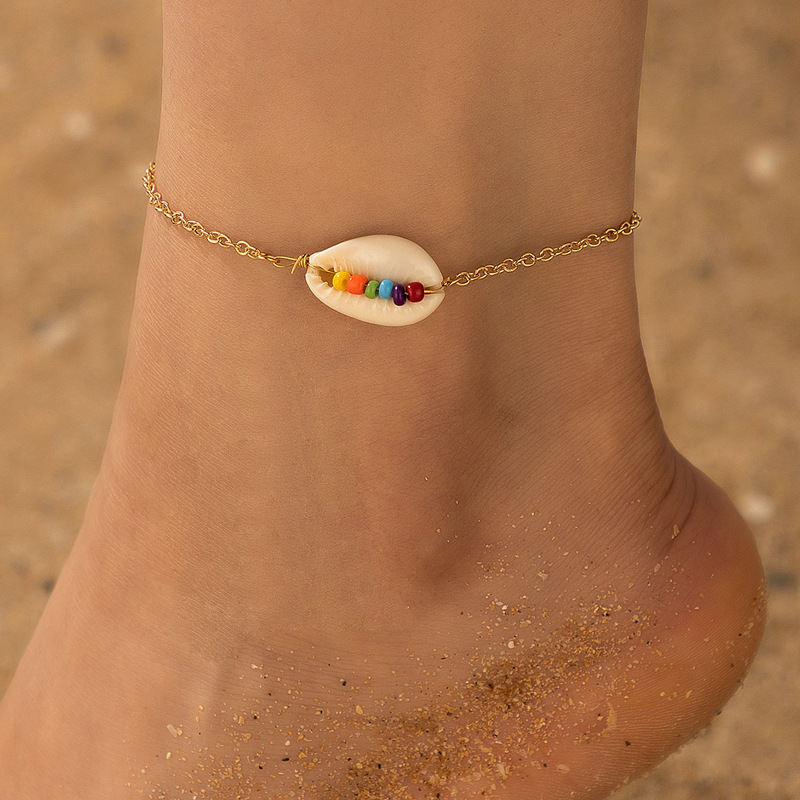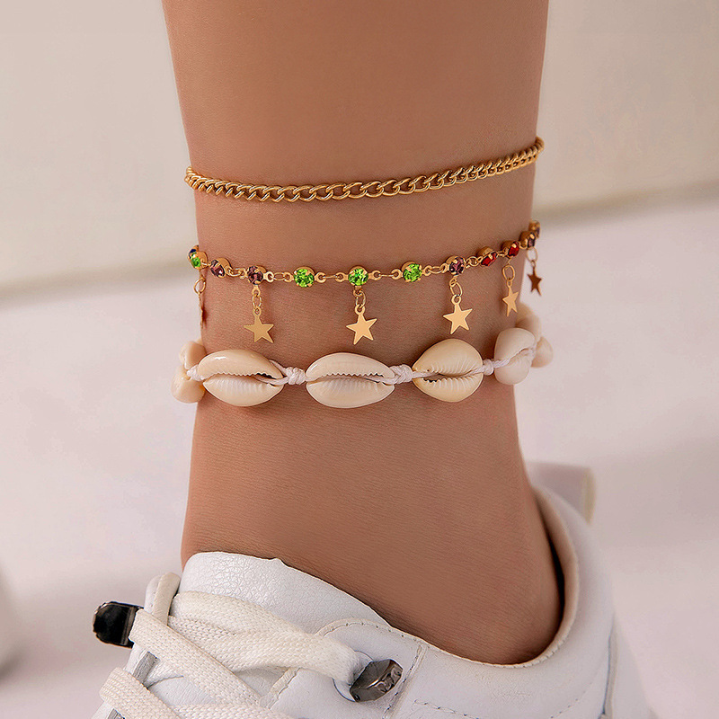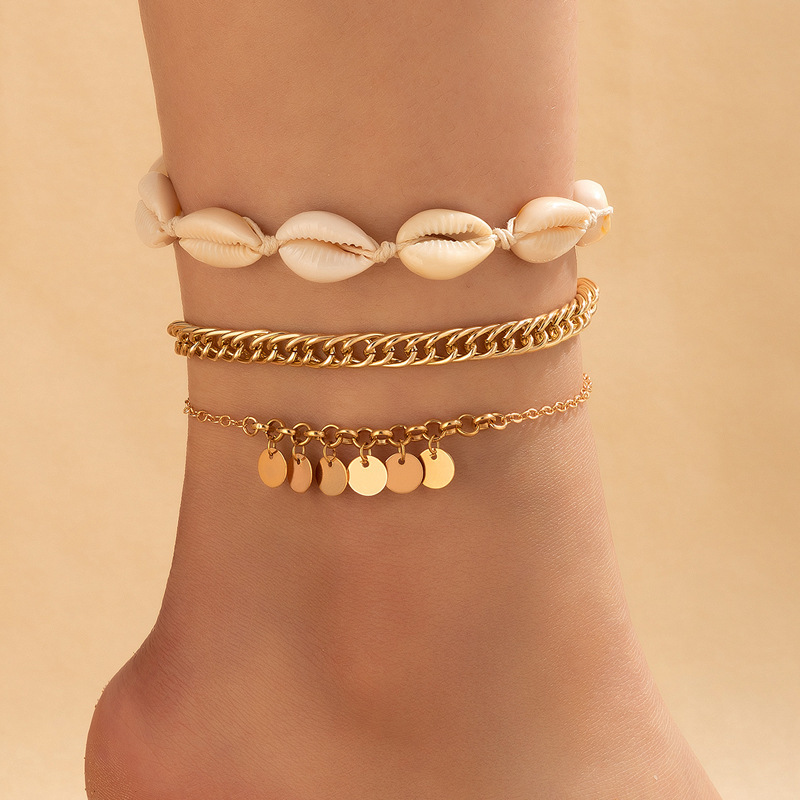 速卖通跨境沙滩风脚饰 贝壳编织多层脚链 滴油贝壳圆片四层脚链