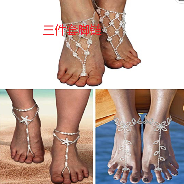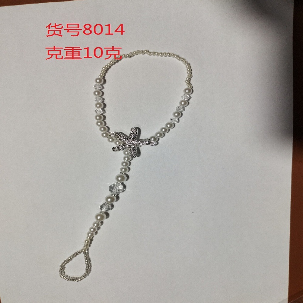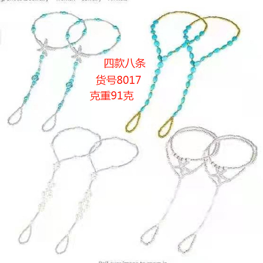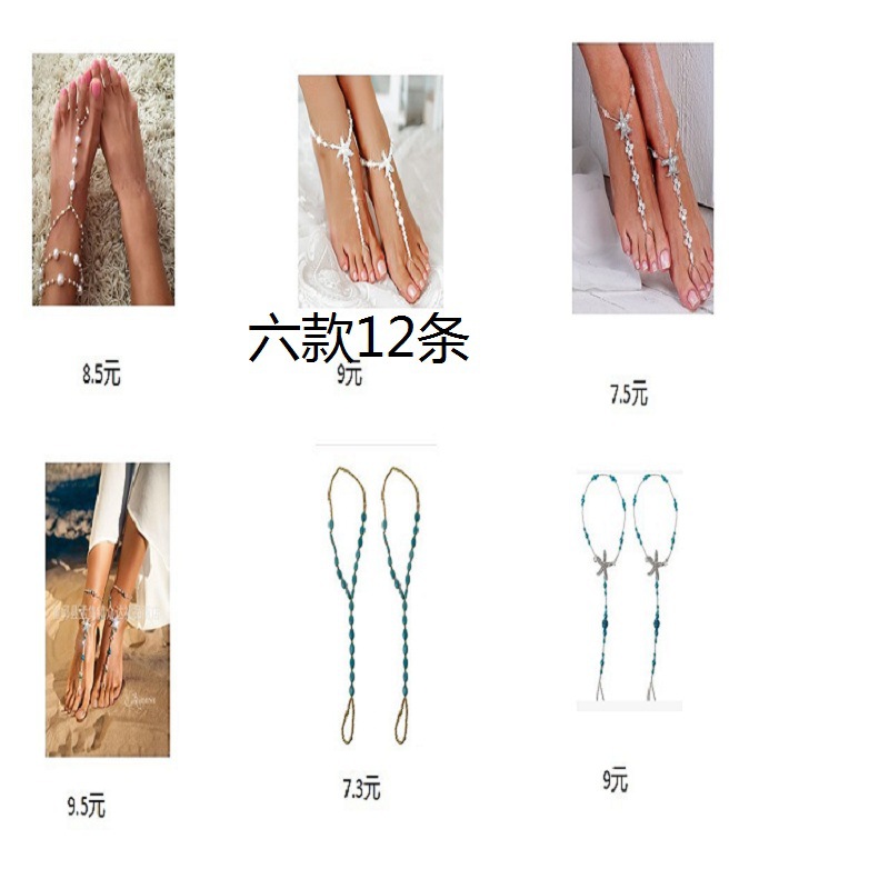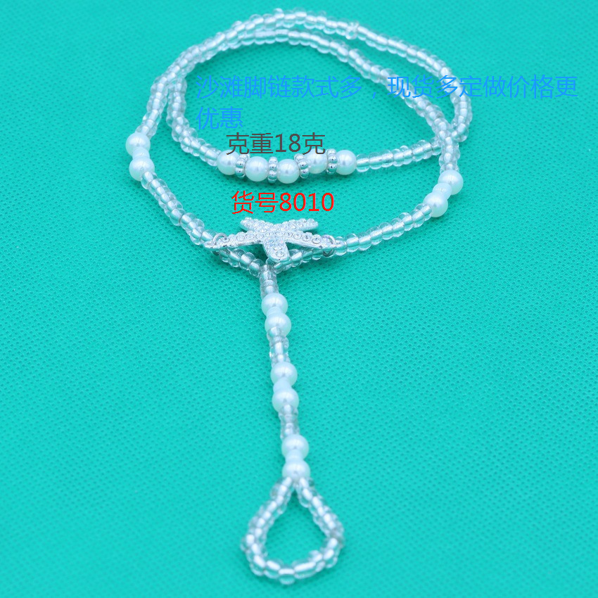 8000仿珍珠弹力绳连趾弹力脚链 钻海星串珠闪脚饰蓝松石套装脚链