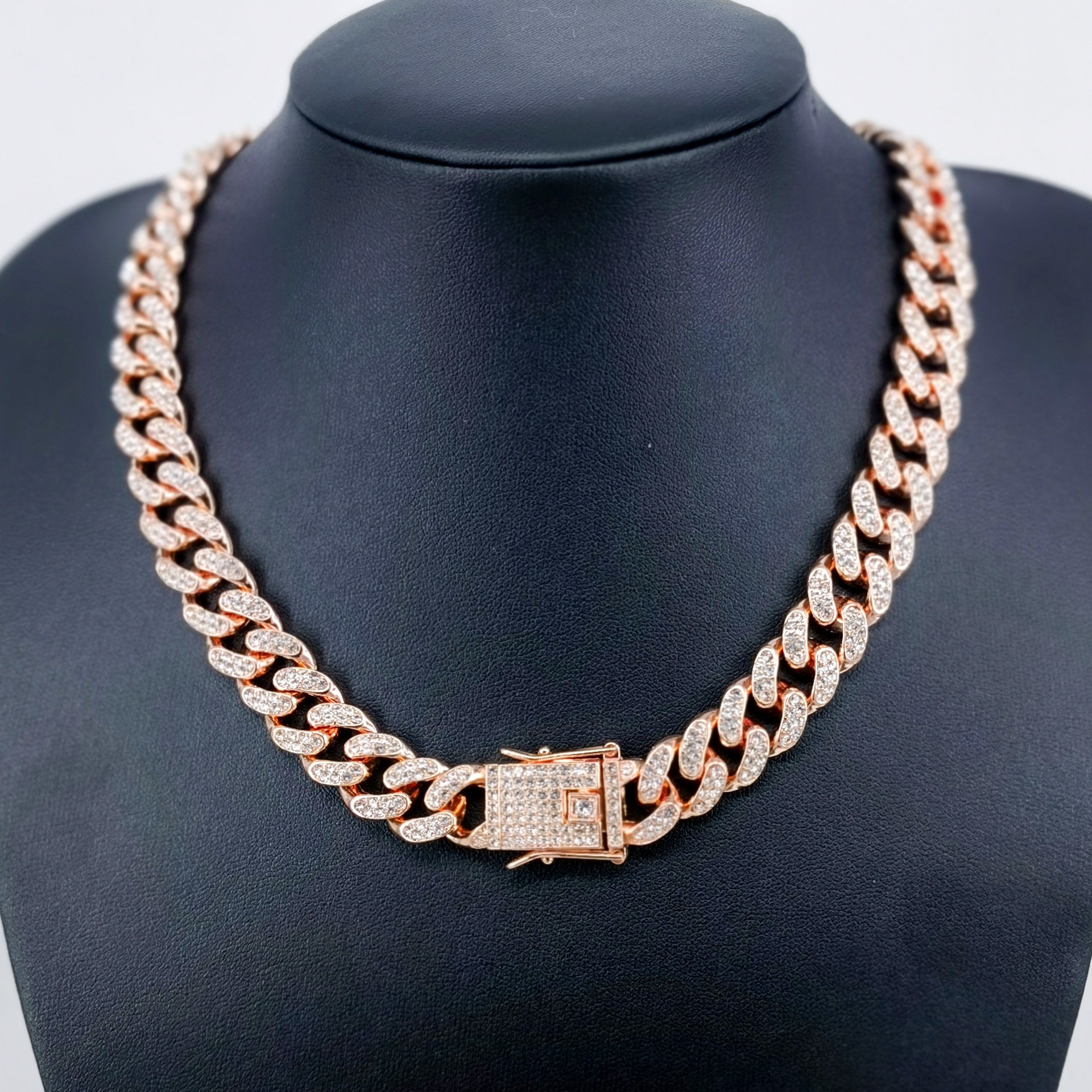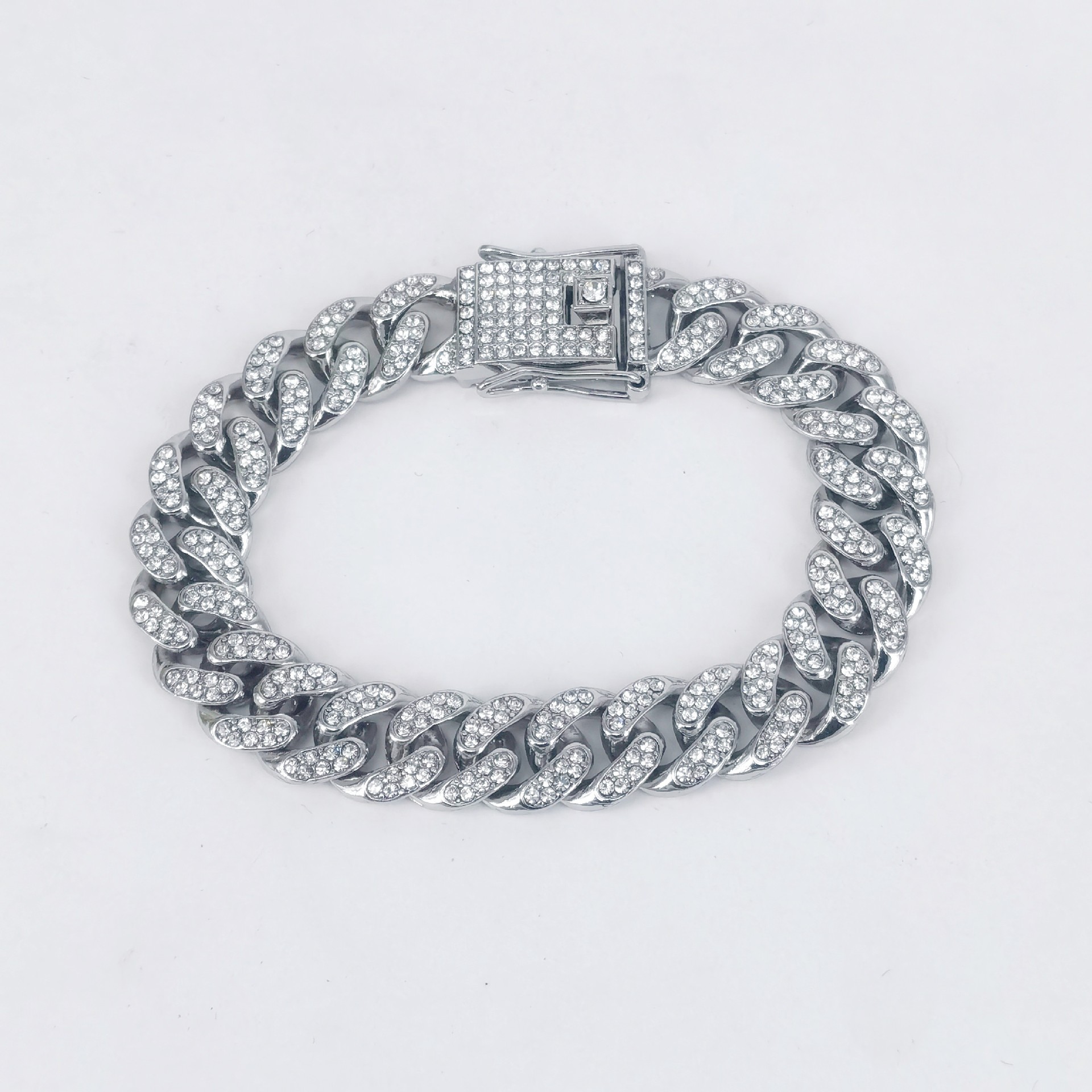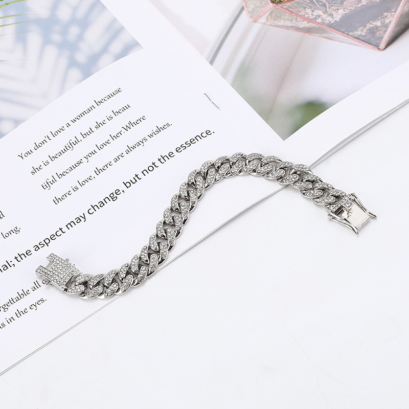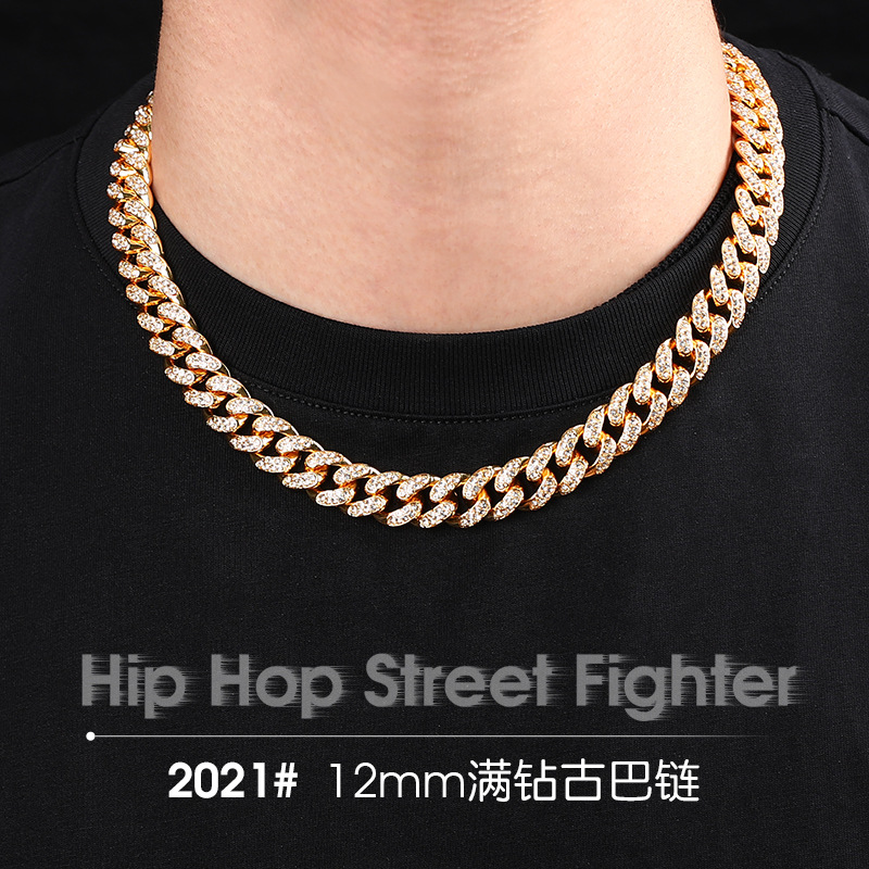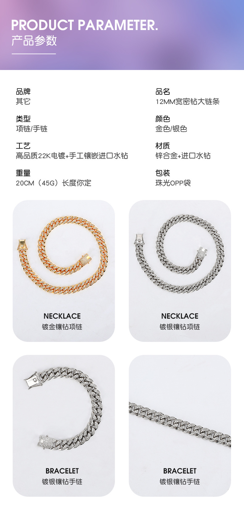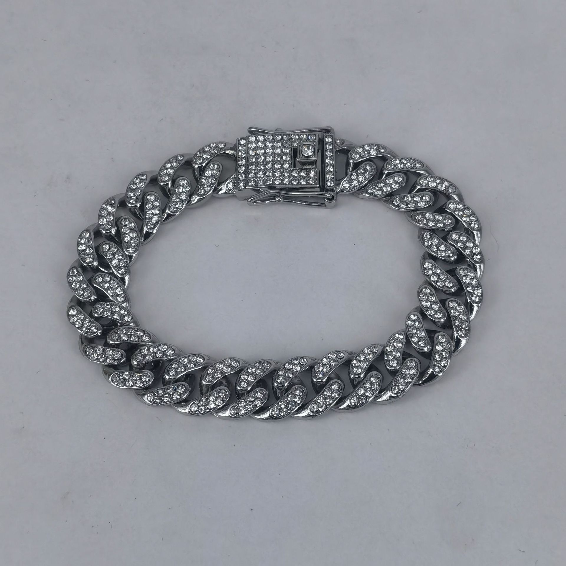 欧美合金线条古巴链镶钻手链12毫米满钻男女士嘻哈风镀金项链跨境