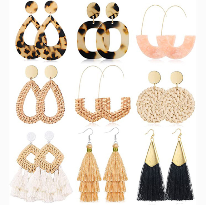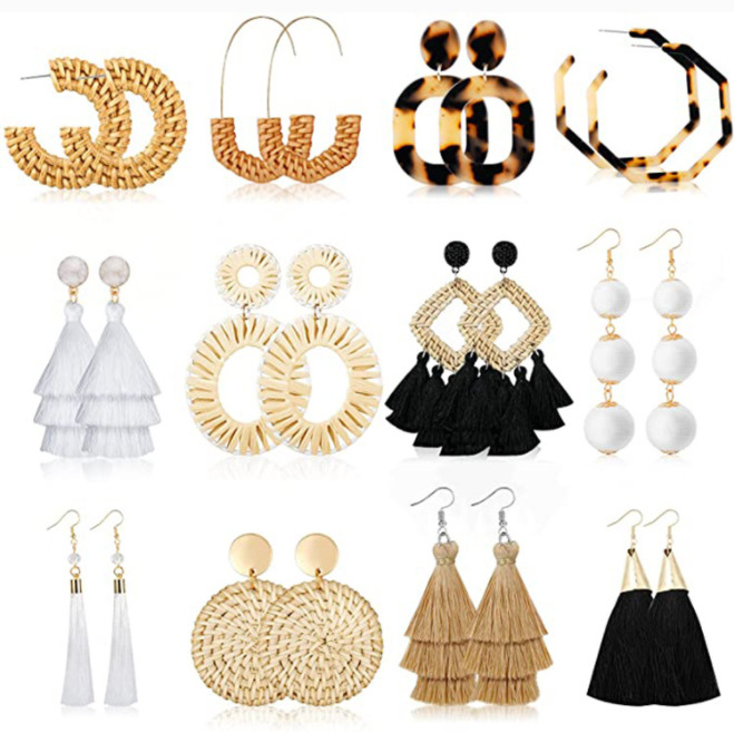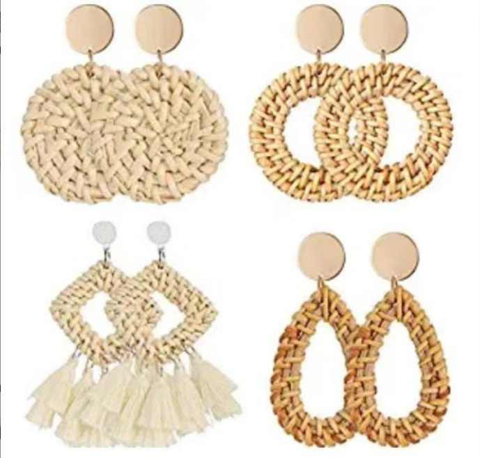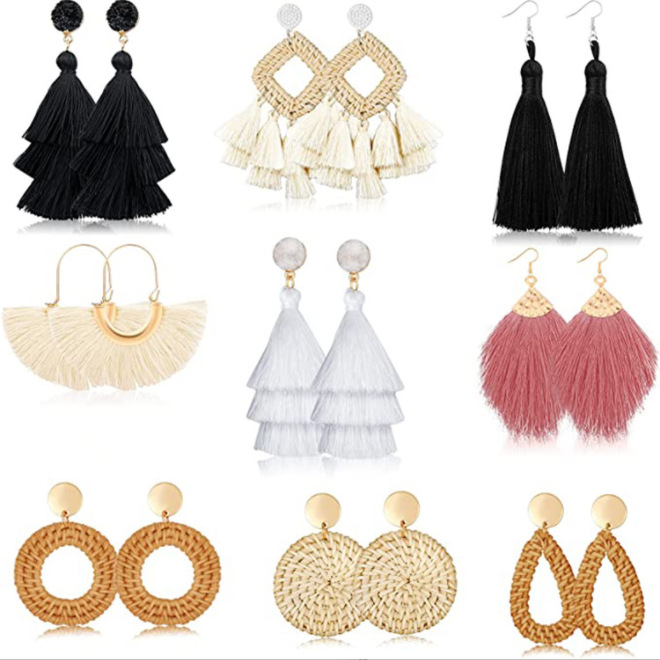 厂家直供 配饰欧美夸张波西米亚风藤编拉菲草流苏耳环饰品 批发