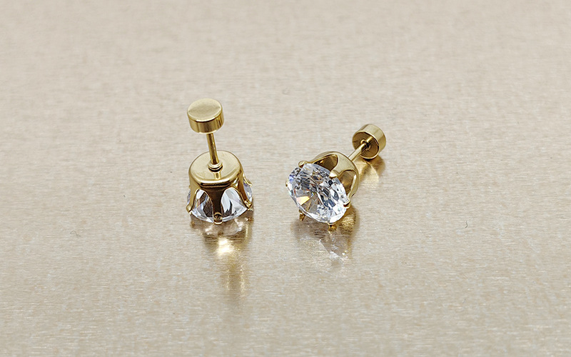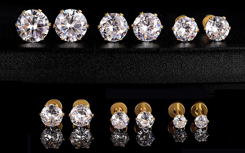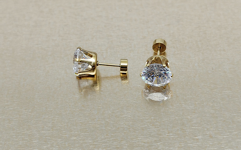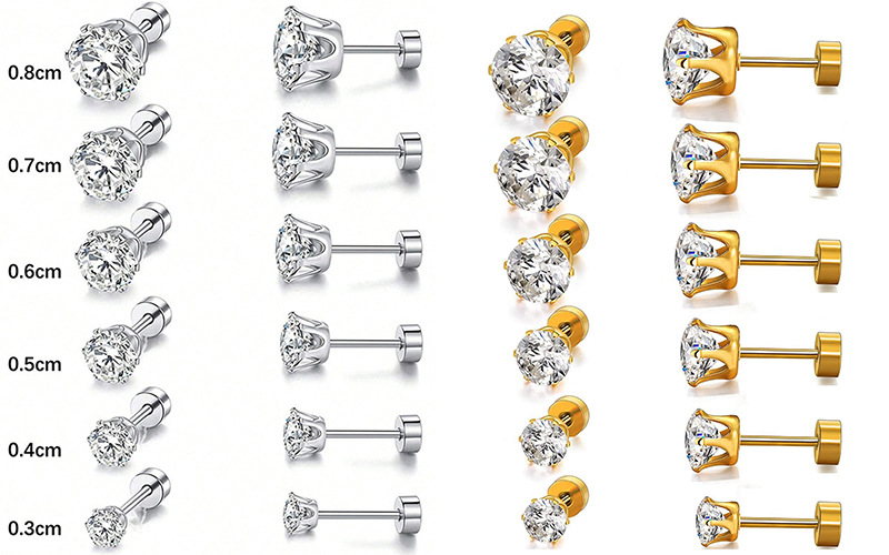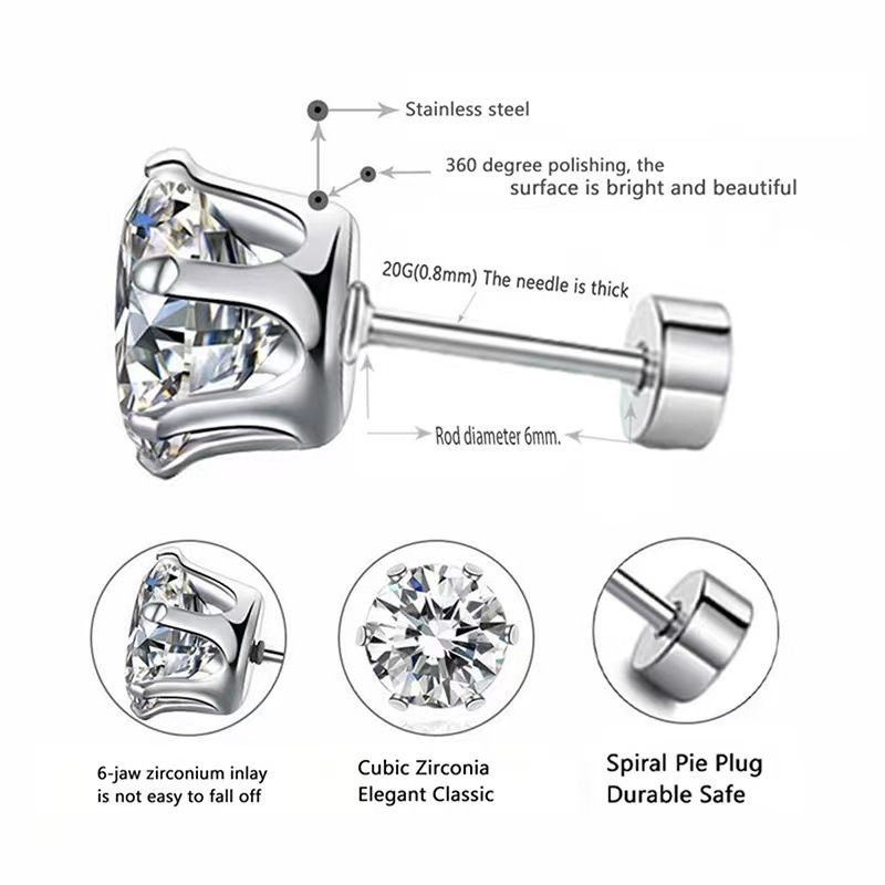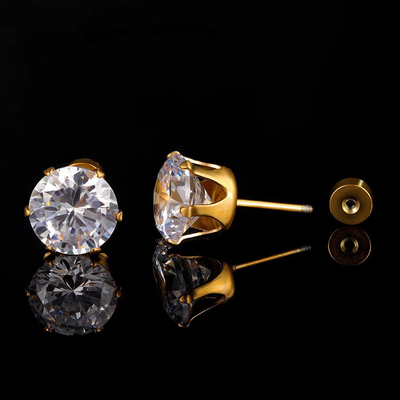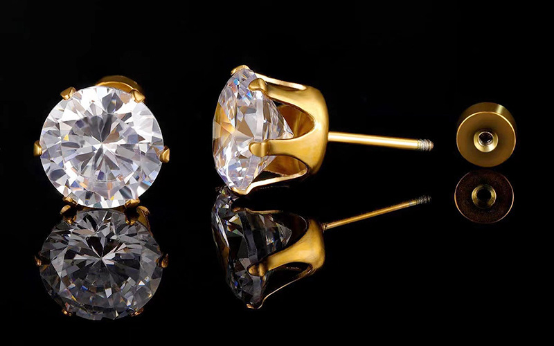 欧美时尚钛钢细针六爪圆形18k镀金锆石耳钉男女通用耳环穿刺饰品