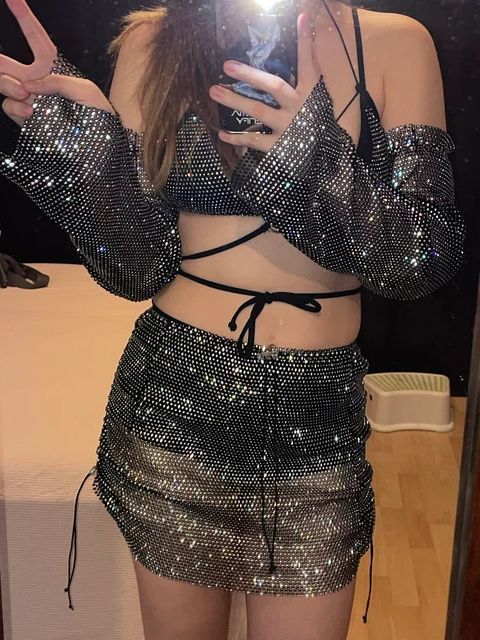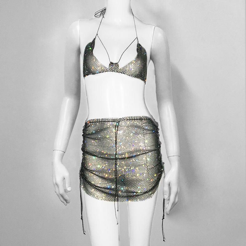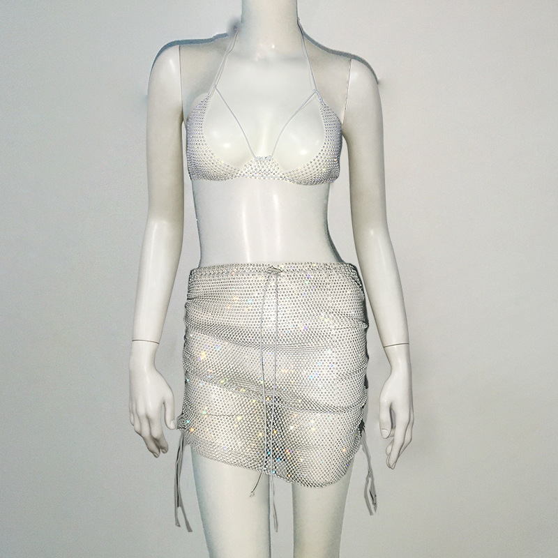 新款跨境女装水钻吊带网眼闪钻渔网上衣性感比基尼上衣迷你裙套装