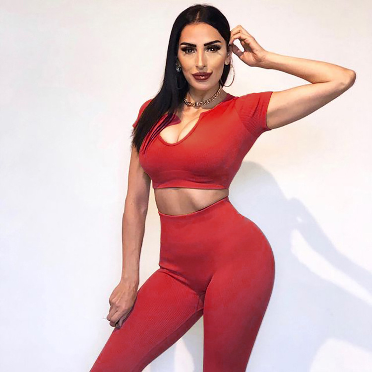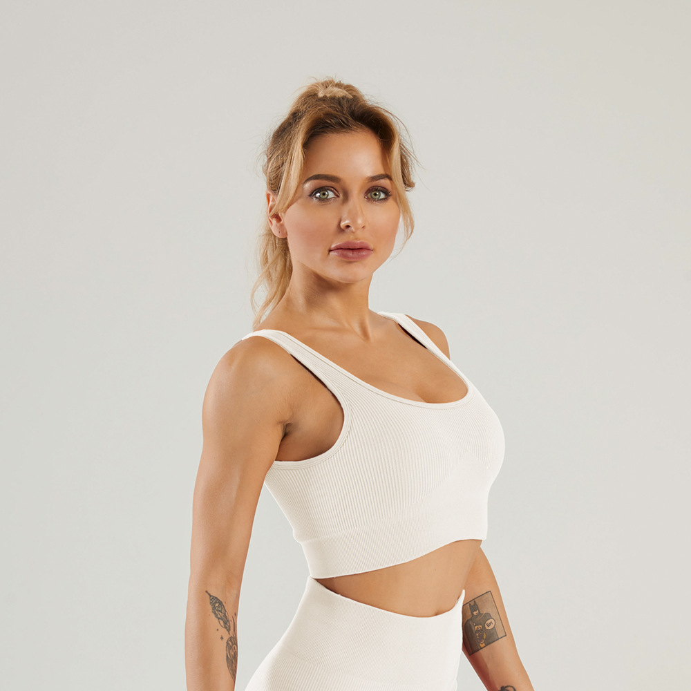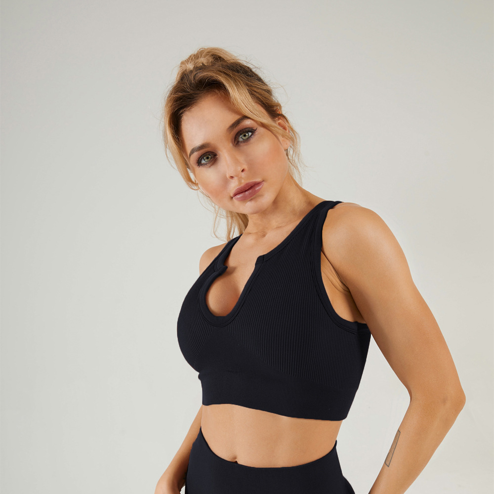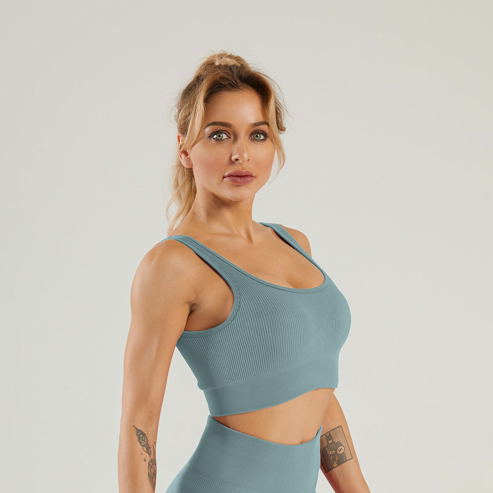 2023鲨鱼针织无缝文胸背心短袖裤子 欧美跨境坑条无缝健身新款