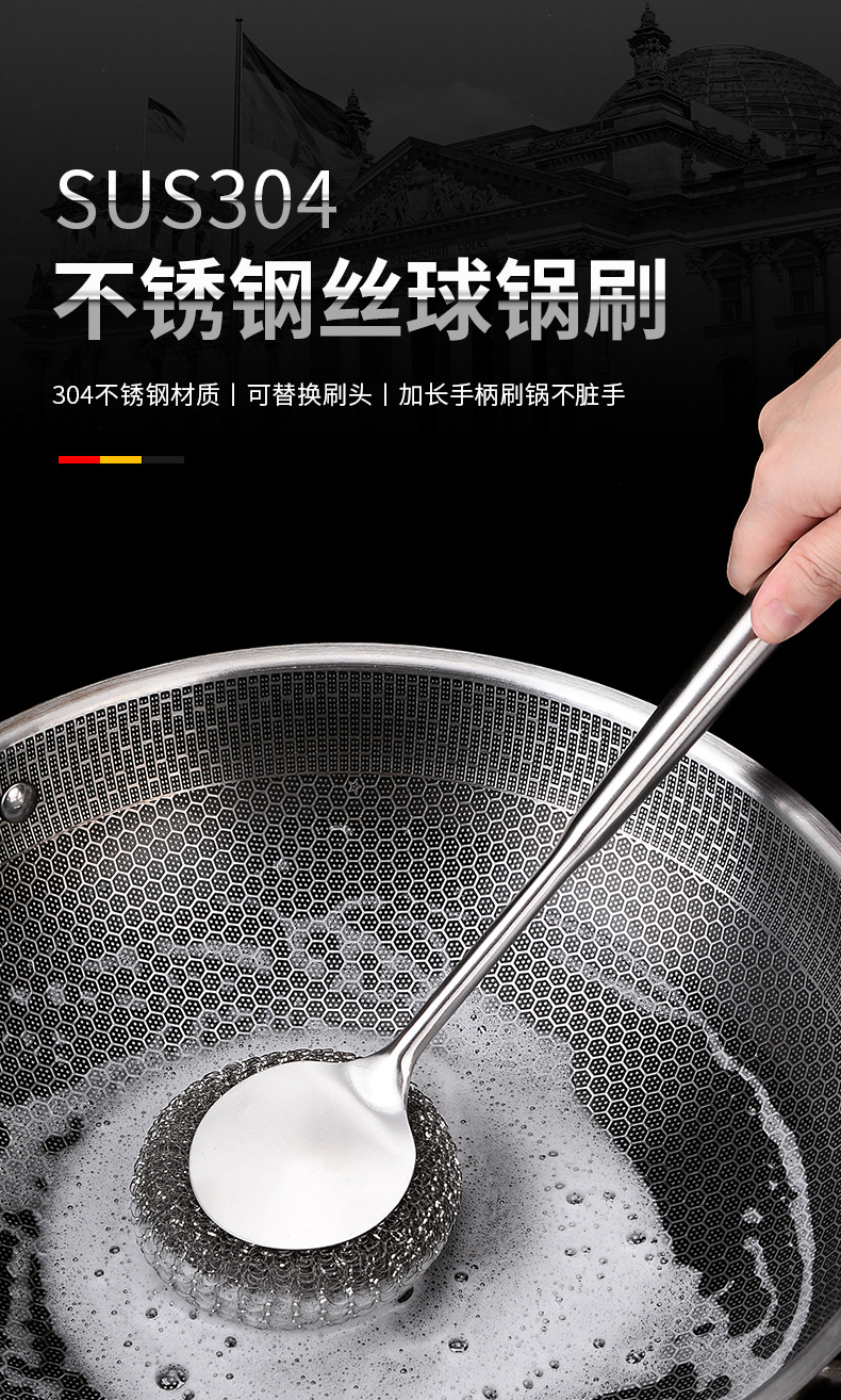 厂家304不锈钢锅刷神器厨房专用清洁刷长款锅刷可替换钢丝球锅刷