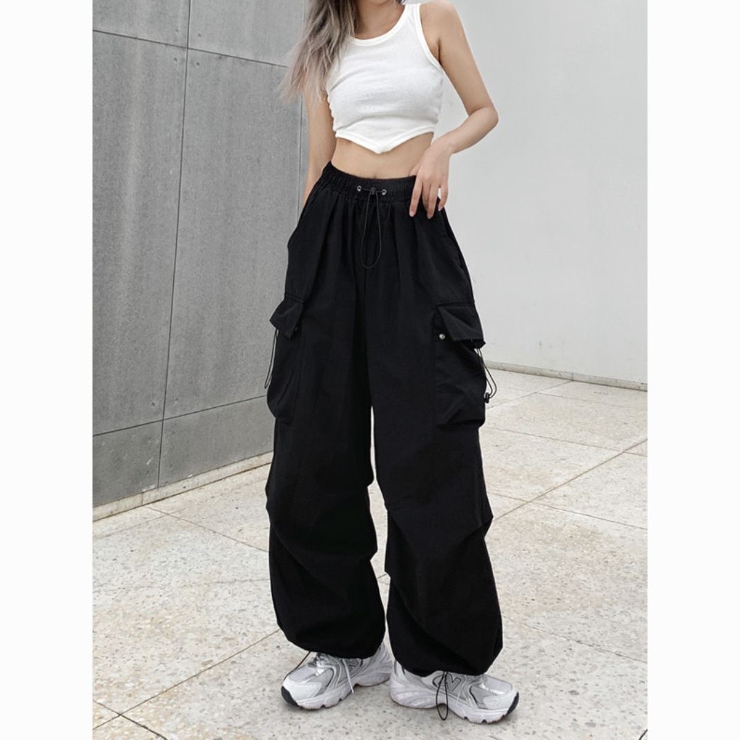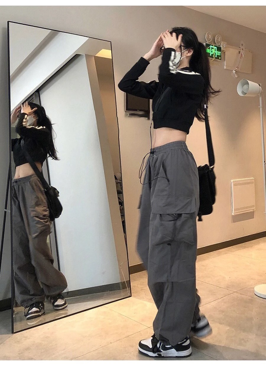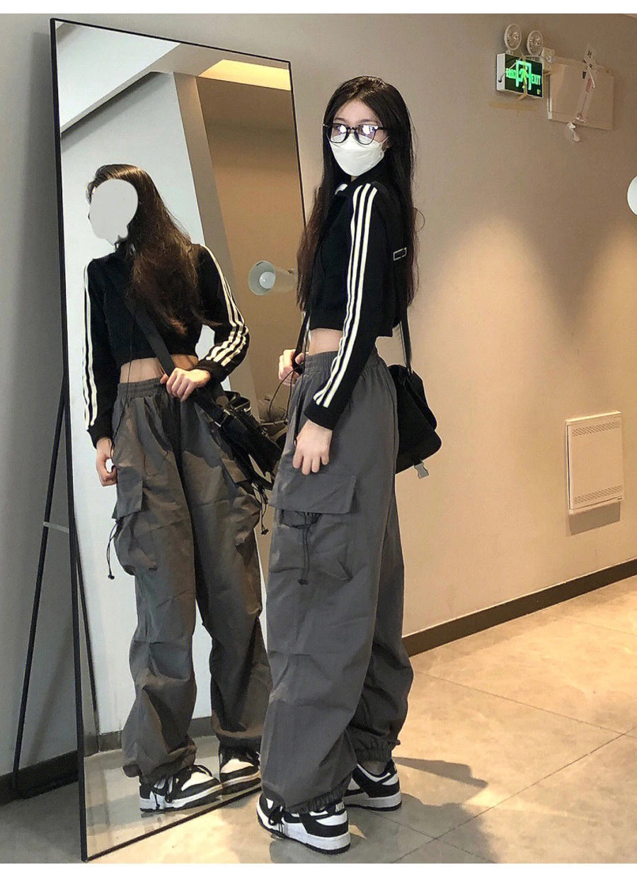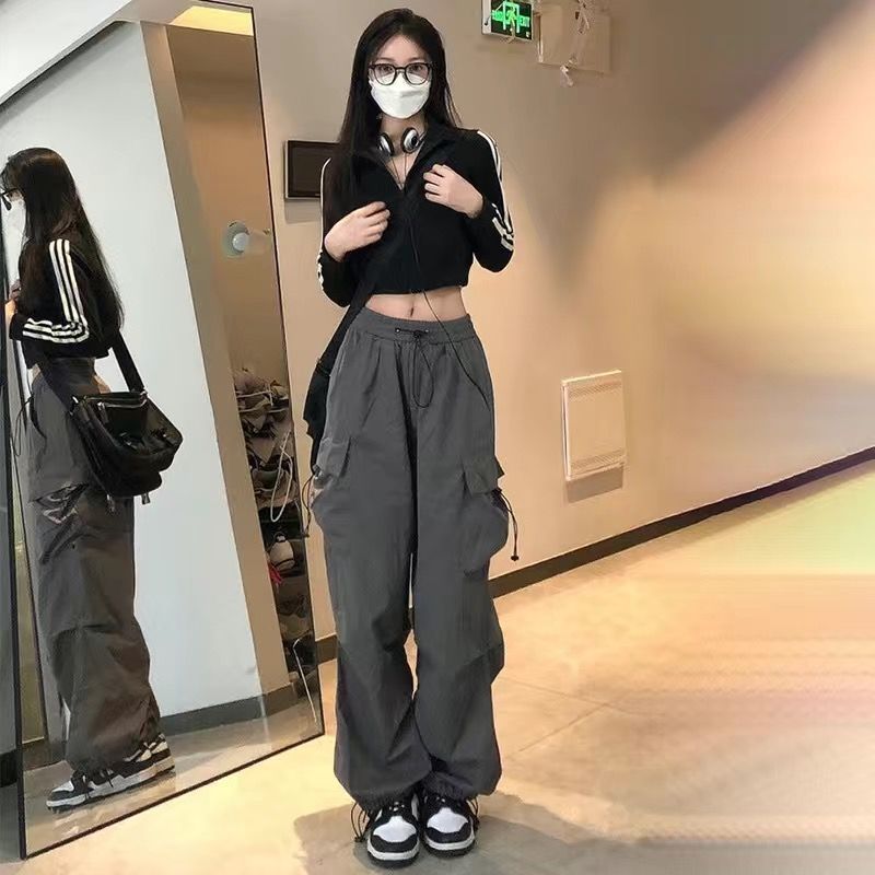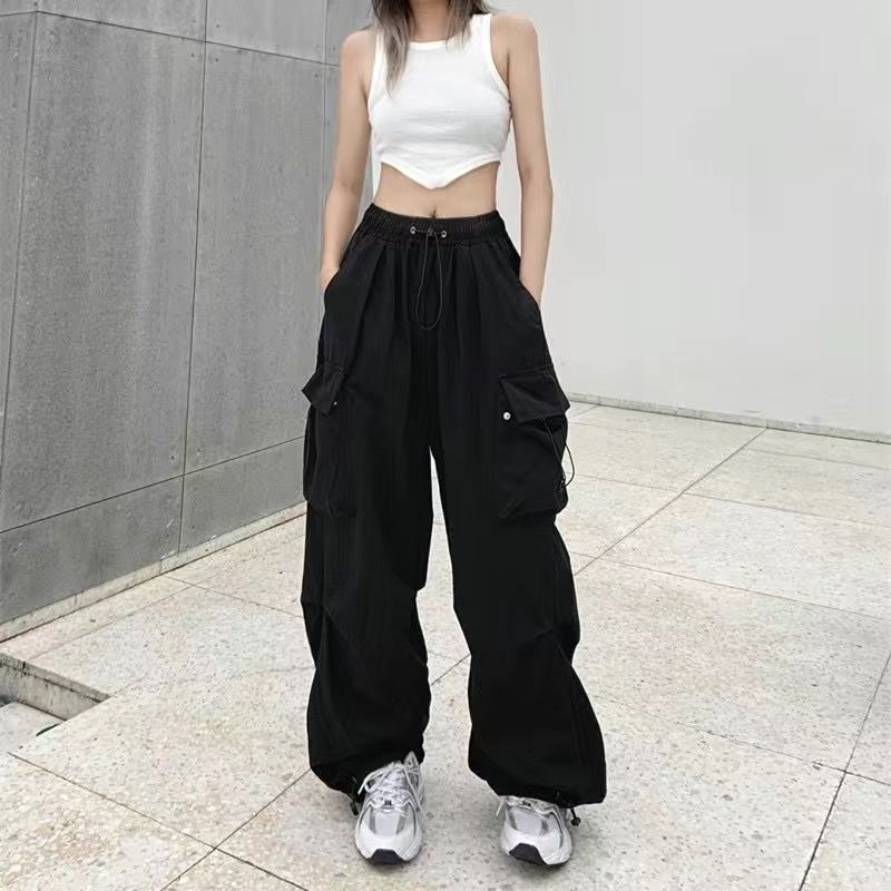 美式hiphop工装裤女夏薄款高腰束脚可调节2023新款休闲直筒运动裤