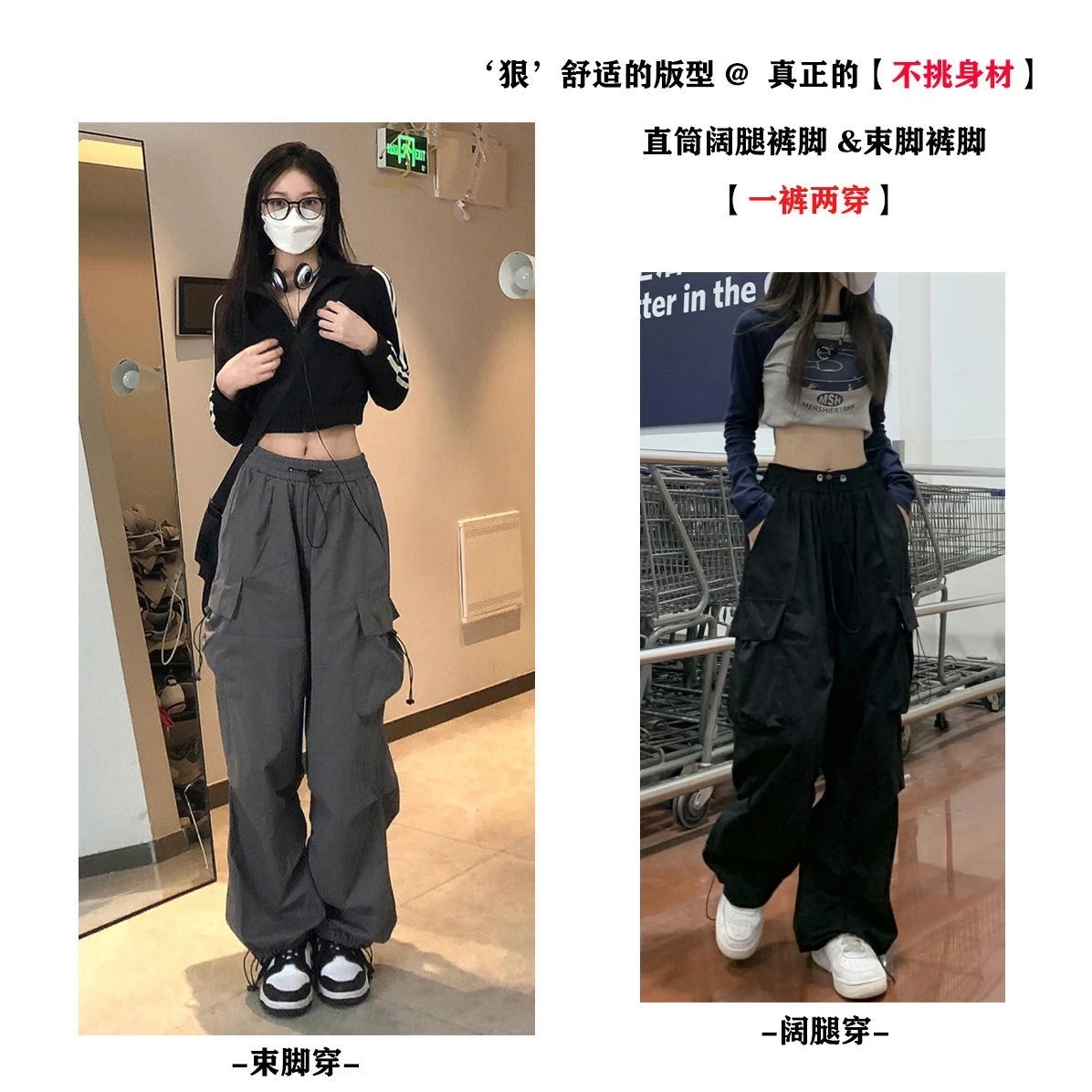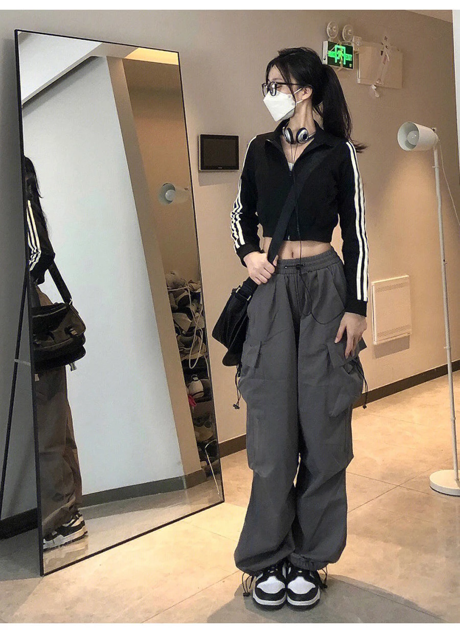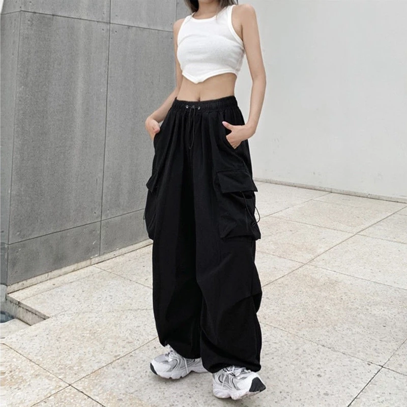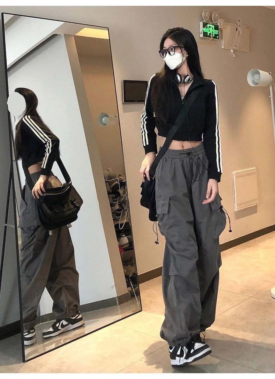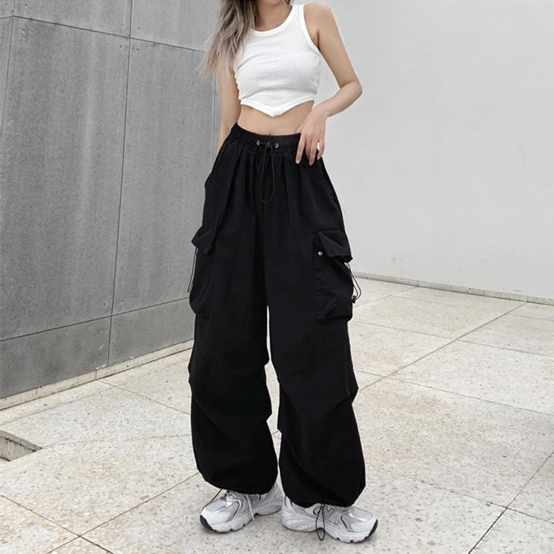 美式hiphop工装裤女夏薄款高腰束脚可调节2023新款休闲直筒运动裤