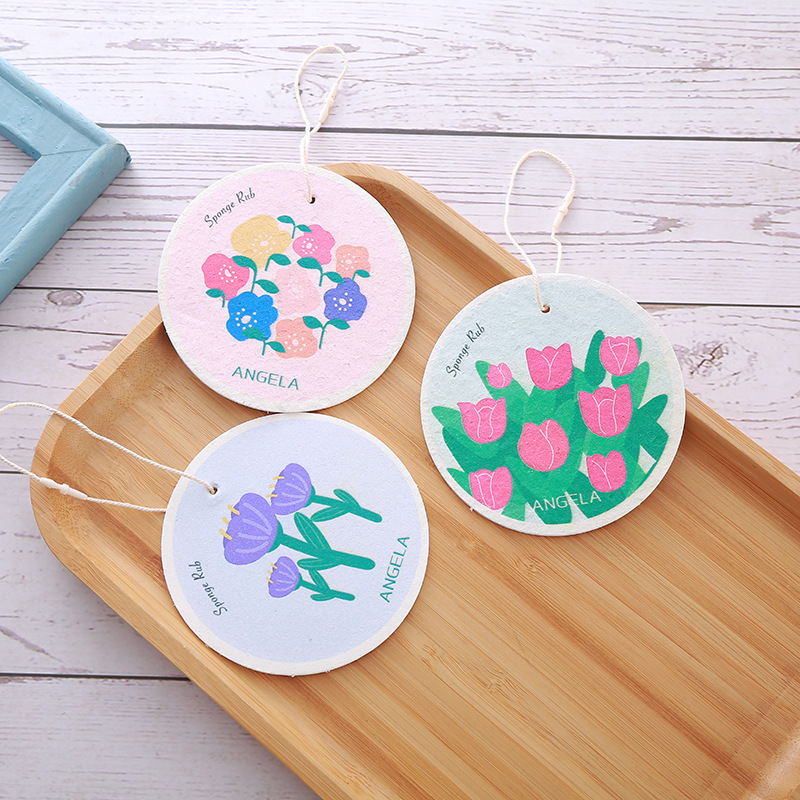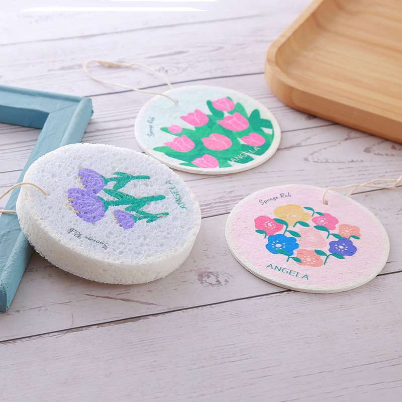 新款龙年压缩木浆棉花朵洗碗擦圆形海绵擦厨房清洁卡通图案木浆棉