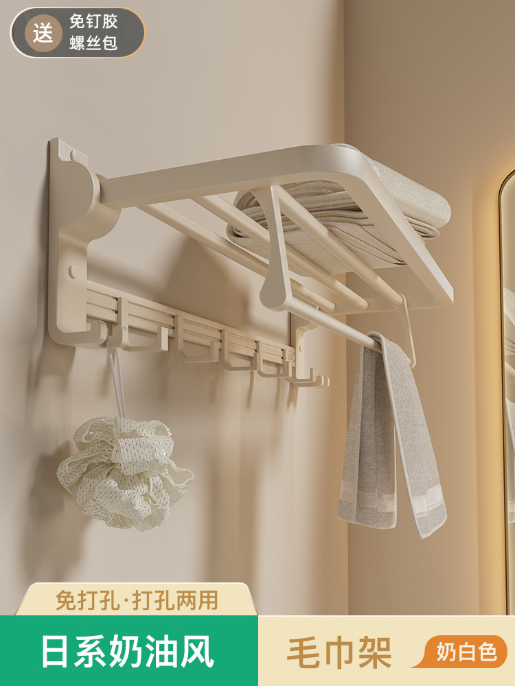 免打孔奶油风毛巾置物架卫生间奶白色浴巾架浴室卫浴五金挂件套装