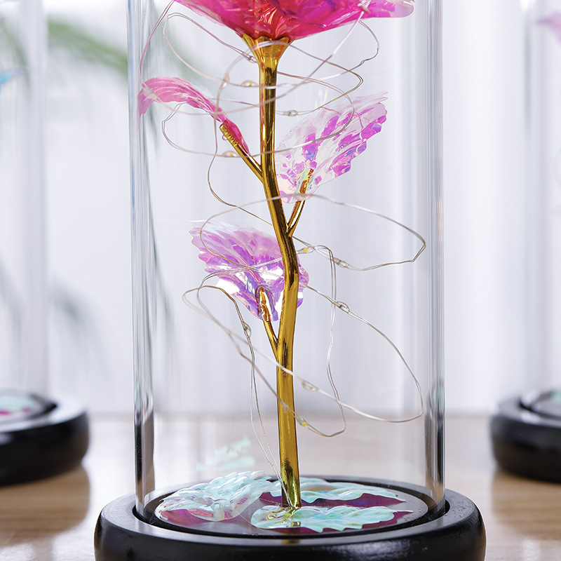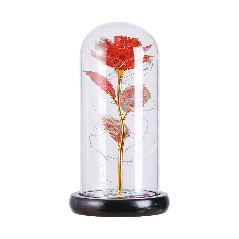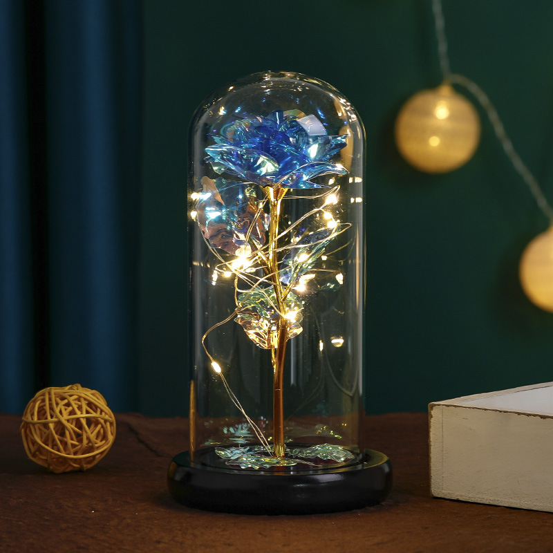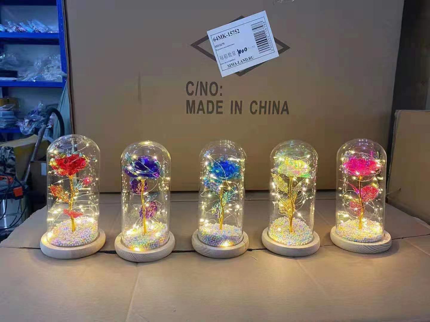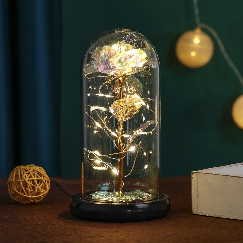 永生花玻璃罩跨境专供金箔花24K彩金玫瑰发光LED装饰礼品批发