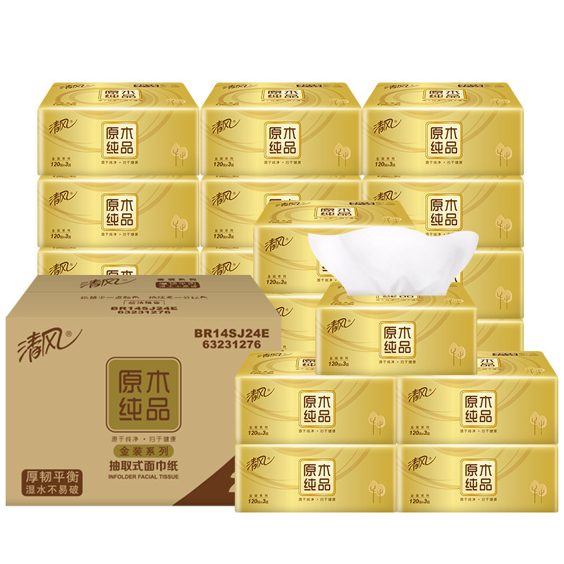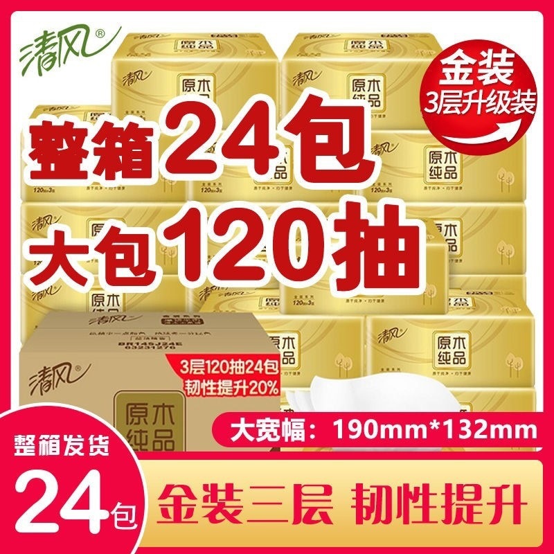 清风抽纸巾原木金装软抽120抽24包面巾纸家用抽纸实惠装箱装批发