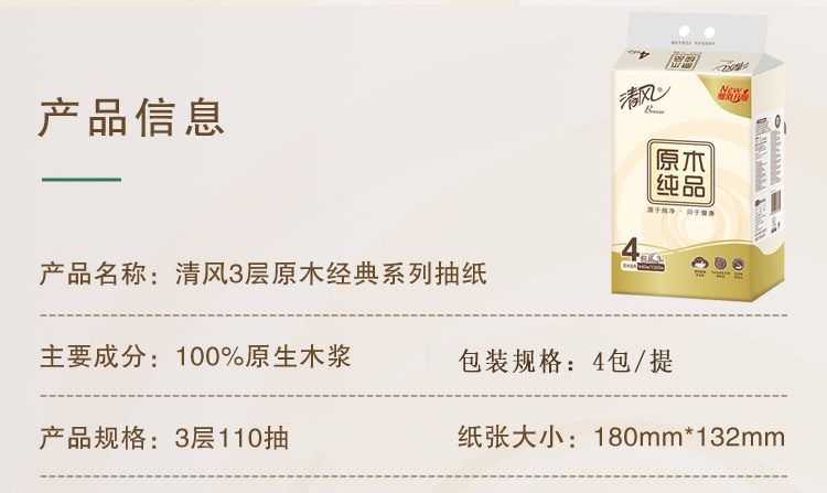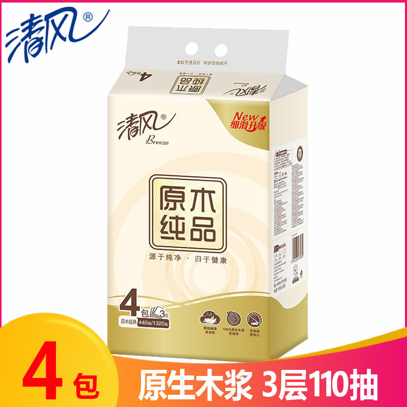 清风抽纸原木纯品软抽面巾纸餐巾纸家用商用实惠装3层110抽4包
