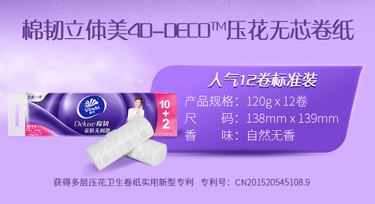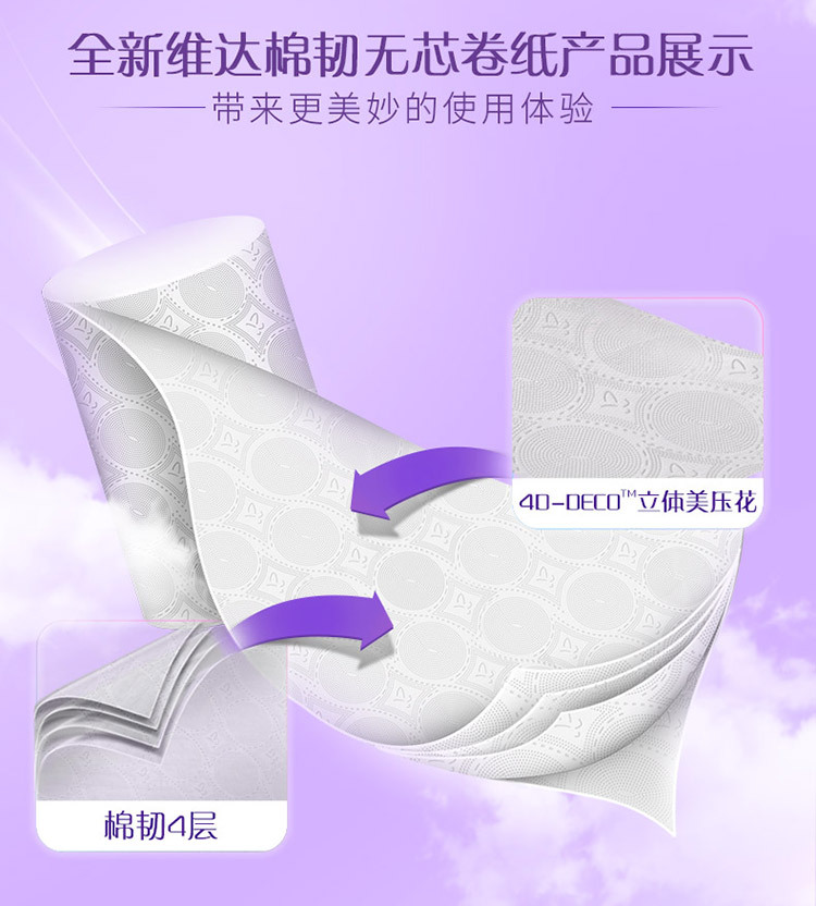 维达V4629卷纸120g*12卷4层长卷立体美无芯卫生纸压花纸巾厕纸