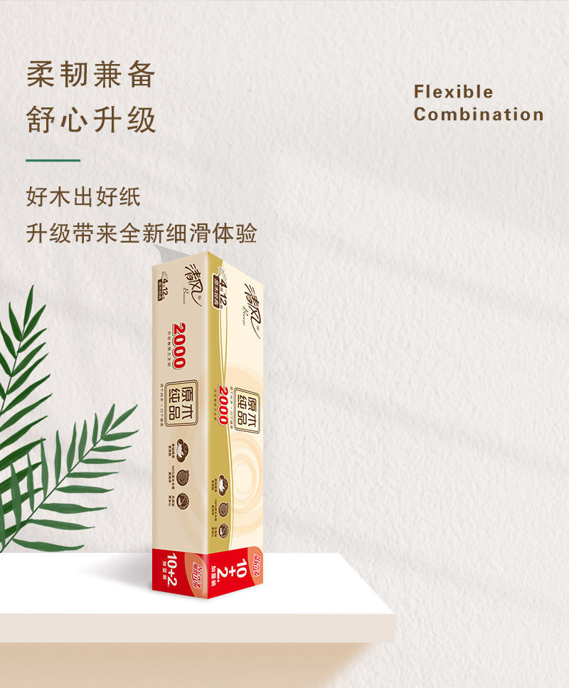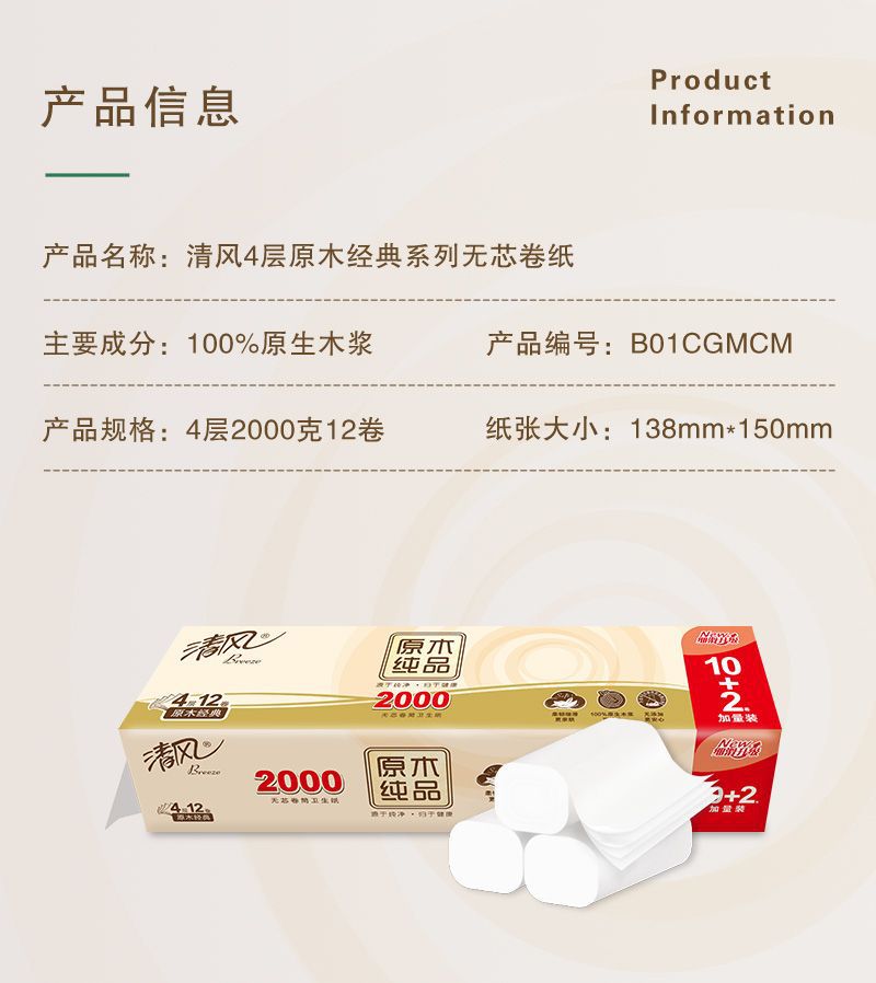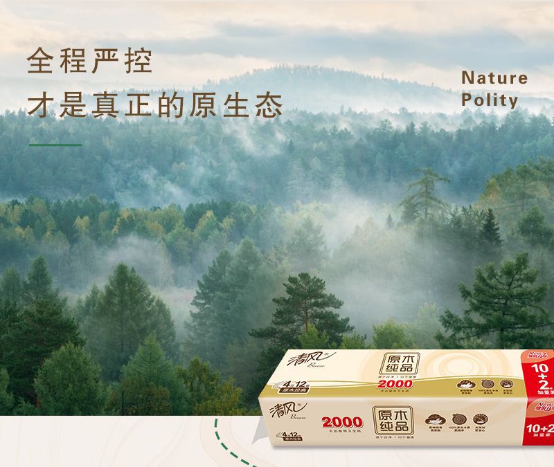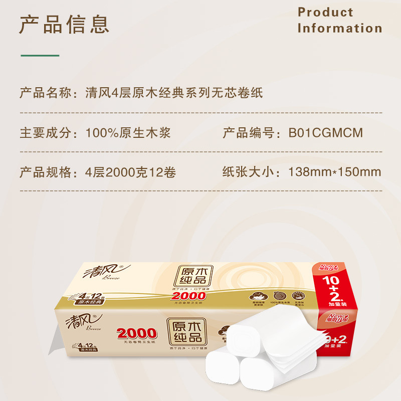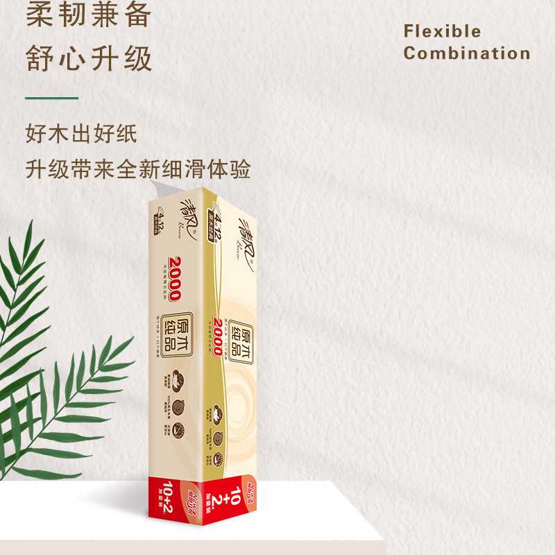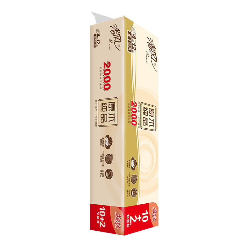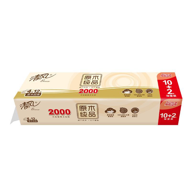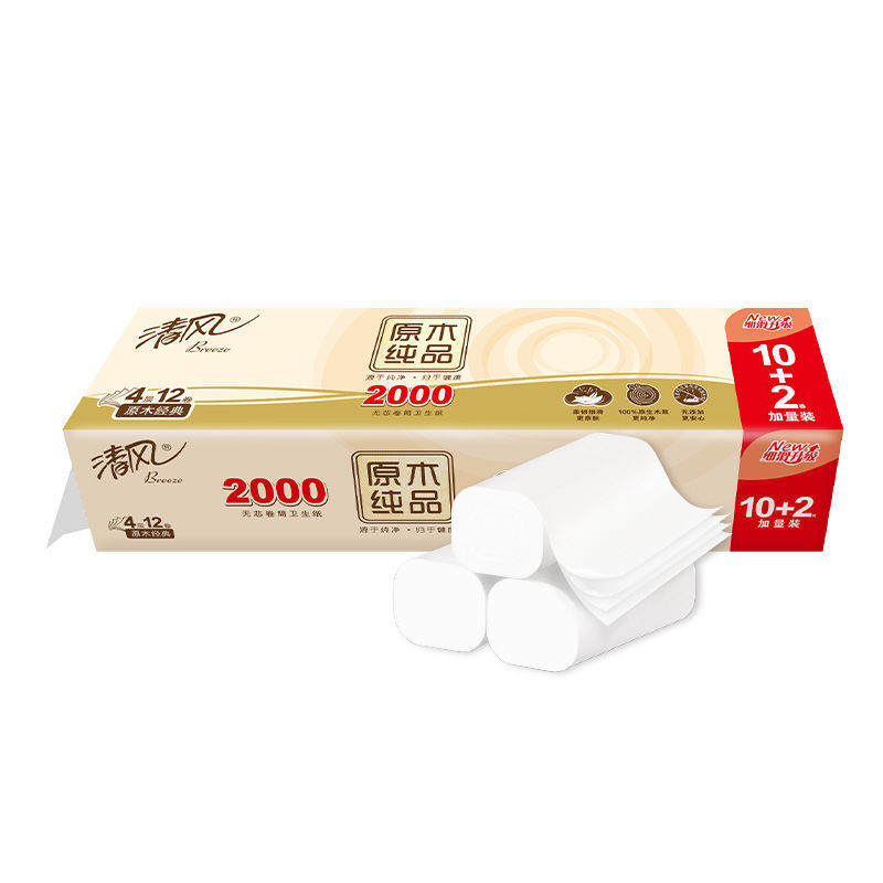 清风卷纸4层2000g无芯卷纸实心中长卷原木纯品家用批发卫生纸厕纸