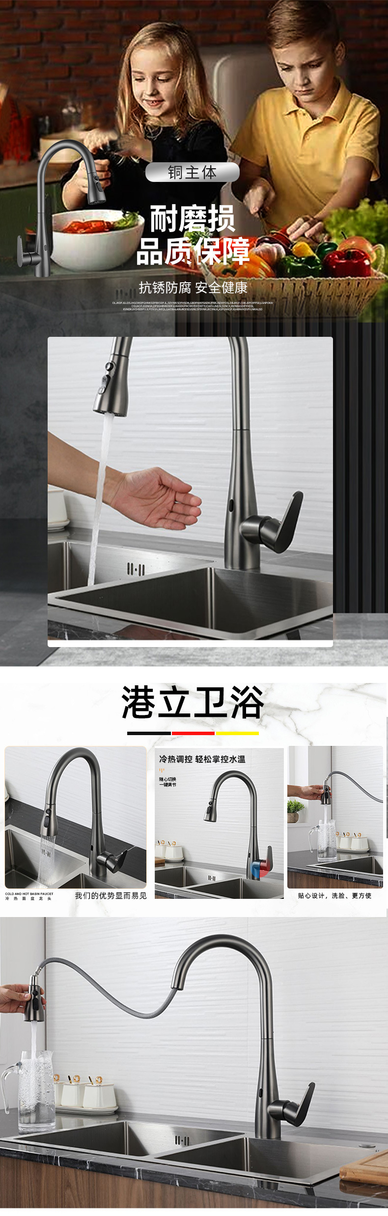 跨境德国 拉丝枪灰色智能感应厨房水龙头触控抽拉旋转带刮洗水槽