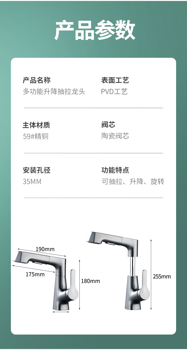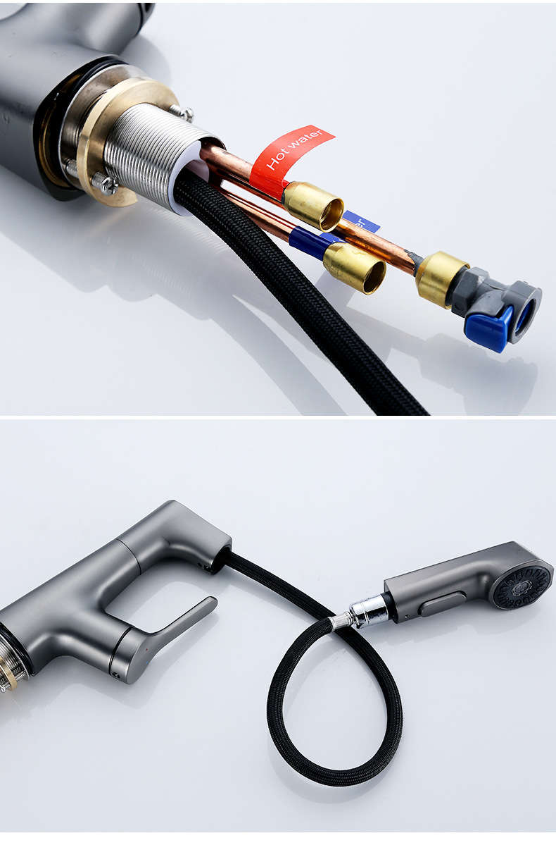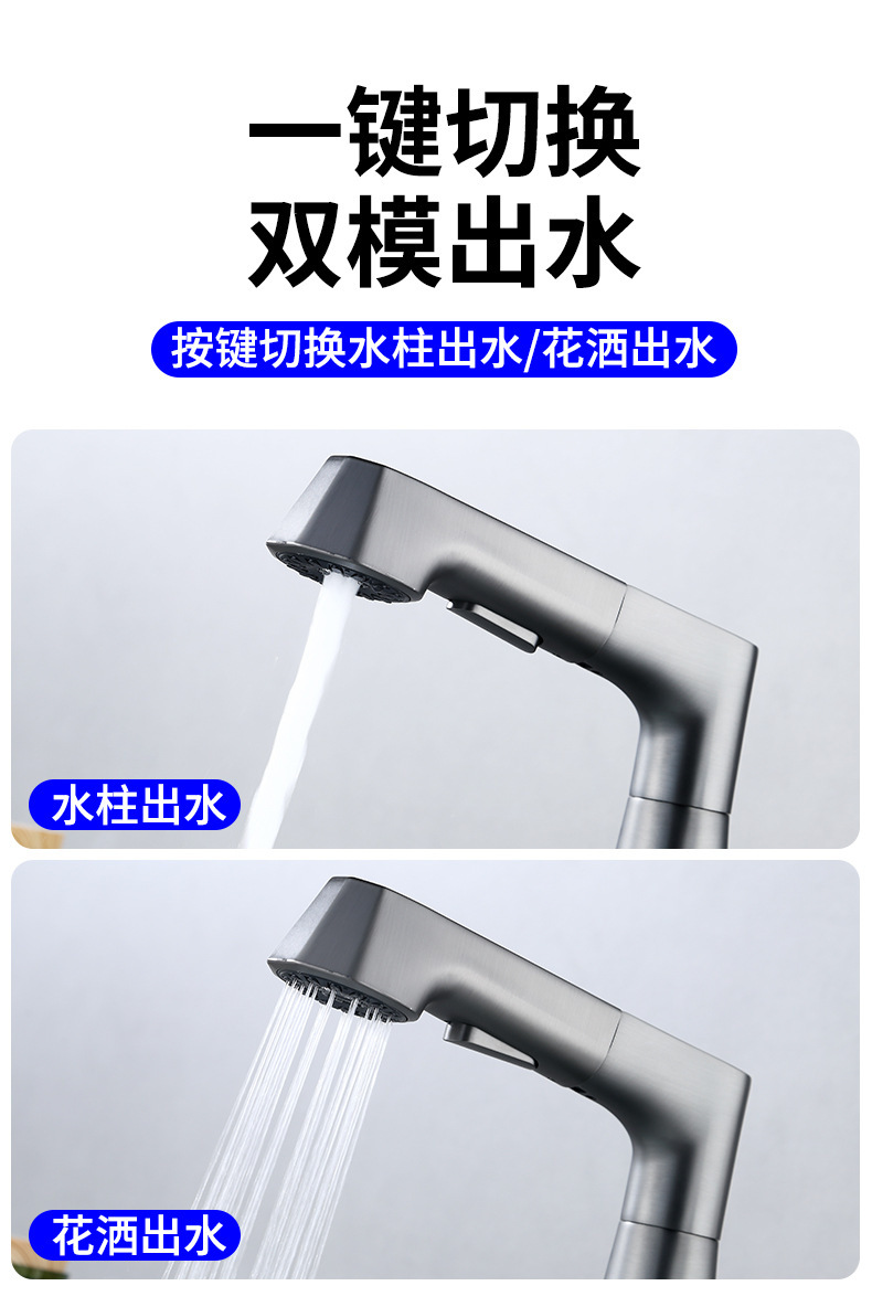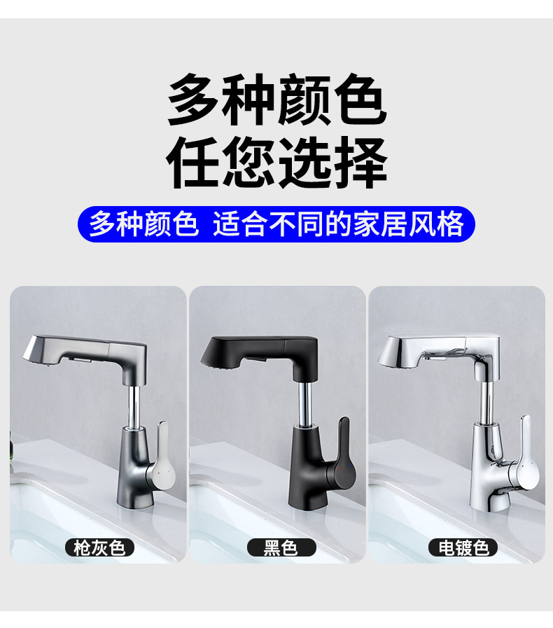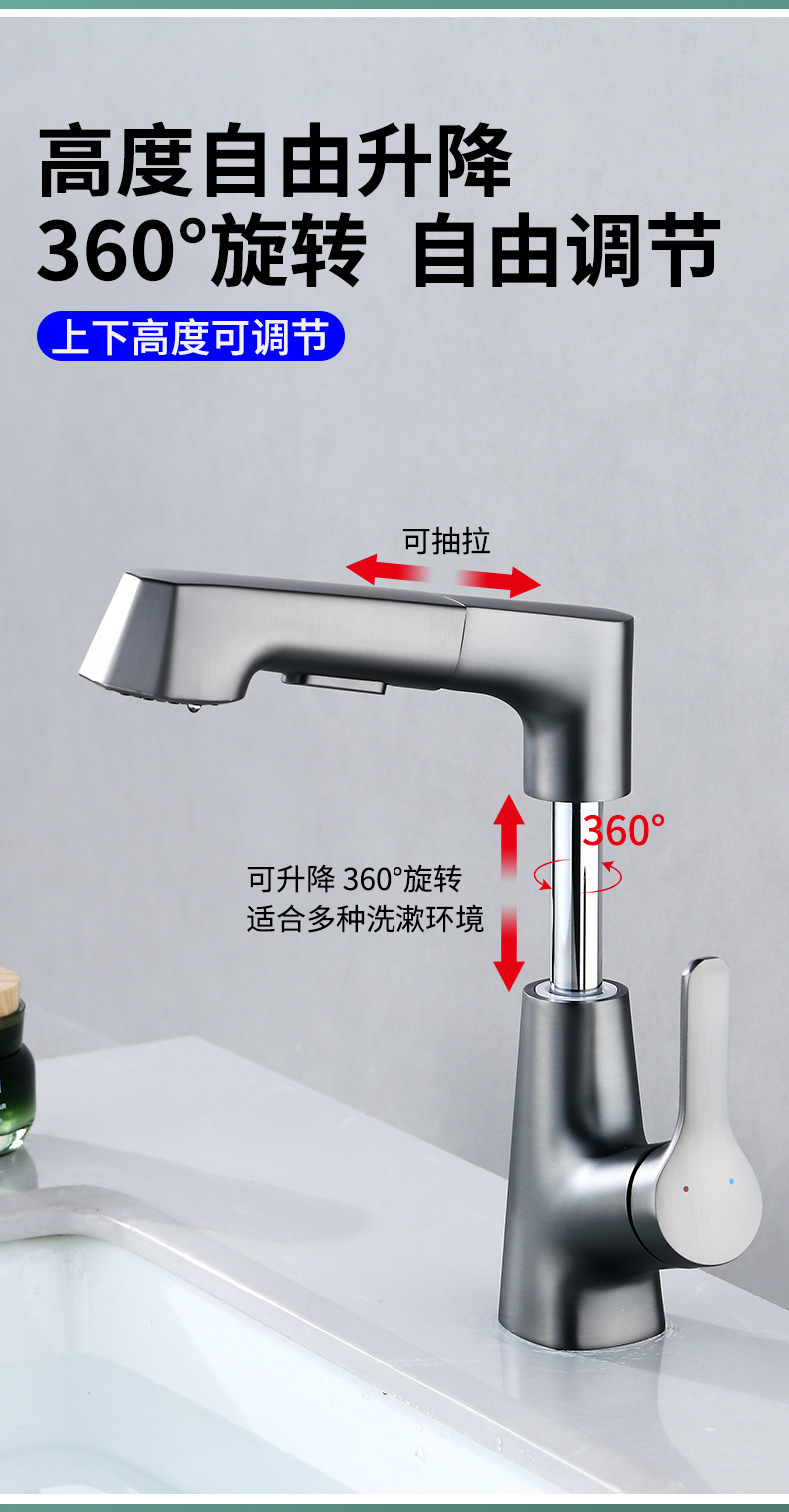 德国枪灰色升降抽拉式脸盆水龙头多功能面盆水龙头铜材质厂家批发