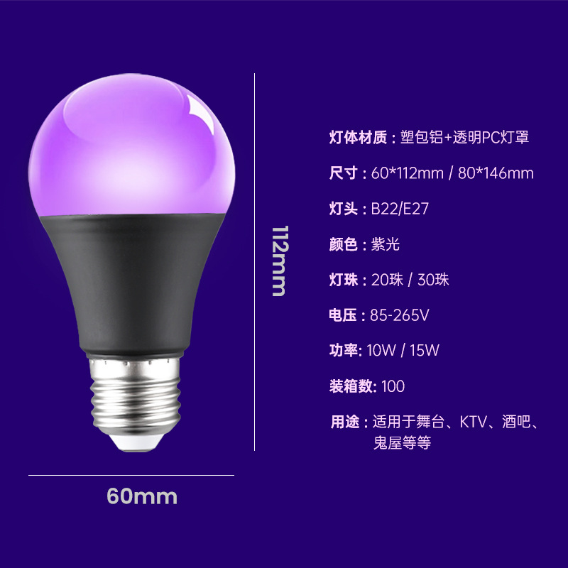 跨境供应A19黑色紫光UV球泡灯荧光氛围KTV酒吧LED场馆灯12W85-26V