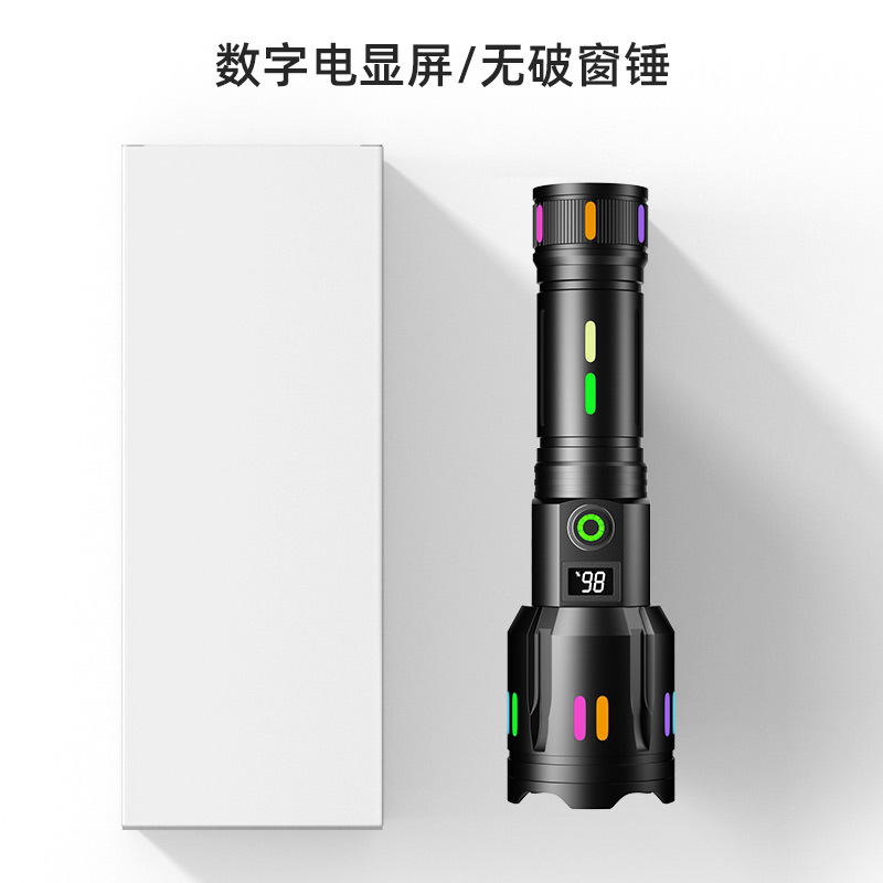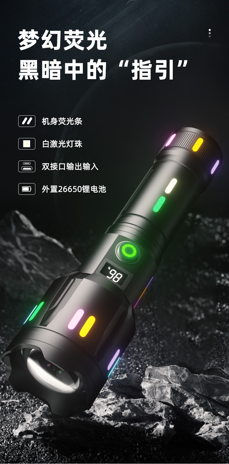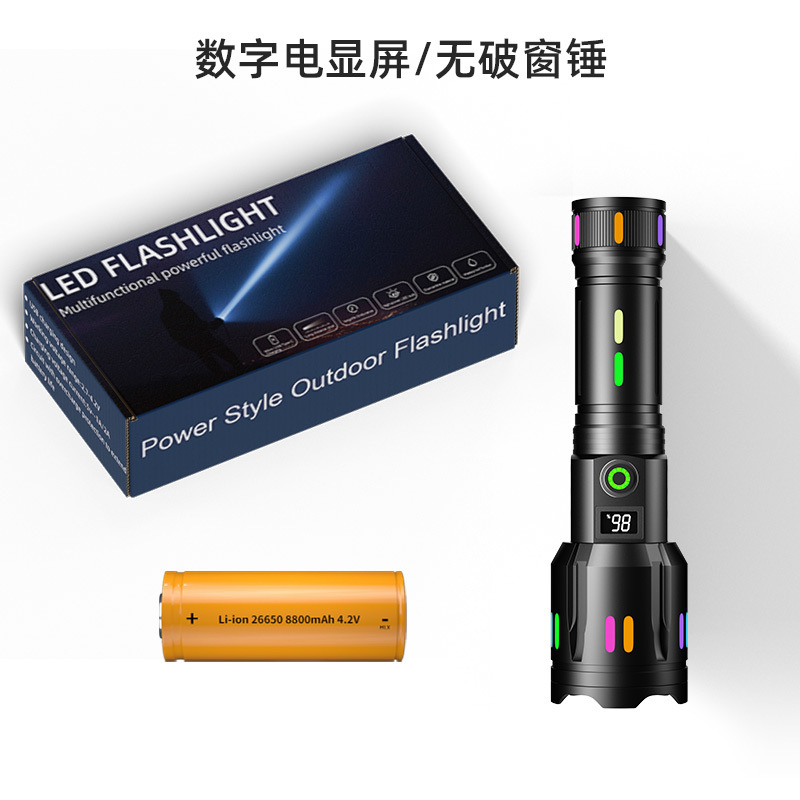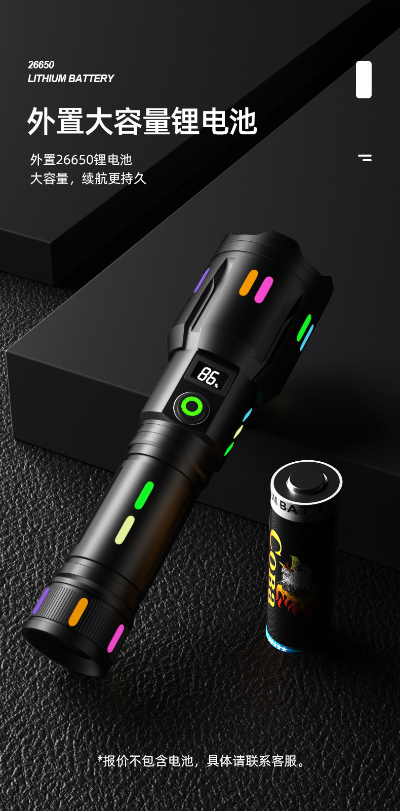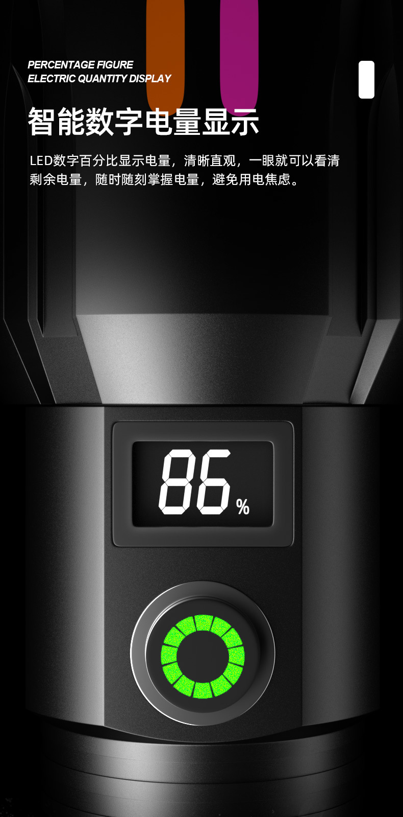 跨境户外强光远射手电筒充电数字电显荧光条尾锤变焦白激光手电