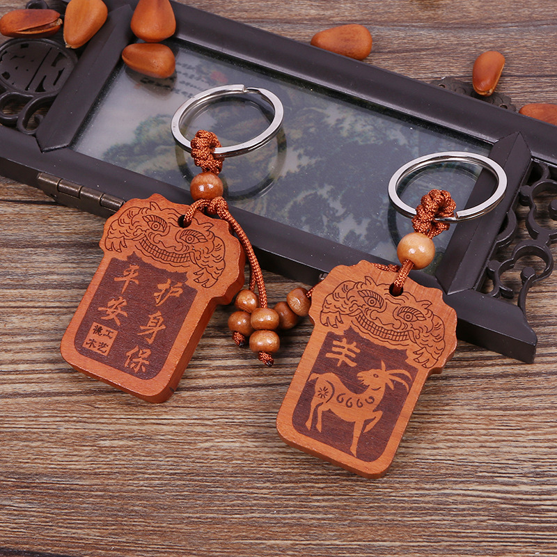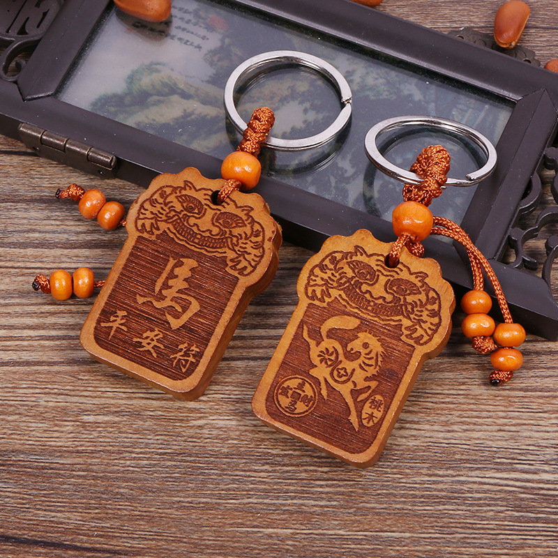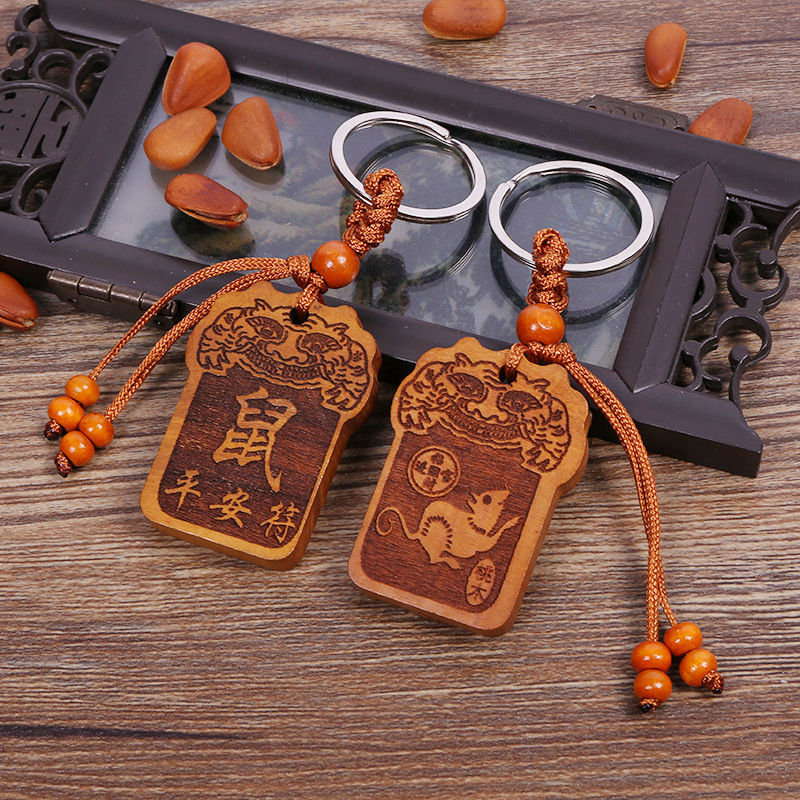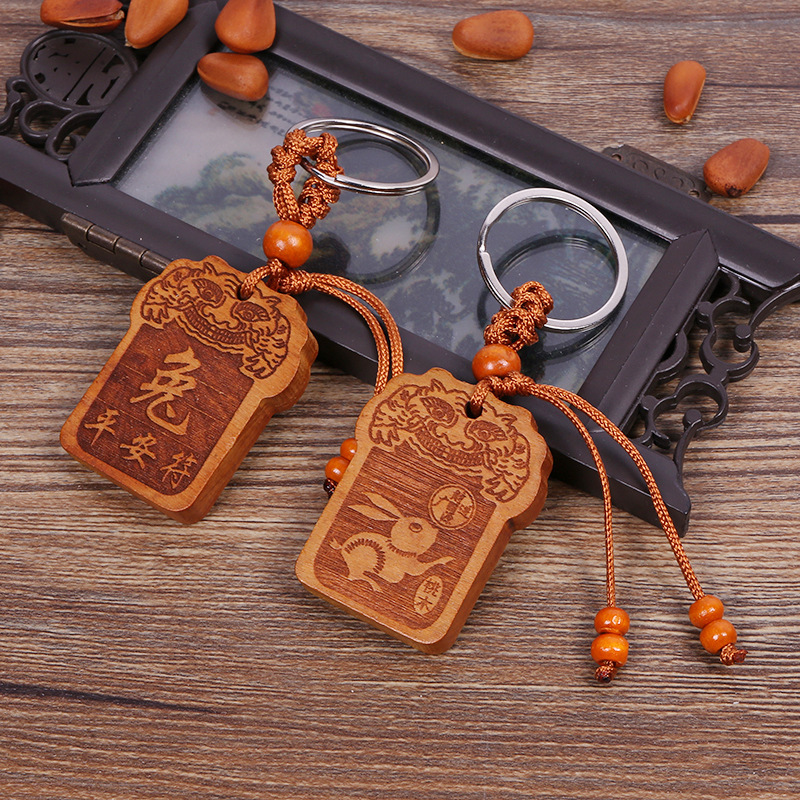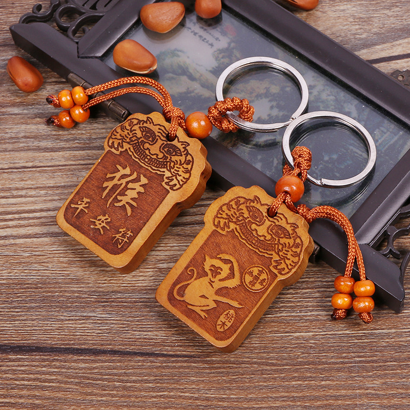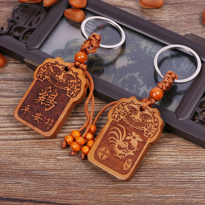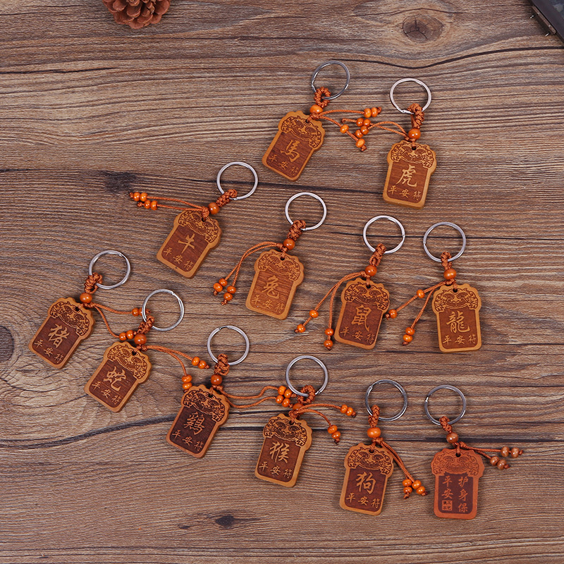 抖音地摊寺庙景区批发桃木十二生肖平安符钥匙扣复古木质钥匙扣