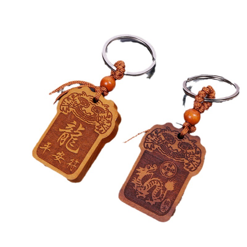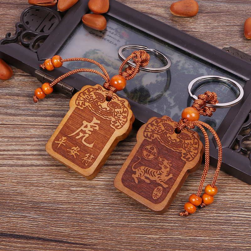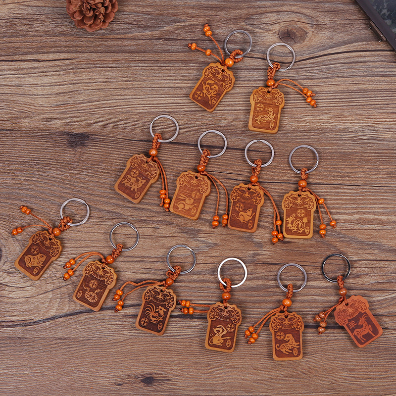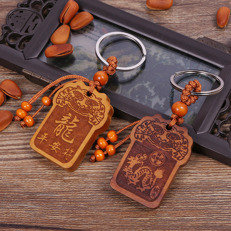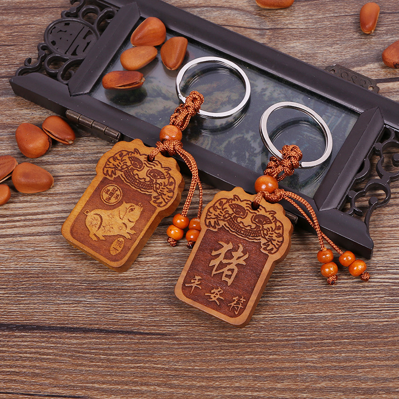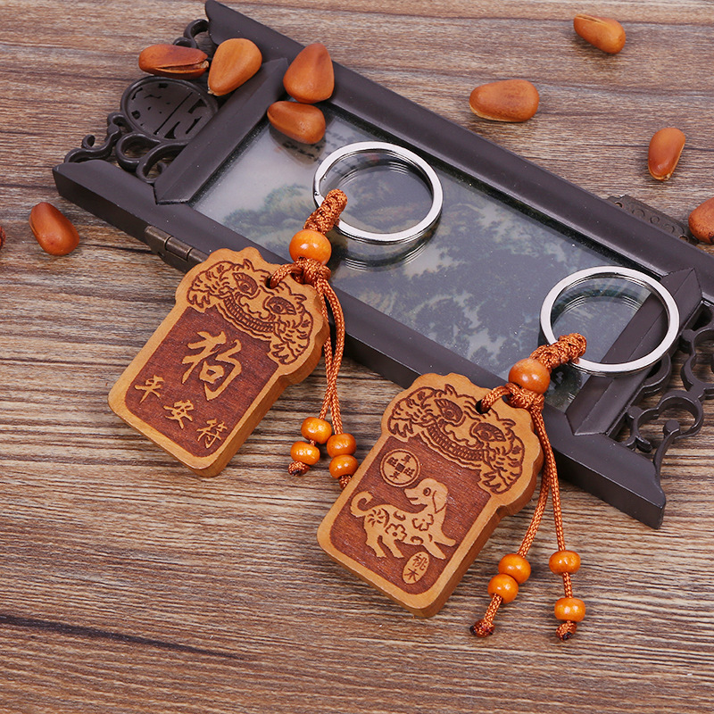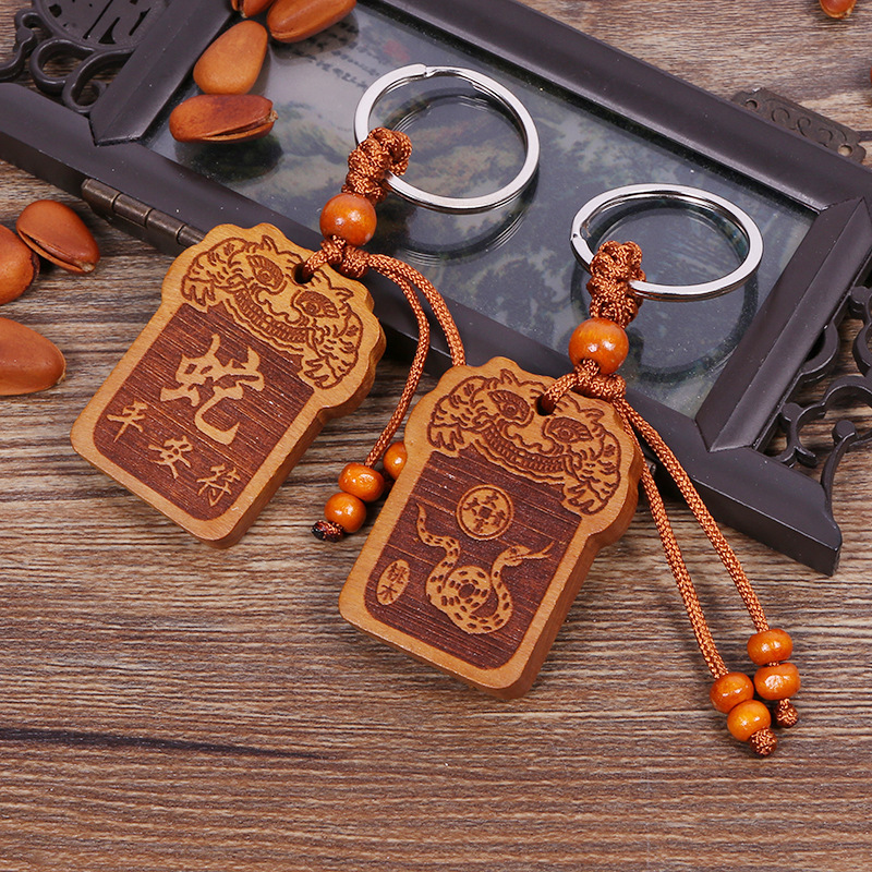 抖音地摊寺庙景区批发桃木十二生肖平安符钥匙扣复古木质钥匙扣