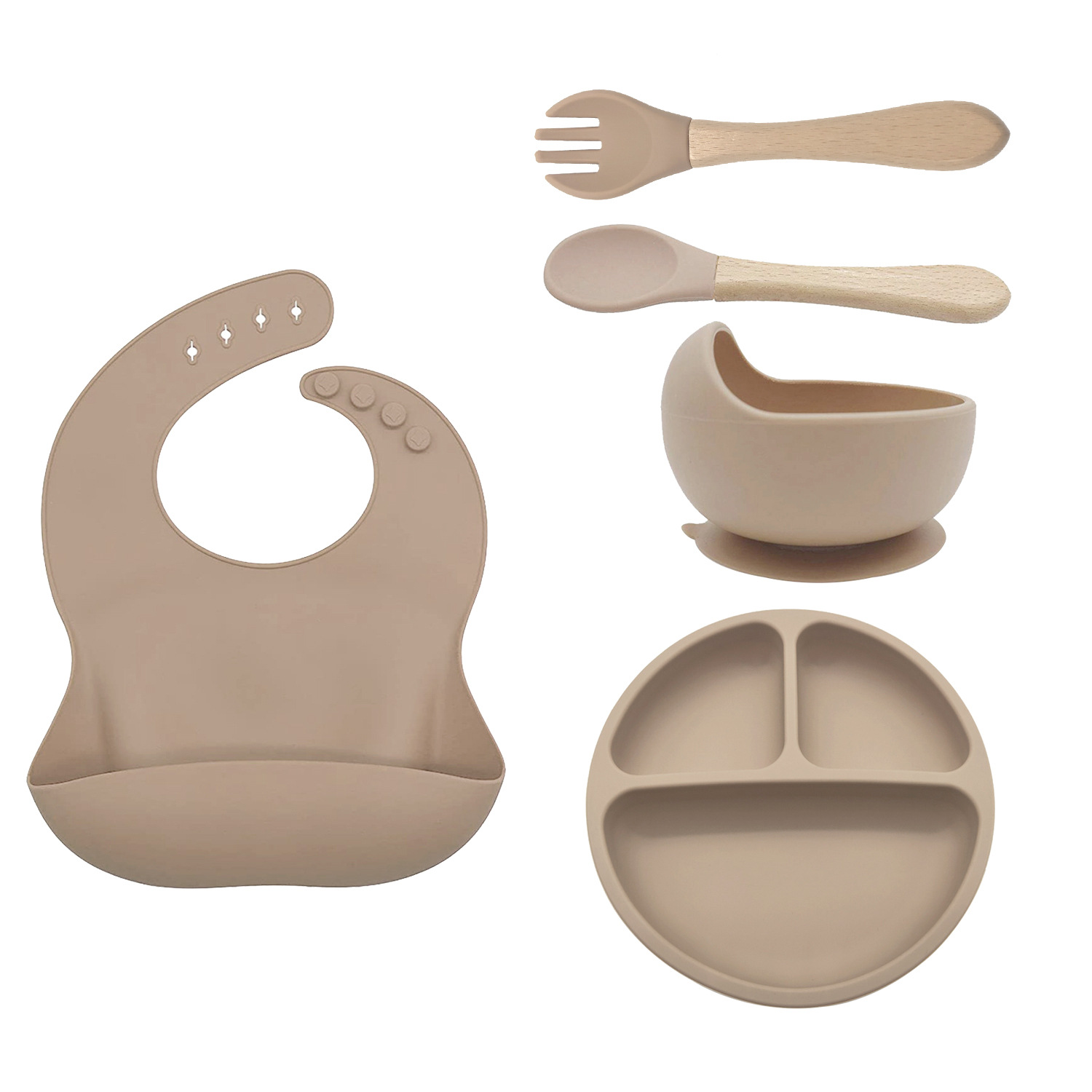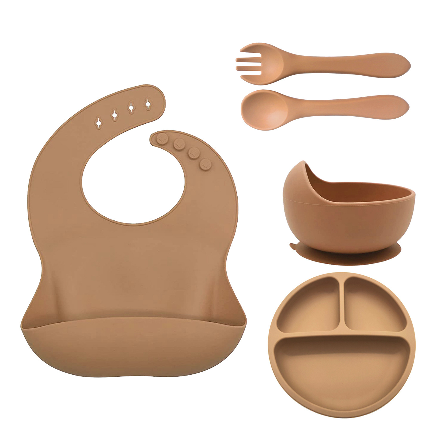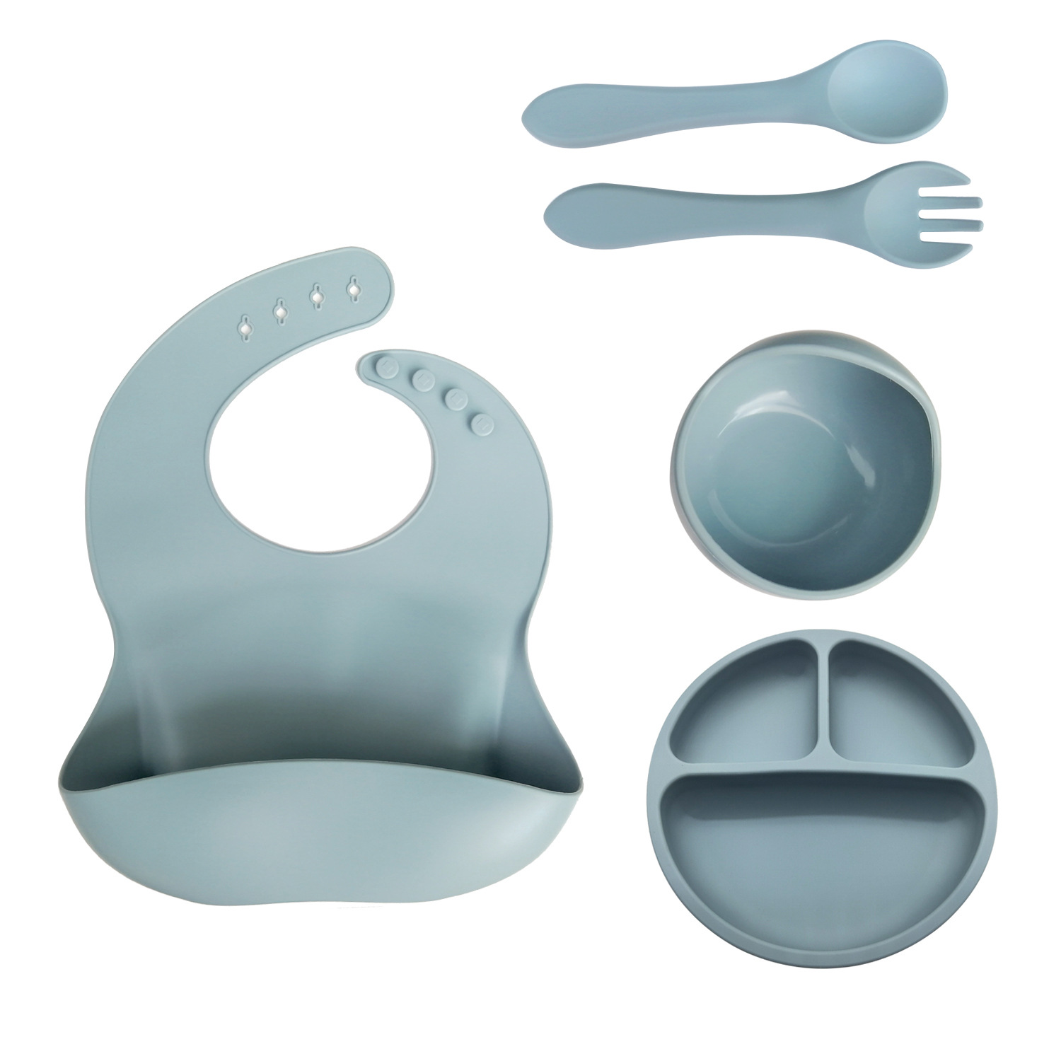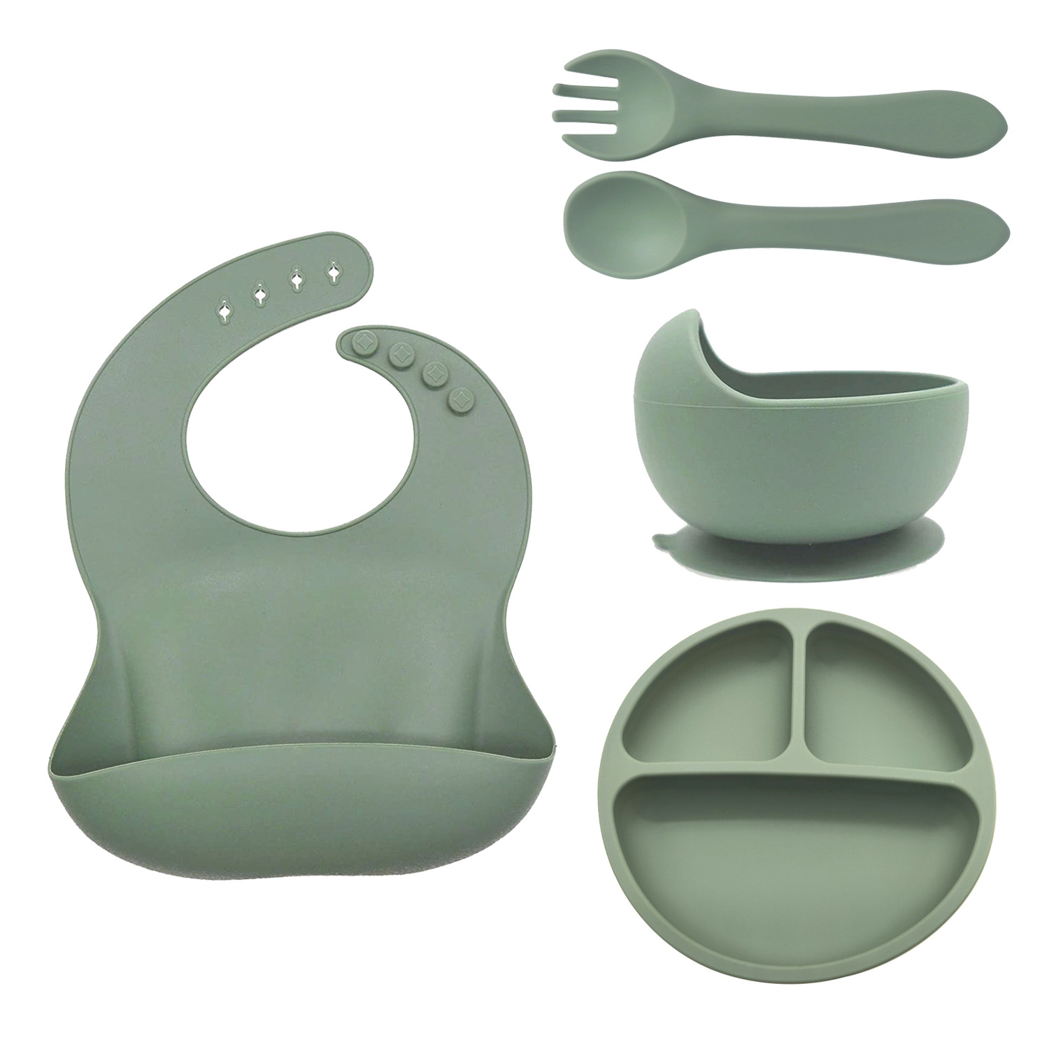 硅胶婴儿吸盘碗叉勺围兜套装5件套 硅胶宝宝辅食碗 硅胶分格餐盘