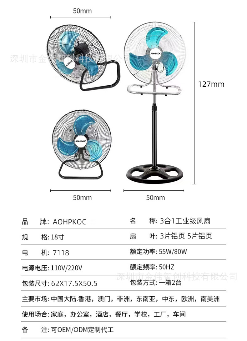 厂家直销18寸立式电风扇三合一落地扇工业风扇摇头大功率外贸跨境