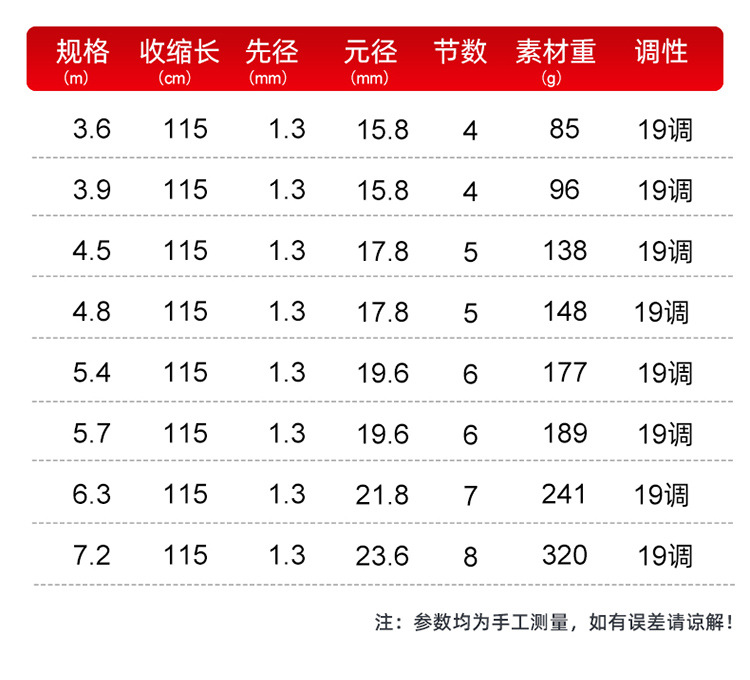 | 7.2 m + rod slightly(7.2米+竿稍) | USD $13.22 | 626 piece available |