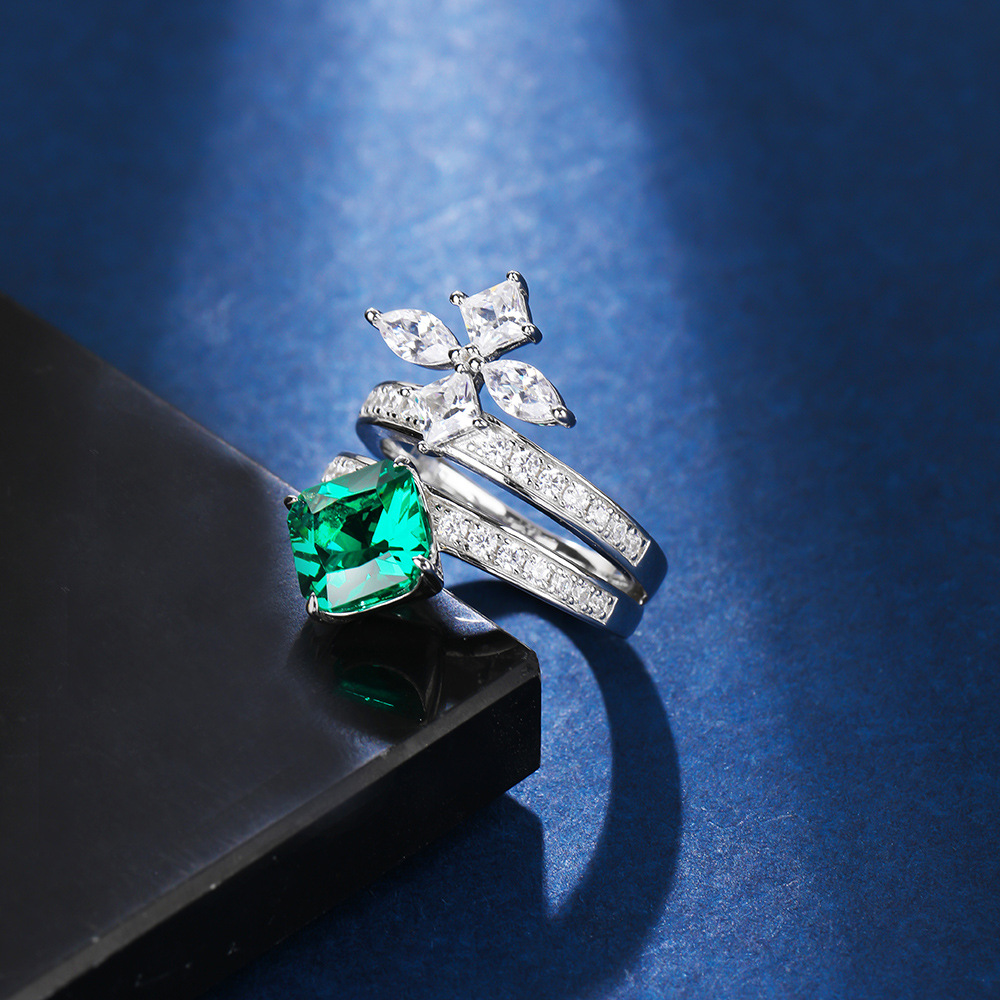 纯银戒指绿宝石设计款女s925银镶嵌锆石高碳钻冰花切气质款银手饰