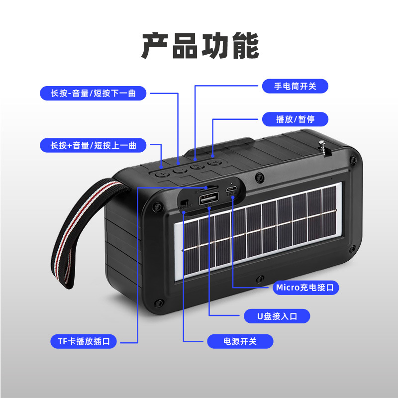 9.支持的功能:USB/TF/FM/BT//TWS/LED/Solar Energy