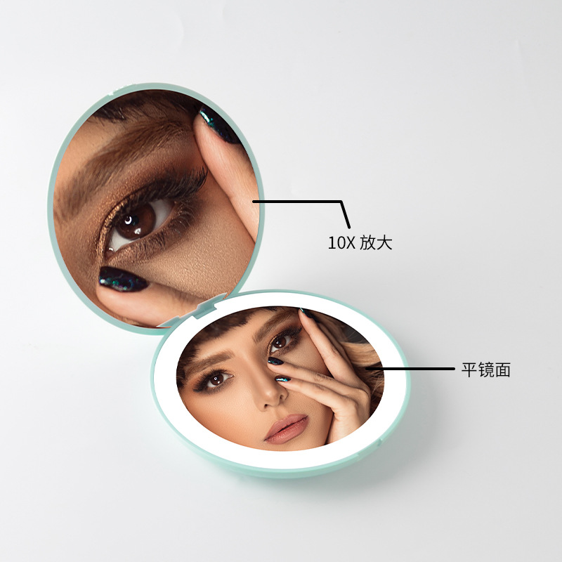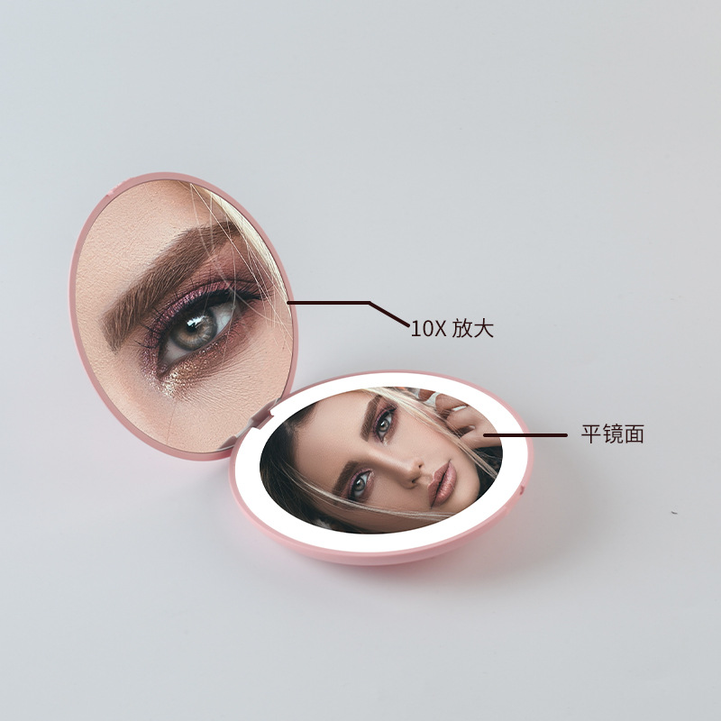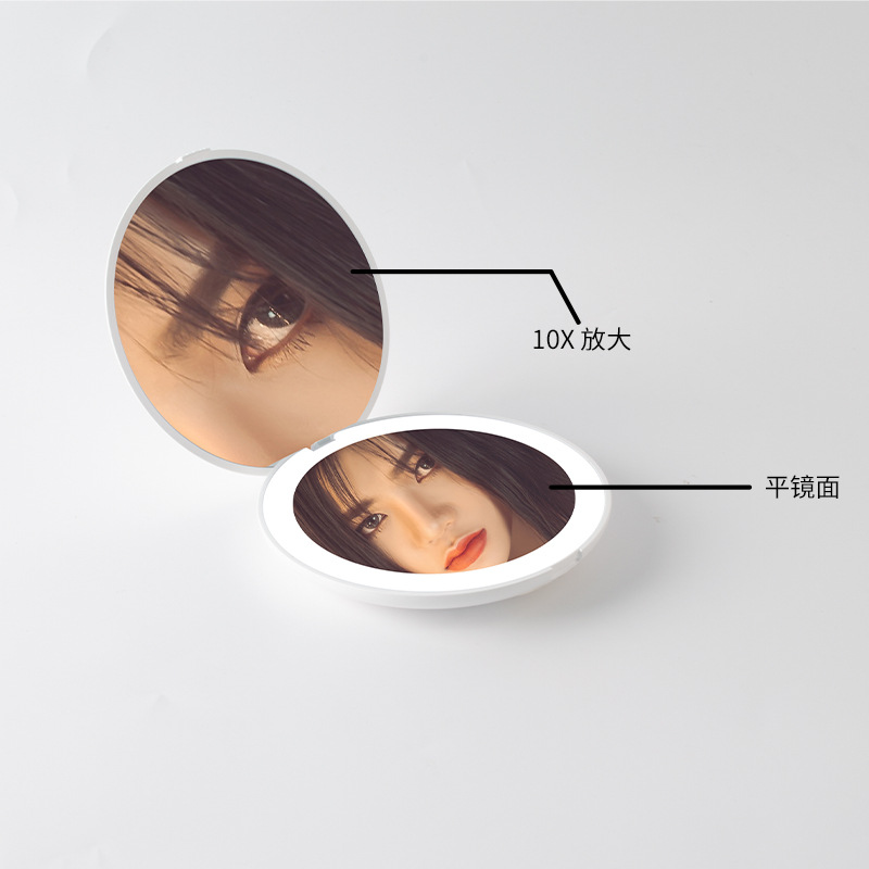 跨境折叠led化妆镜带灯礼品小巧圆形美妆镜双面2X放大手持镜热销