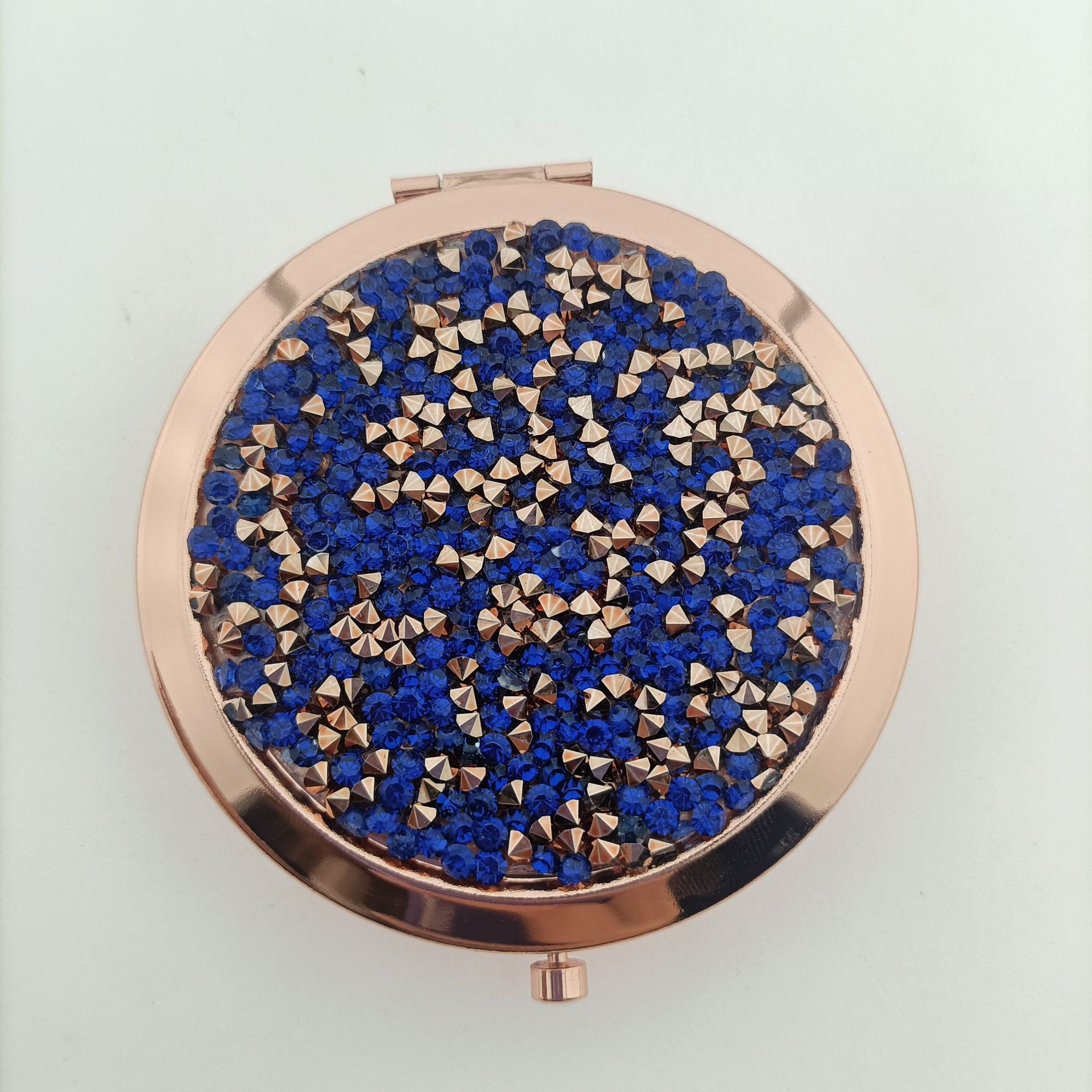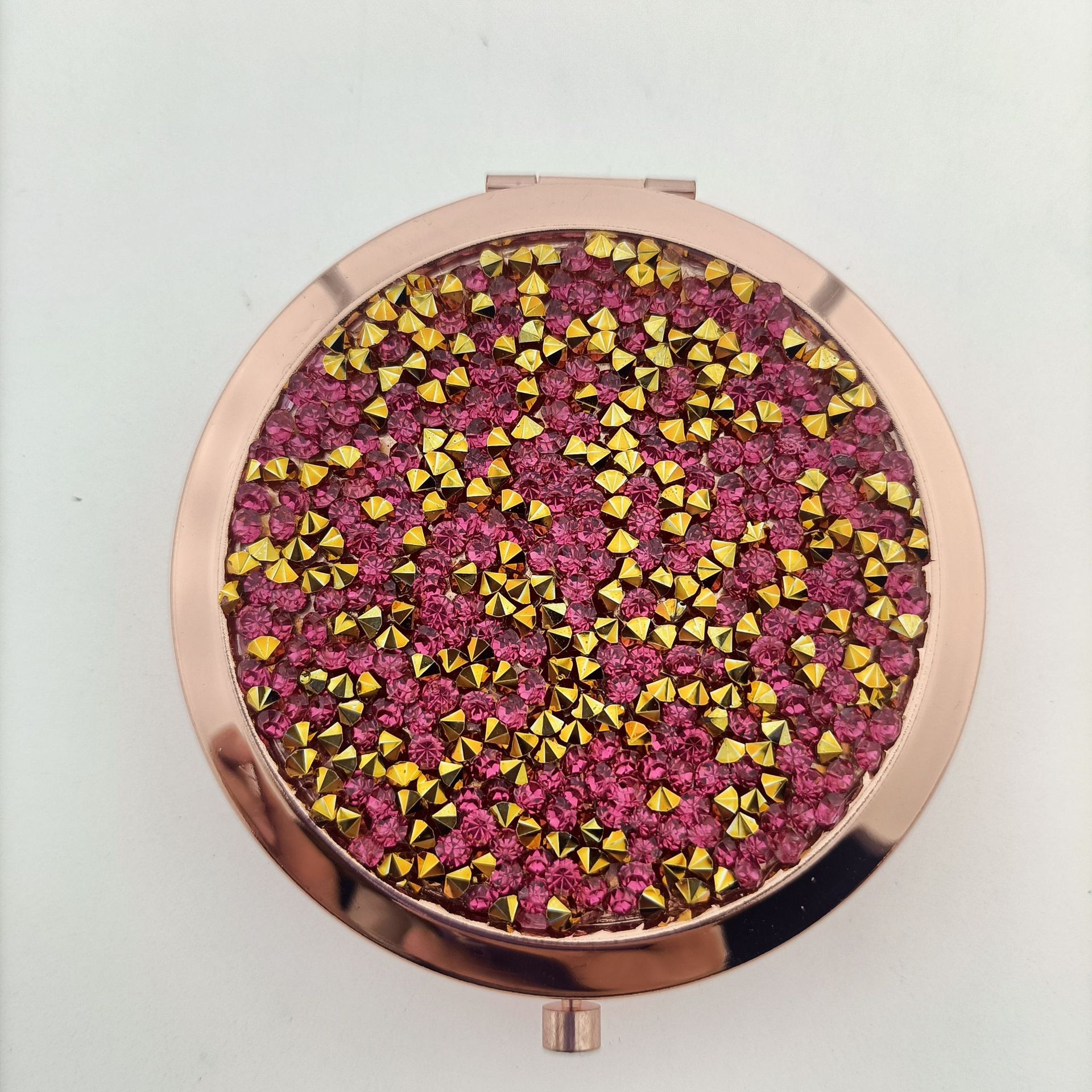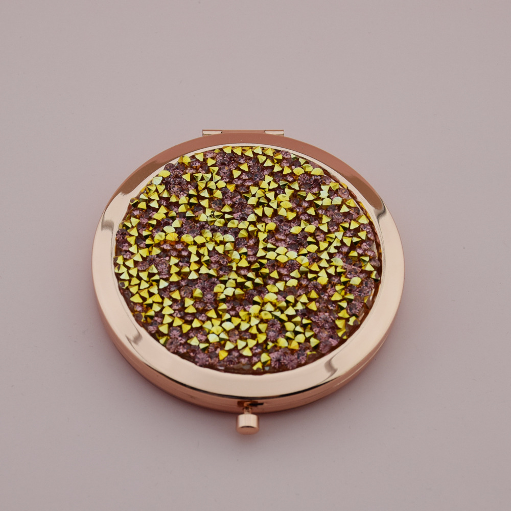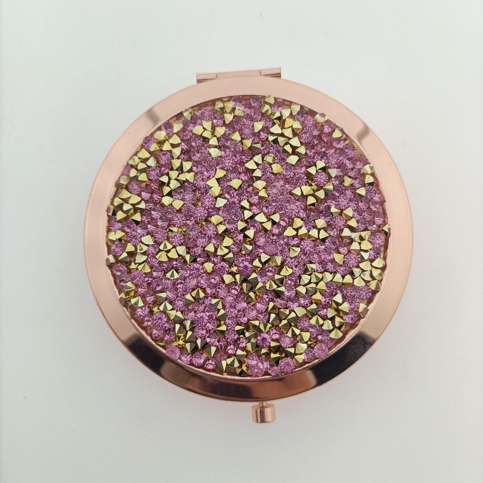 水晶贴钻圆形双面镜便携式迷你口袋镜70按扣金色玫瑰金银色小镜子