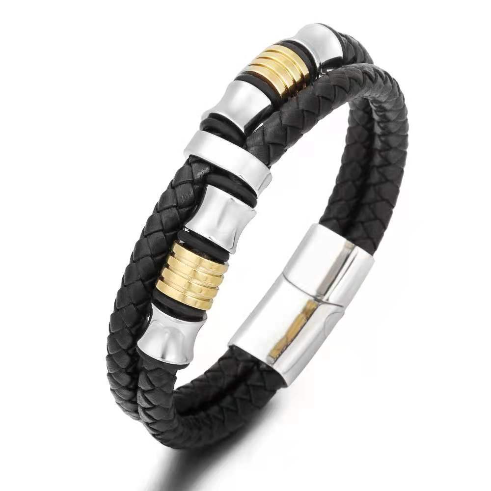 跨境热销钛钢真皮编织手链个性男士不锈钢枪黑磁铁扣手镯手饰批发