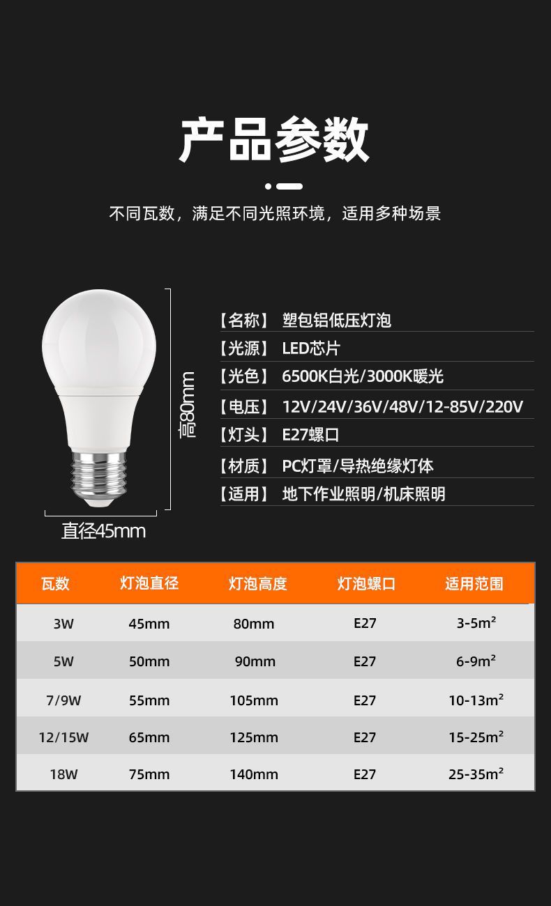 12V24V36伏led低压灯泡E27防水AC交直流冷库机床工地渔船节能灯