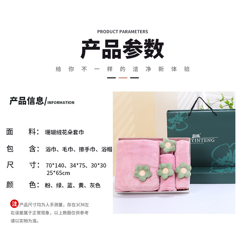 | gift box four-piece set (towel + bath towel + hair-drying cap + hand towel)(礼盒四件套(毛巾+浴巾+干发帽+擦手巾)) | USD $0.0 | 6636 piece available |
