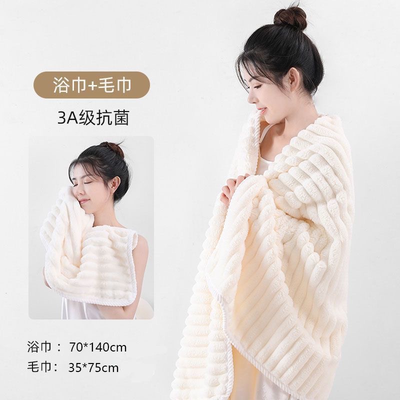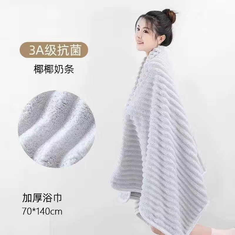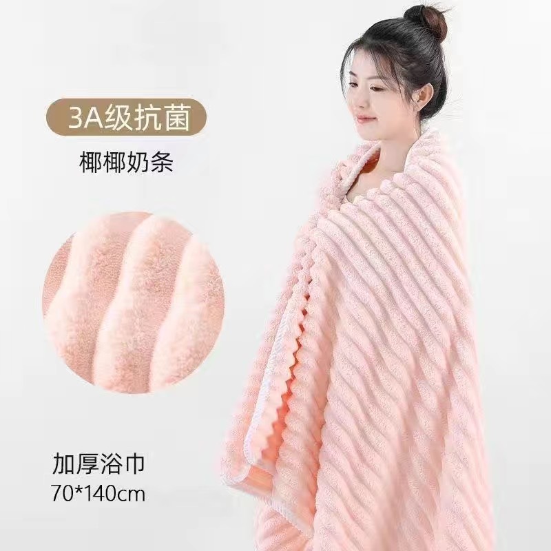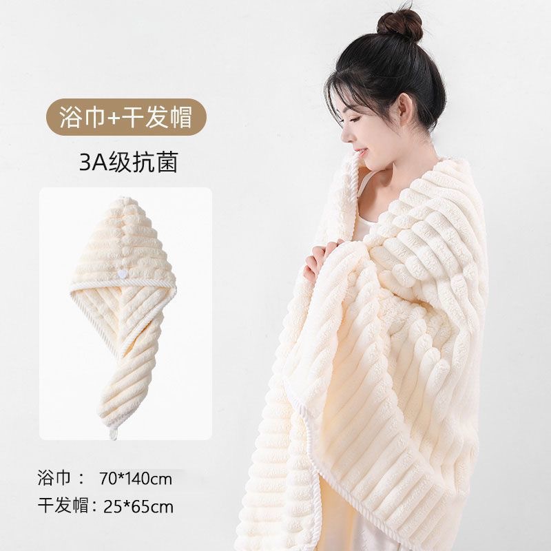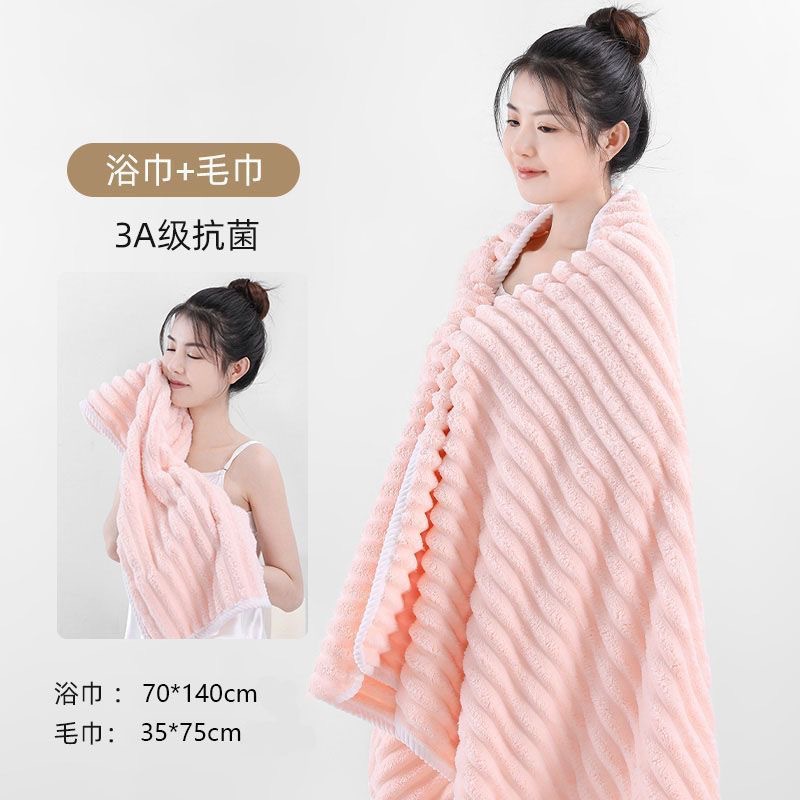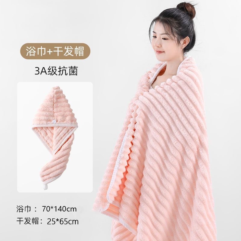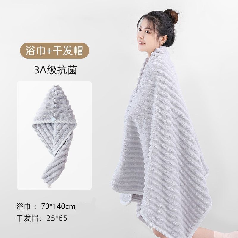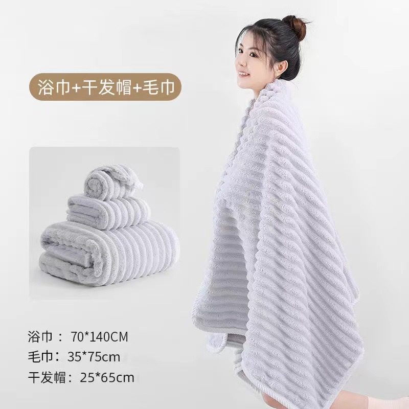 珊瑚绒毛巾浴巾干发帽套装条纹糖果条加大加厚柔软吸水家用跨境