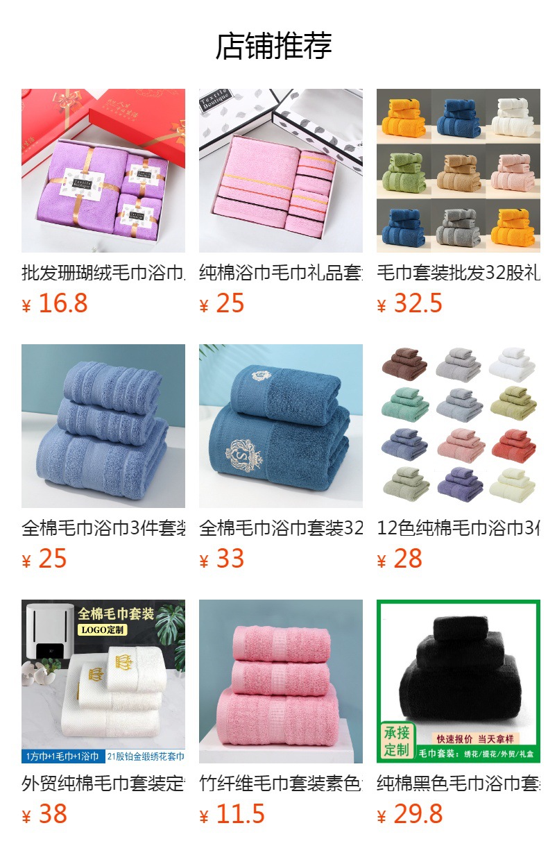 | 1 square towel +1 towel +1 bath towel(1方巾+1毛巾+1浴巾) | USD $7.66 | 200 set available |