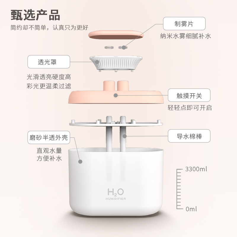 厂家大容量双喷加湿器家用新款迷你3.3L七彩小型雾化空气净化器