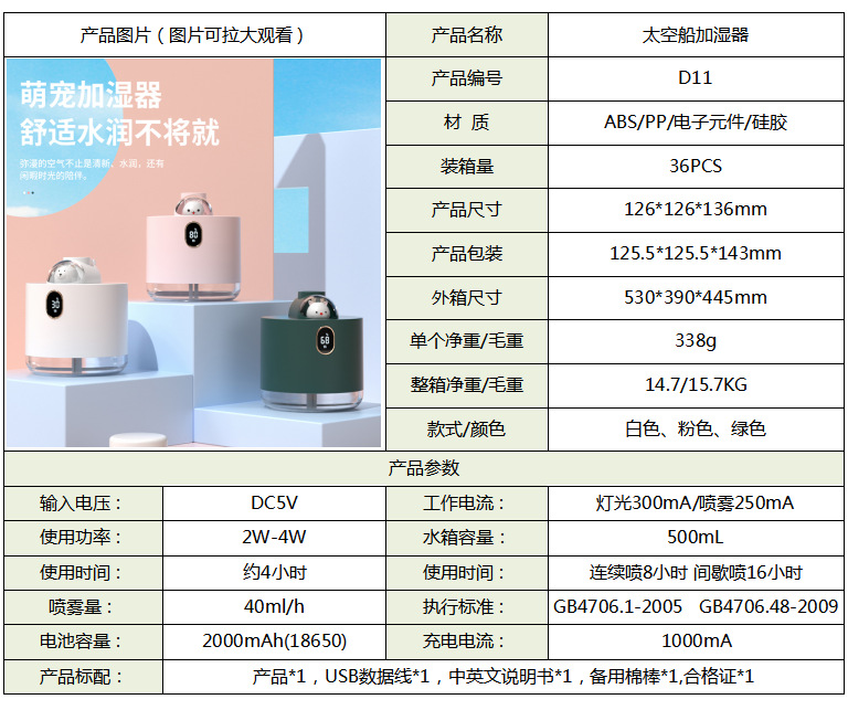 爆款萌宠太空船usb加湿器家用迷你无线充电小型桌面空气加湿器