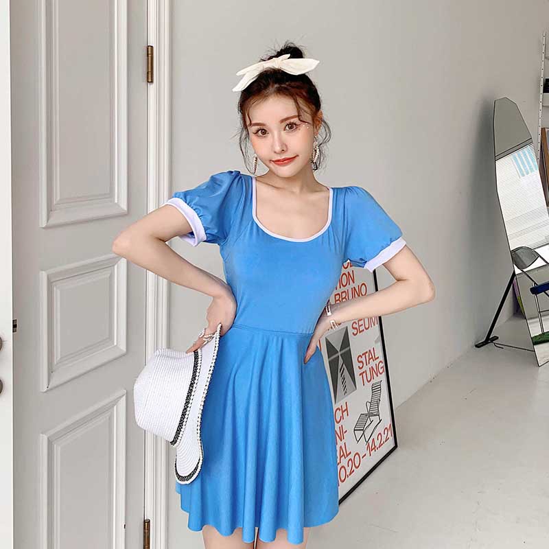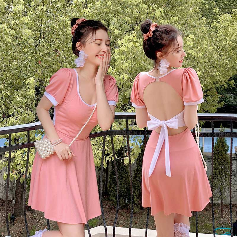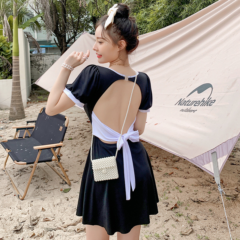 百雅泳衣冬季新款泡温泉少女款性感露背蝴蝶结ins女士连体游泳衣