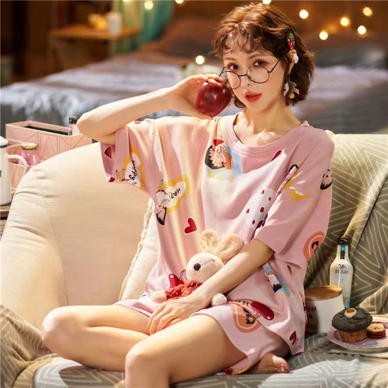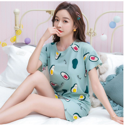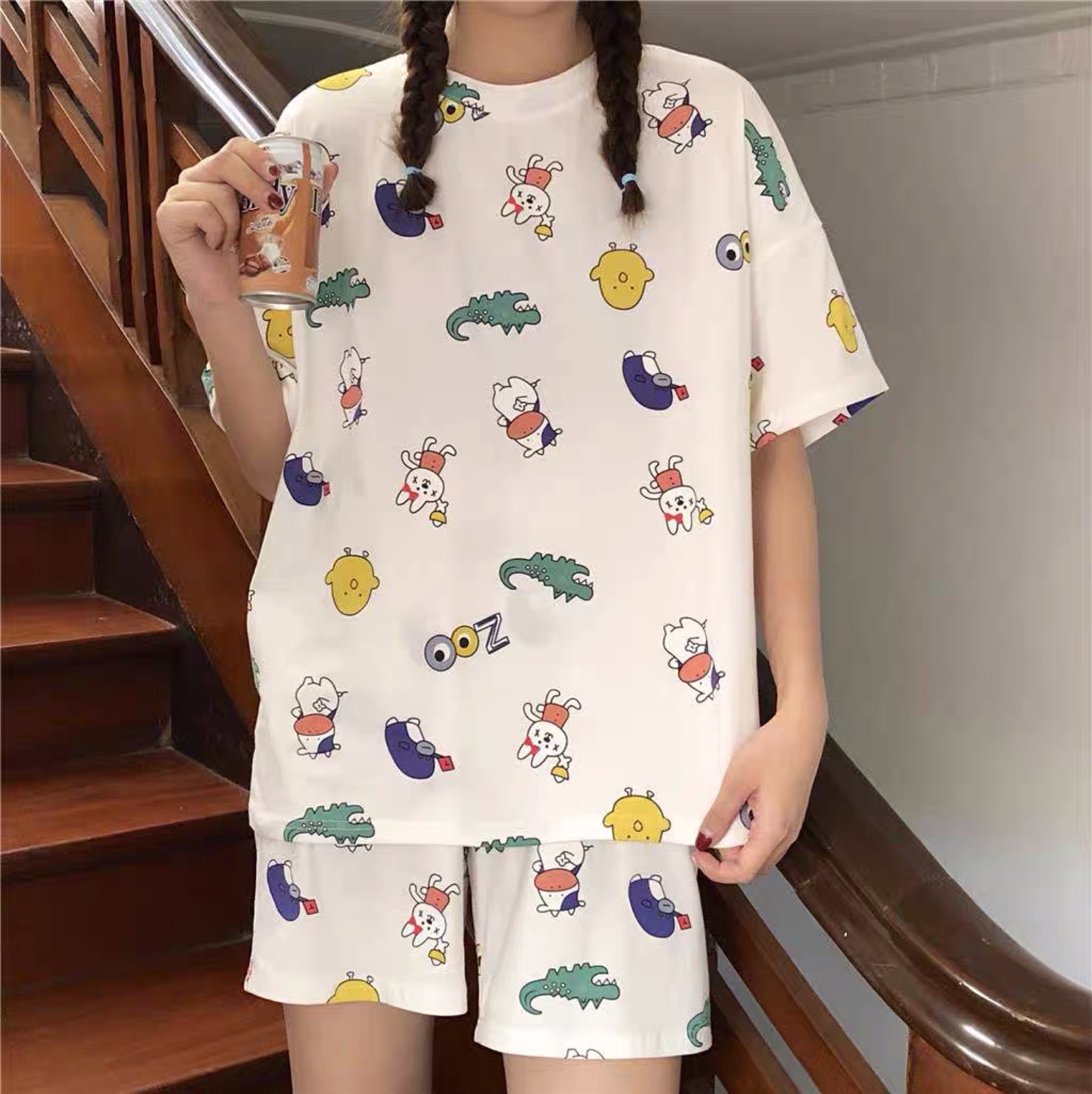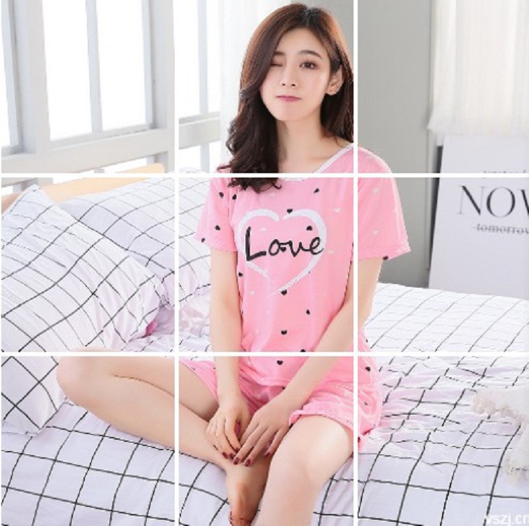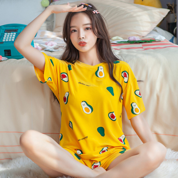 短袖睡衣女夏季家居服套装休闲韩版圆领卡通米黄熊爱心熊睡衣套装