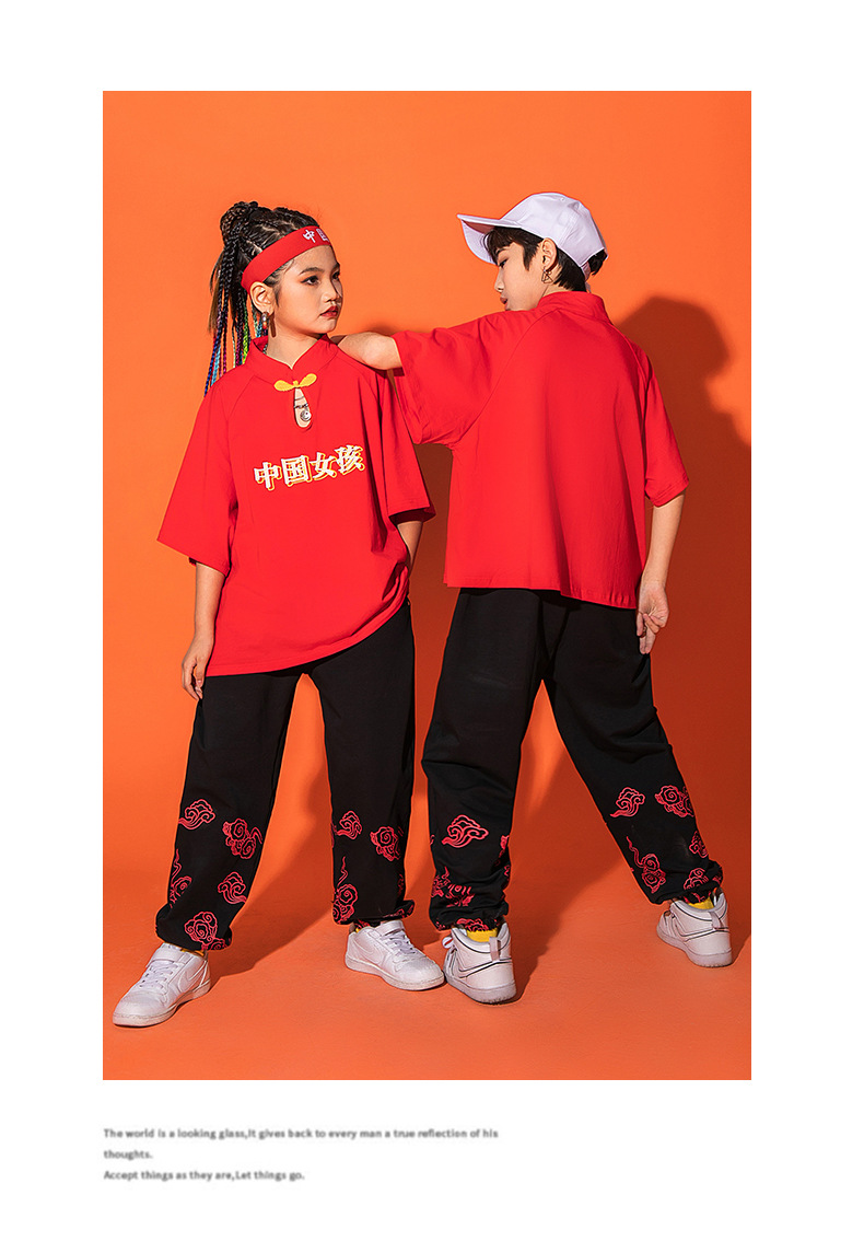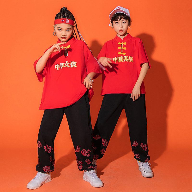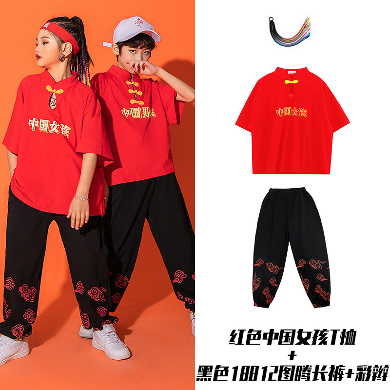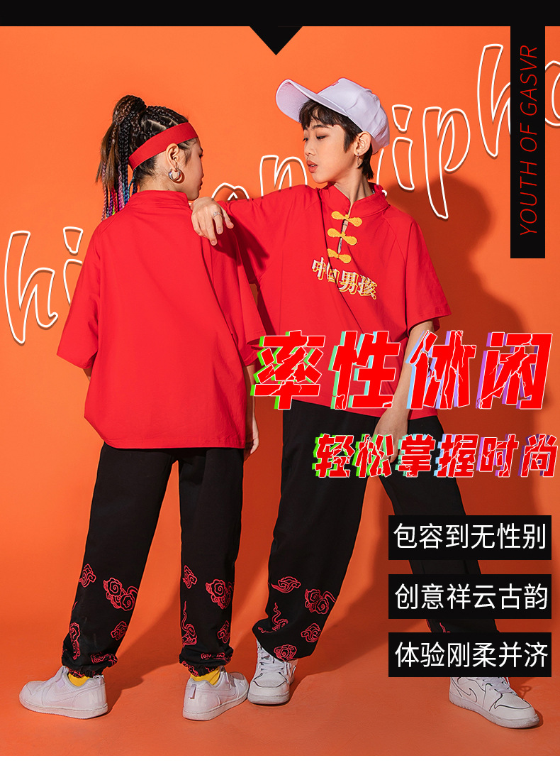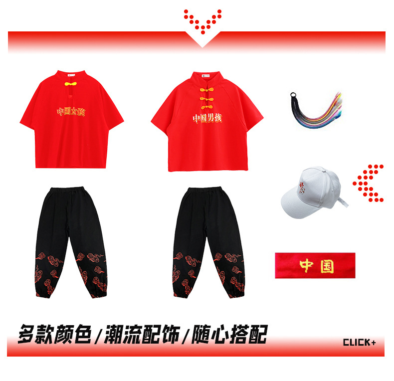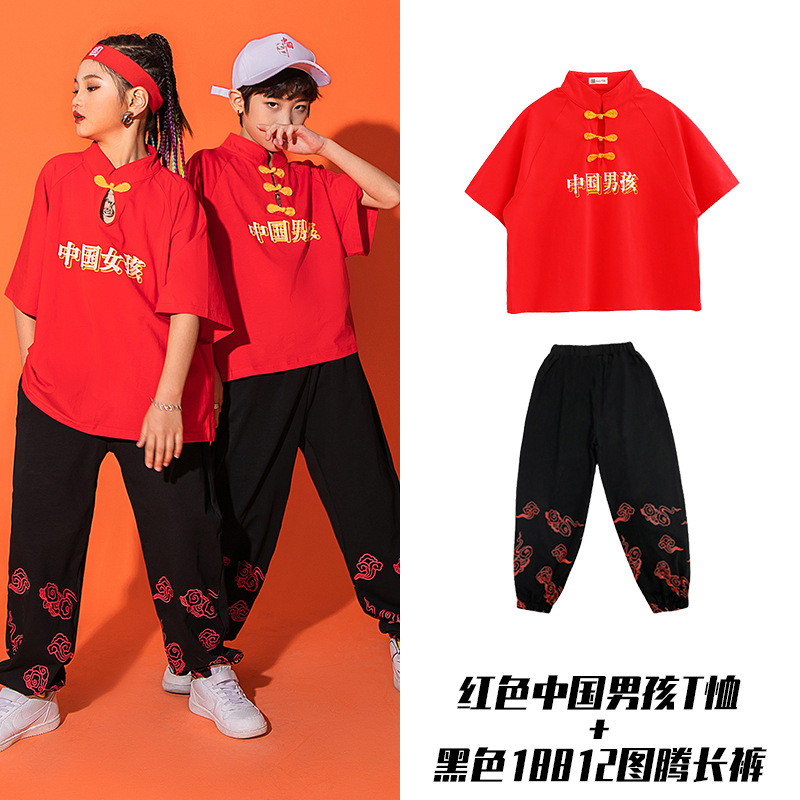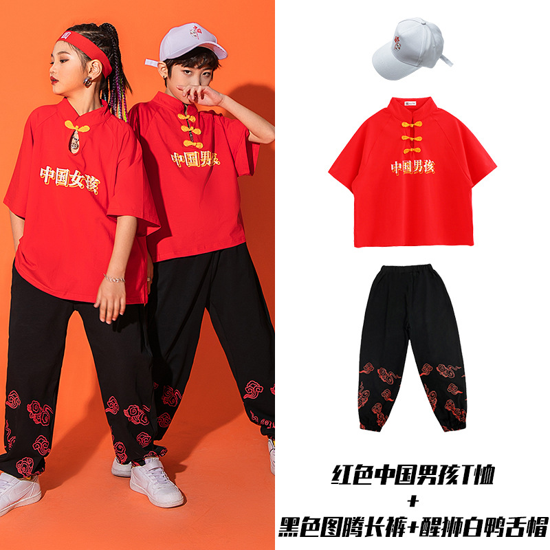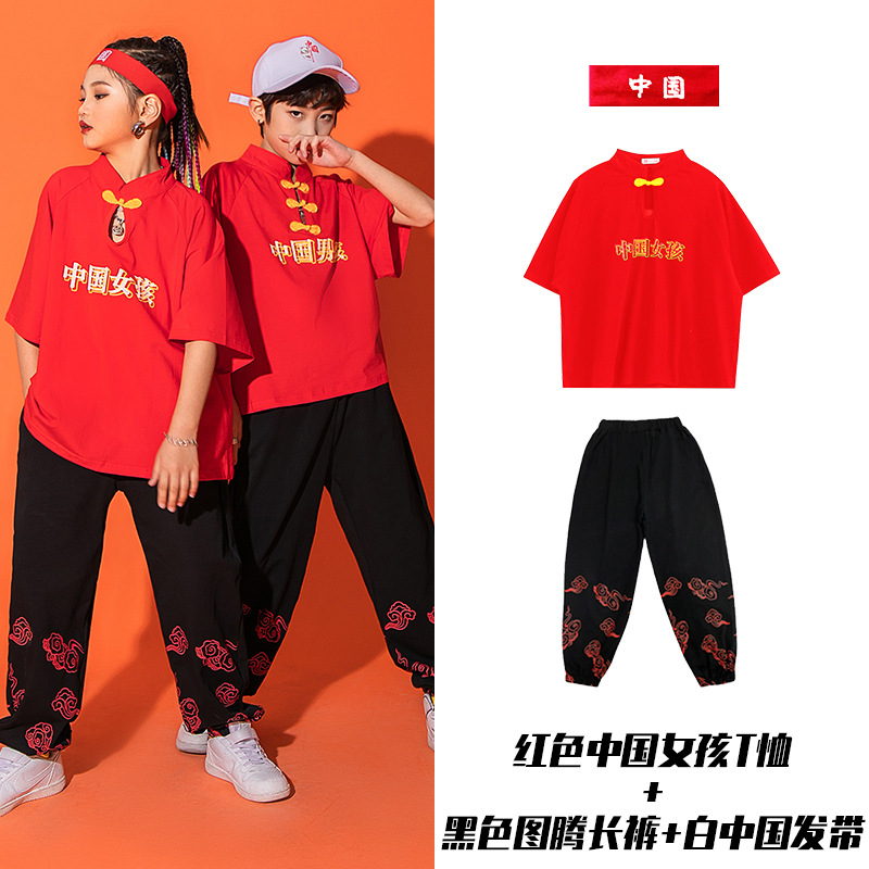 六一儿童中国风演出服小学生运动会服装红色嘻哈套装少儿街舞潮服