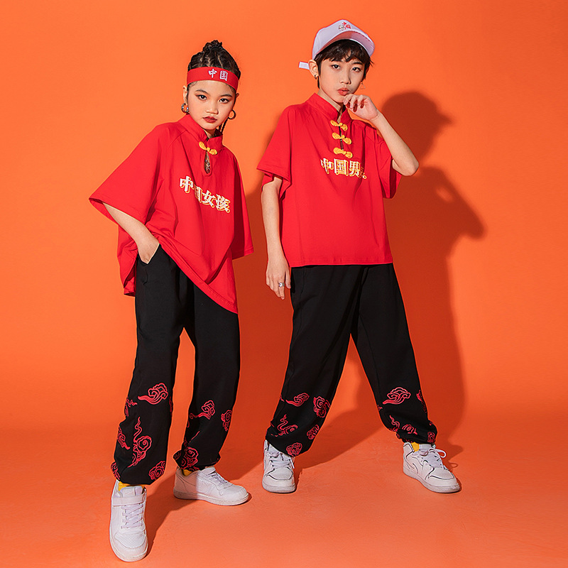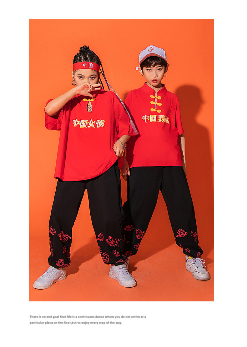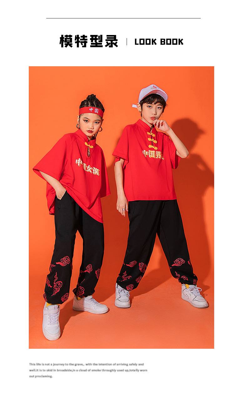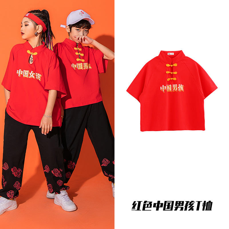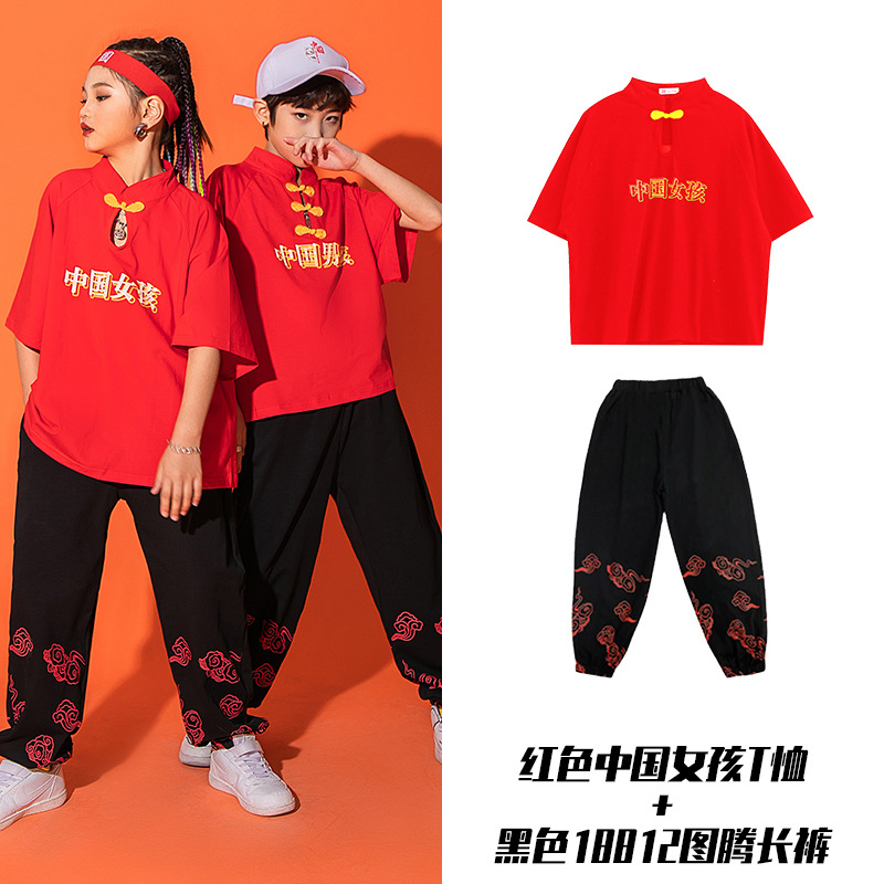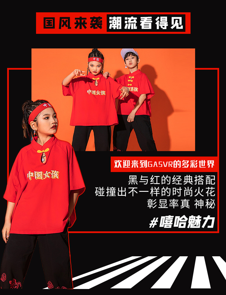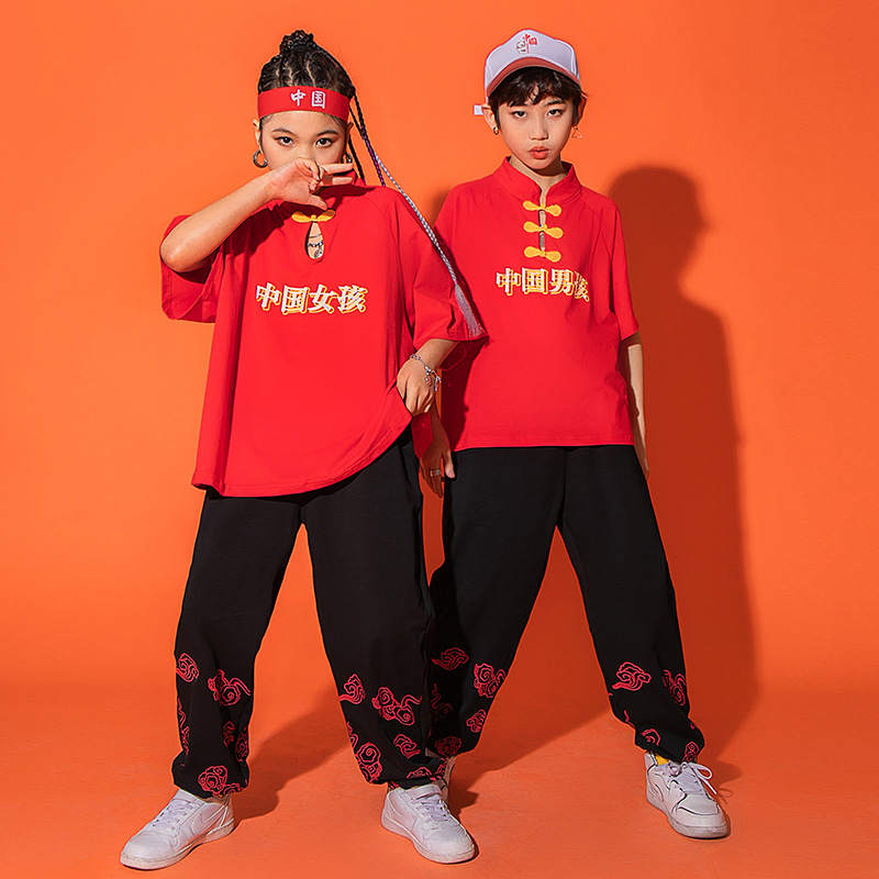六一儿童中国风演出服小学生运动会服装红色嘻哈套装少儿街舞潮服