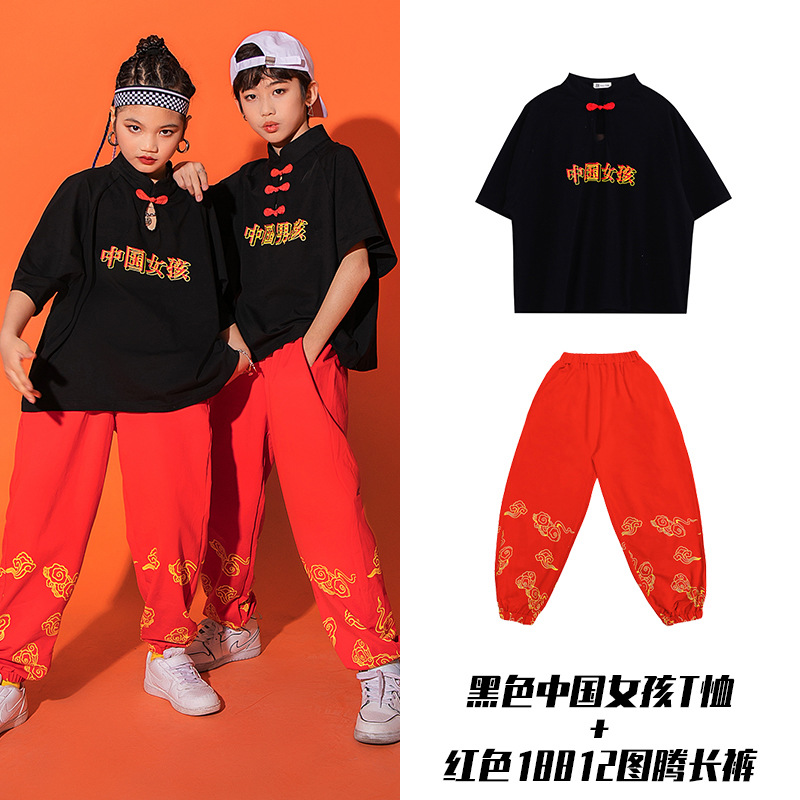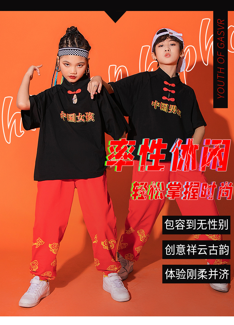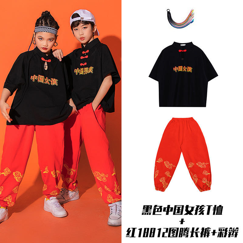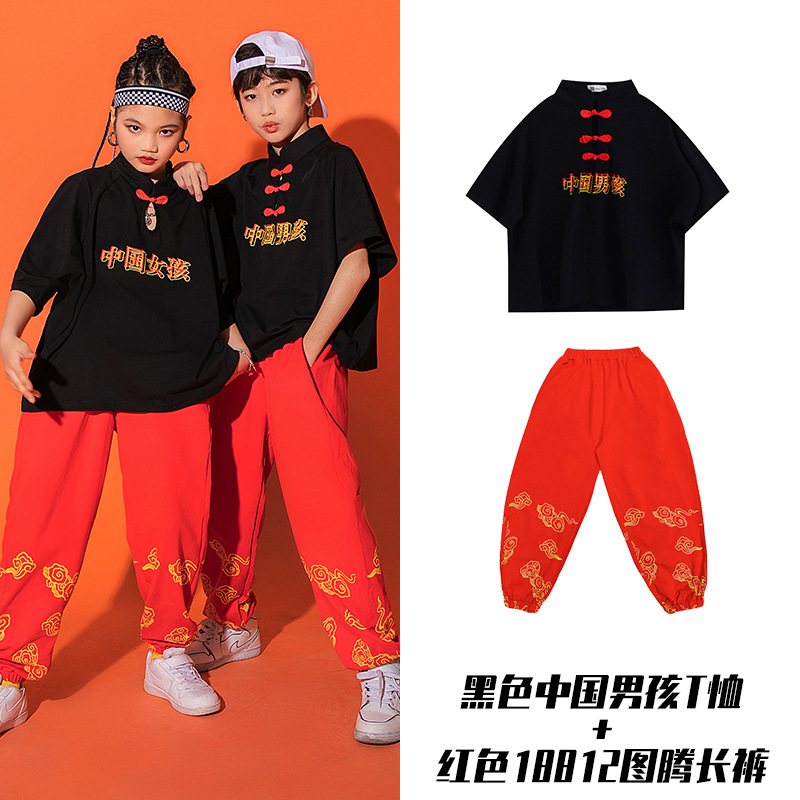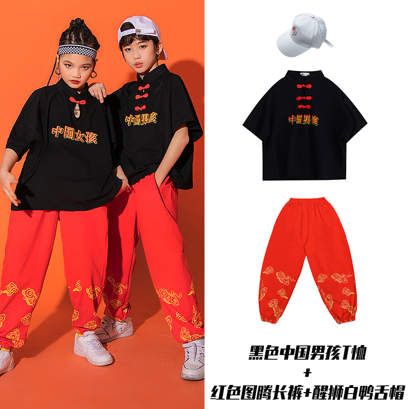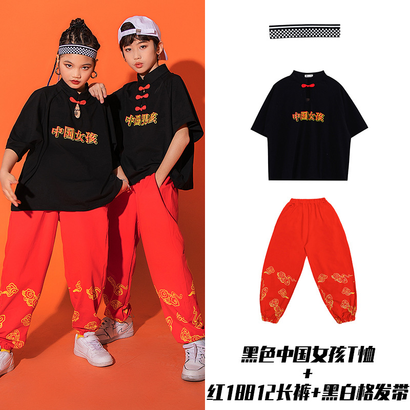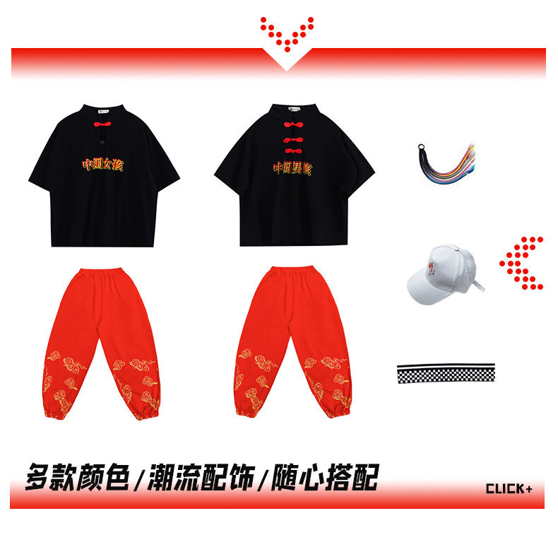 六一儿童中国风演出服小学生运动会服装红色嘻哈套装少儿街舞潮服