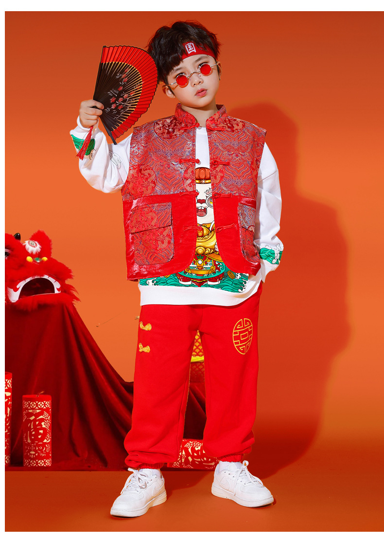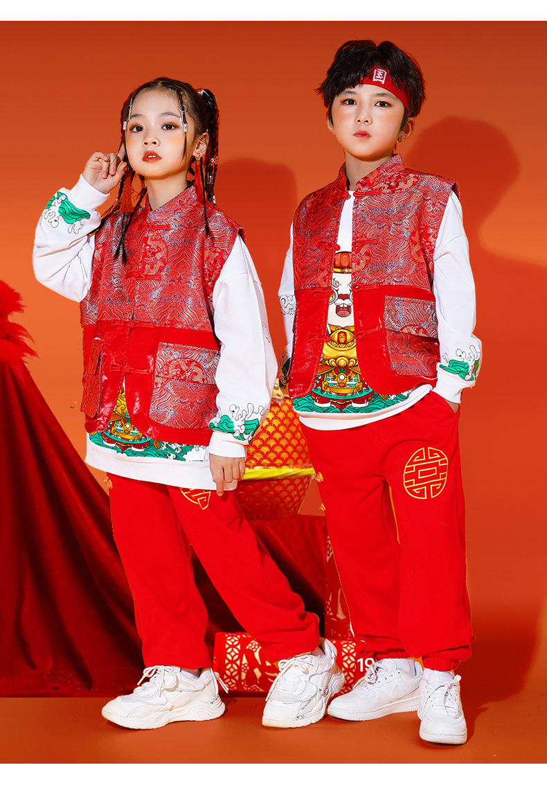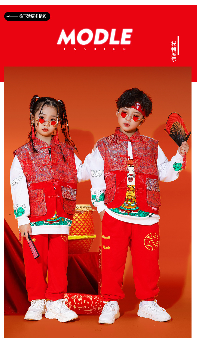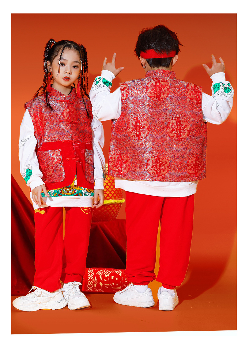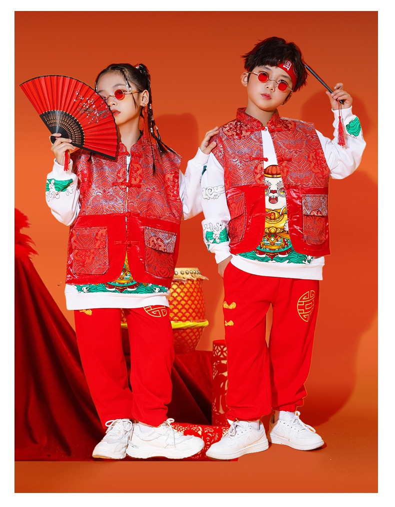 儿童喜庆演出服男女童拜年服儿童嘻哈潮流套装中国风元旦表演服装
