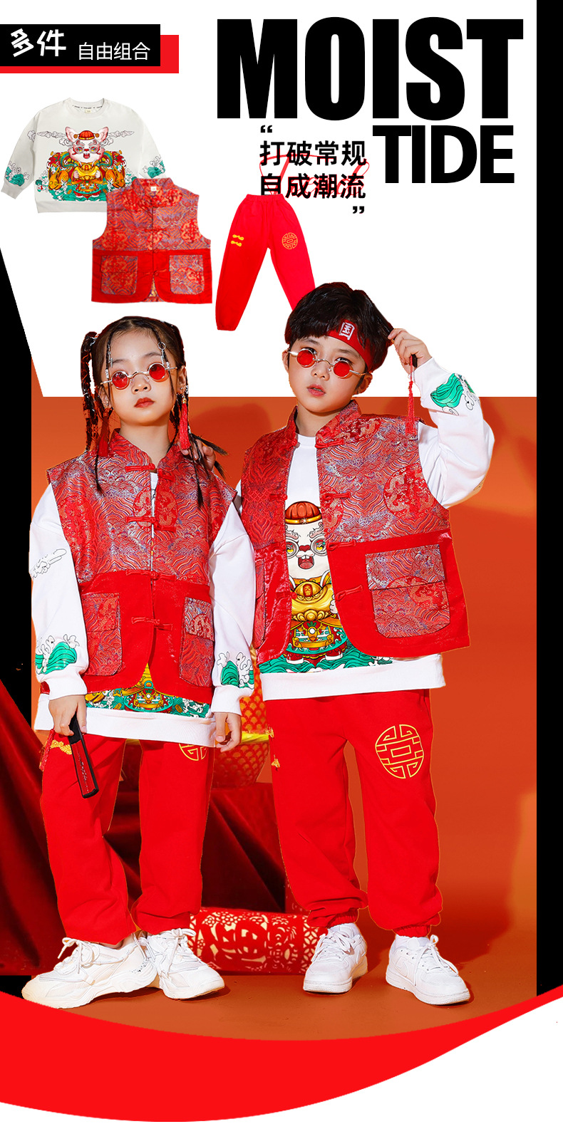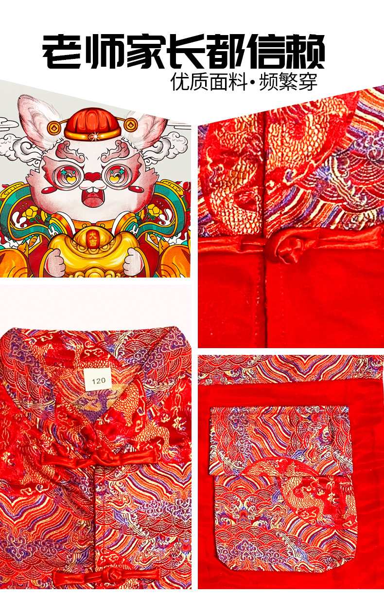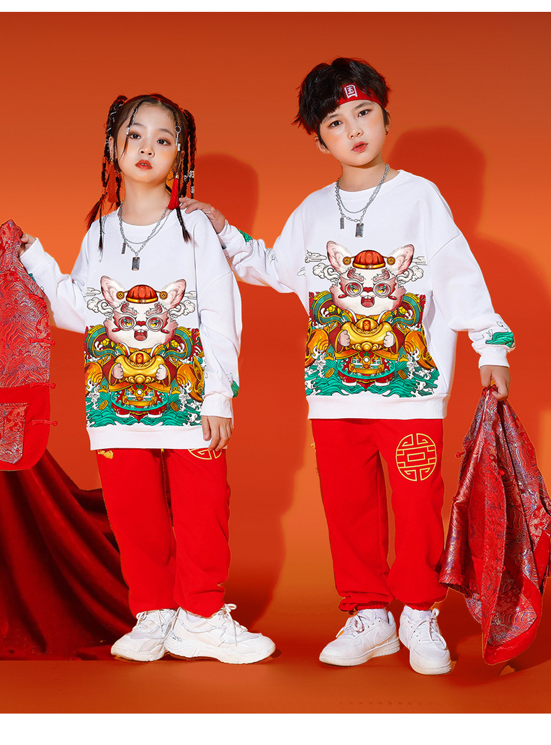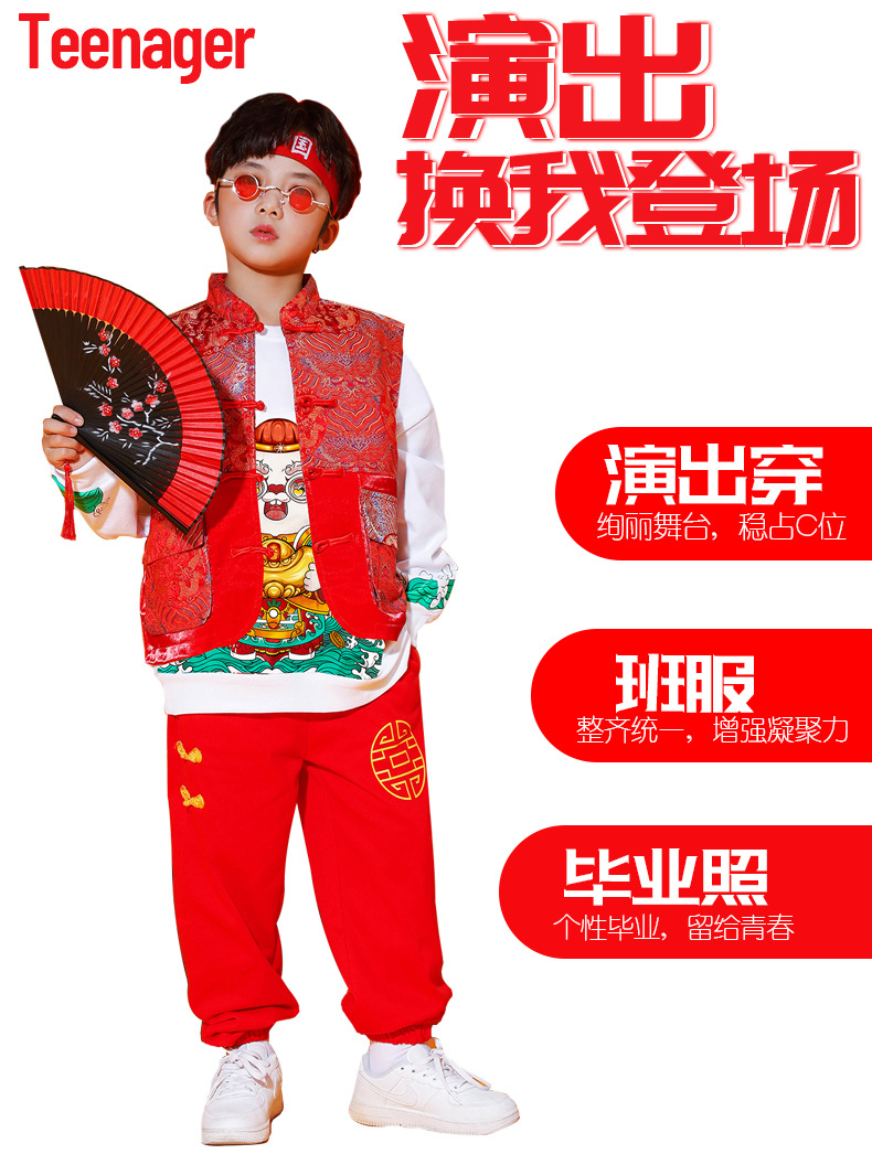 儿童喜庆演出服男女童拜年服儿童嘻哈潮流套装中国风元旦表演服装