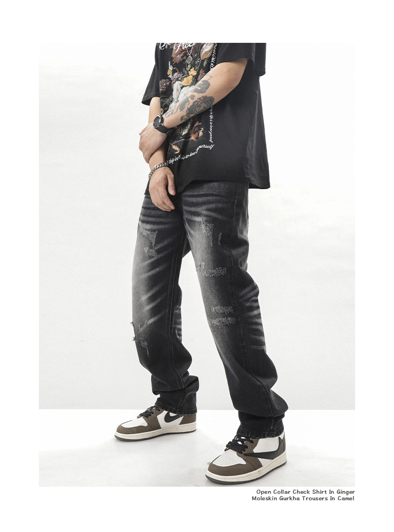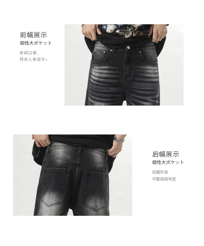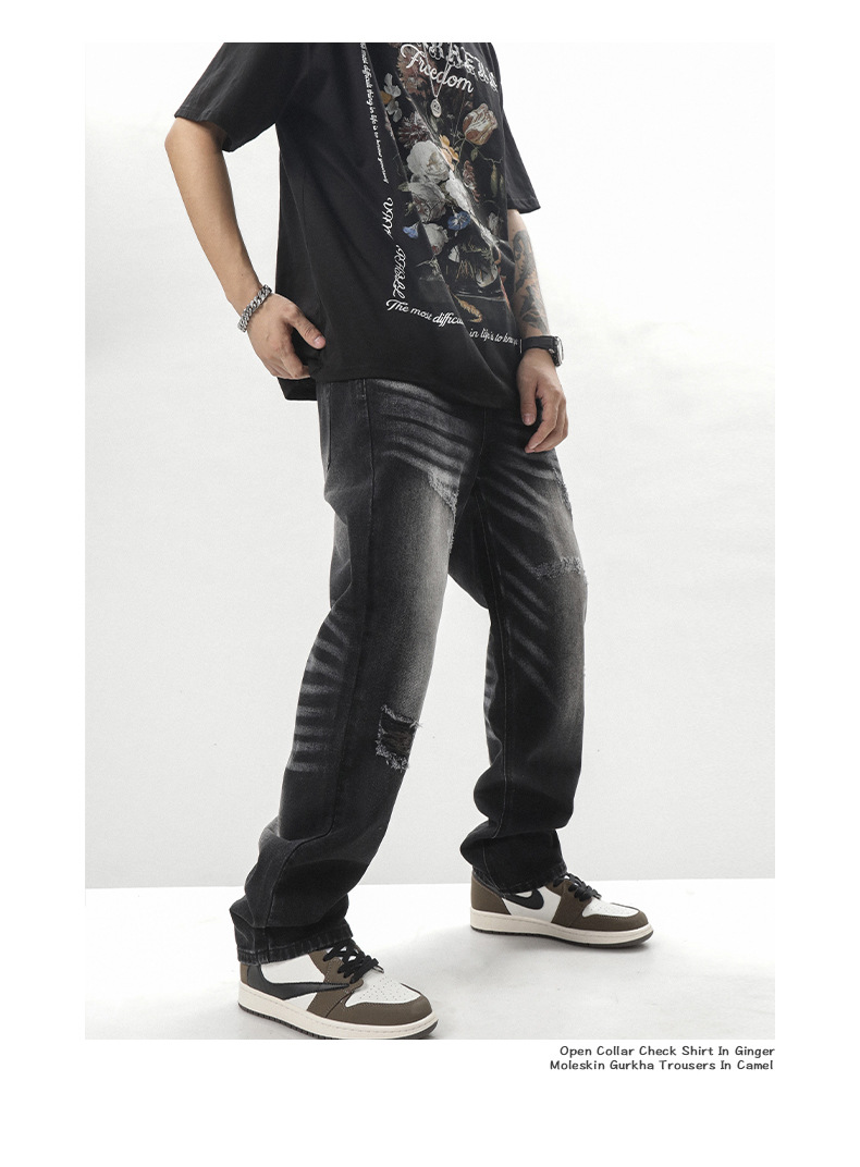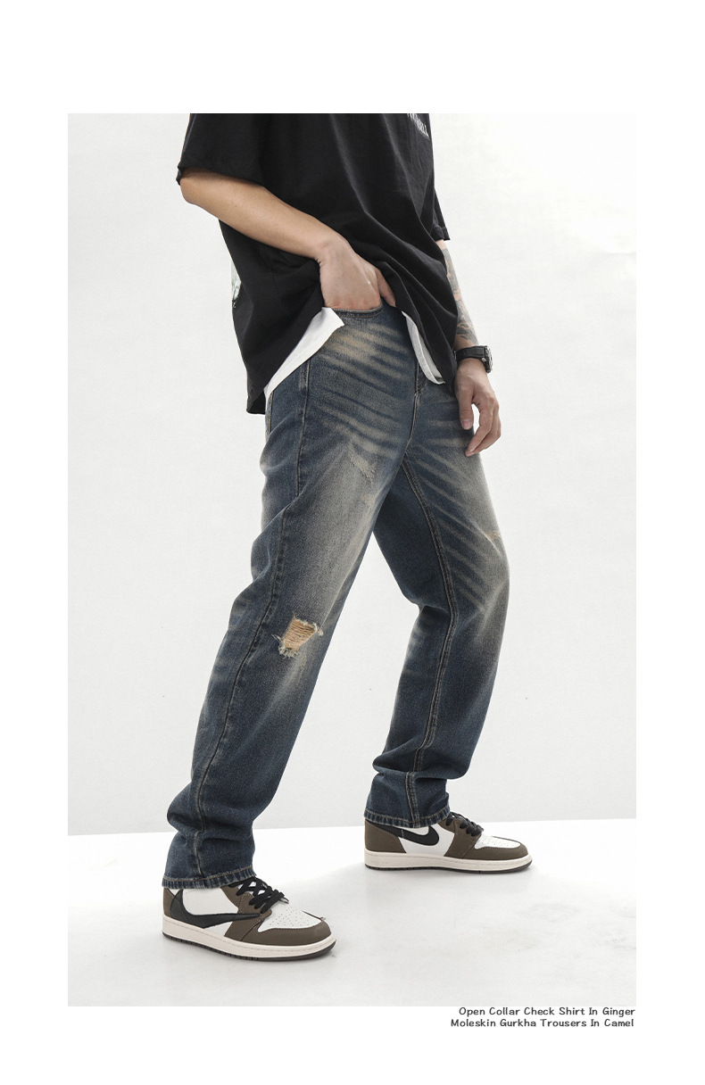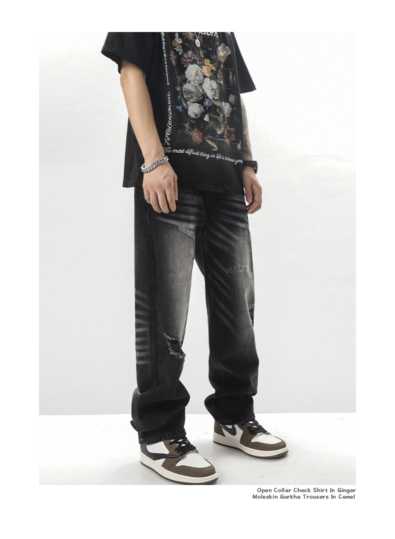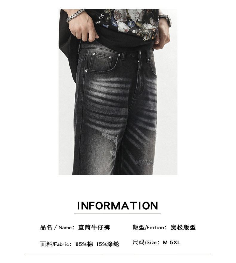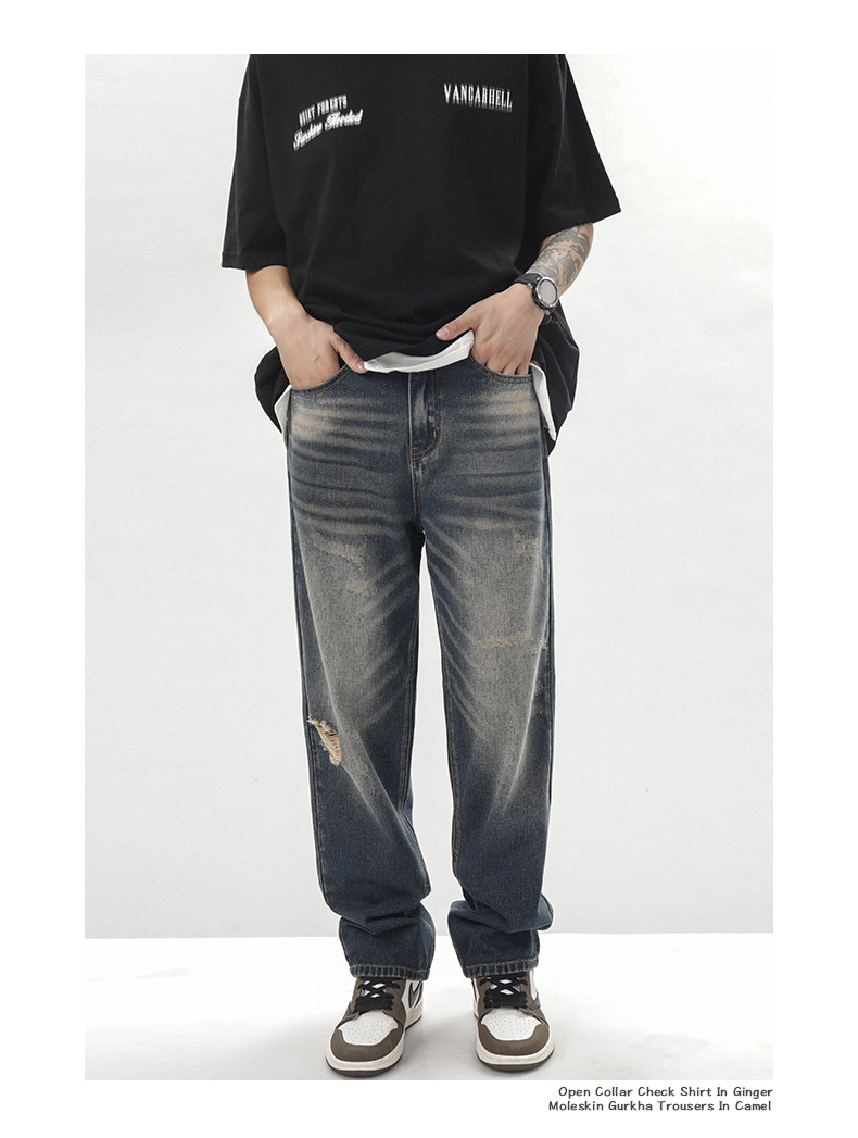 春季美式高级感宽松直筒牛仔裤男士新款高街潮牌水洗复古破洞长裤