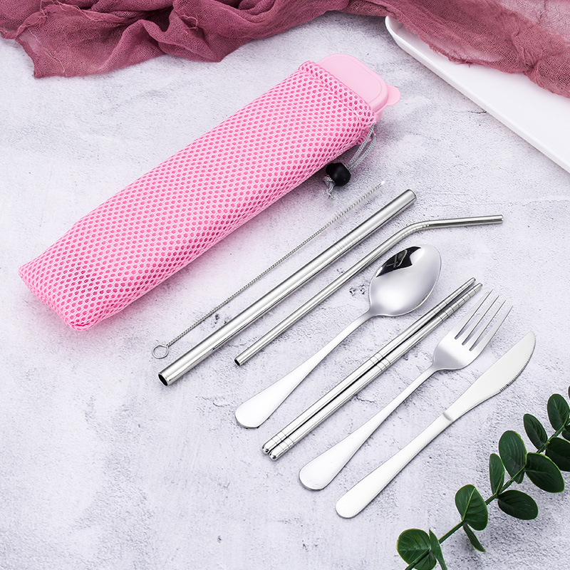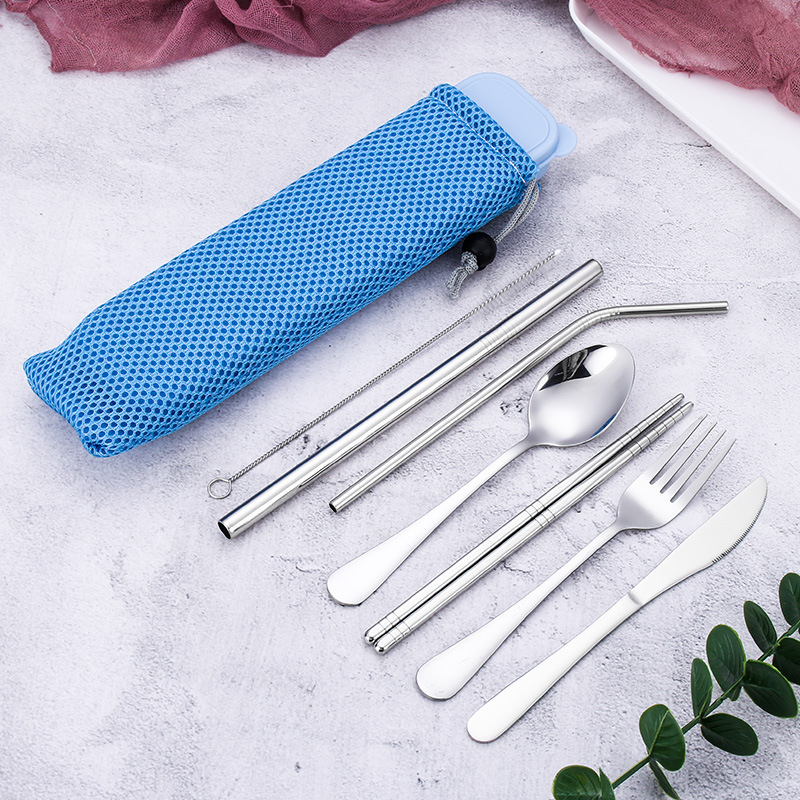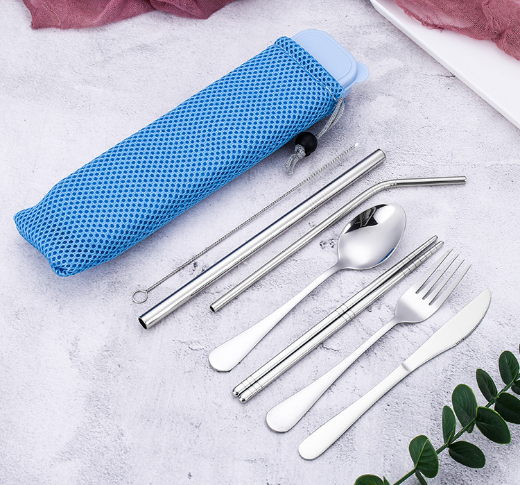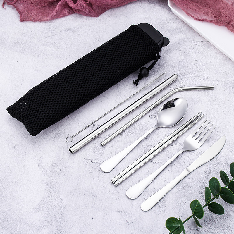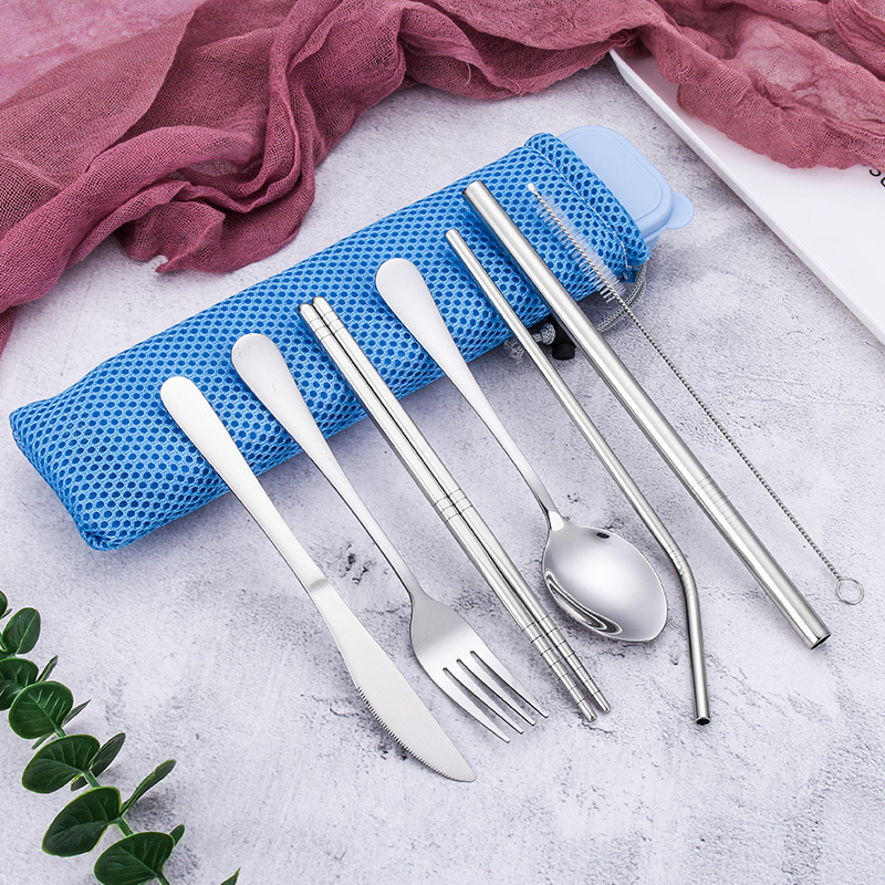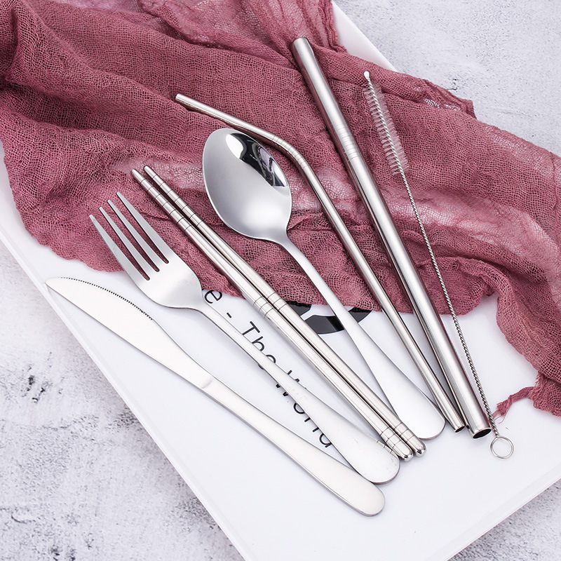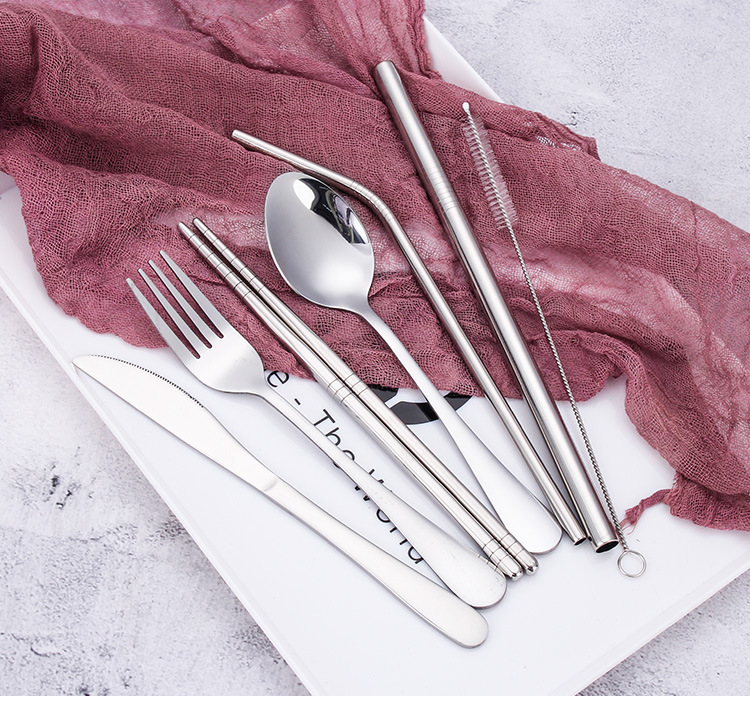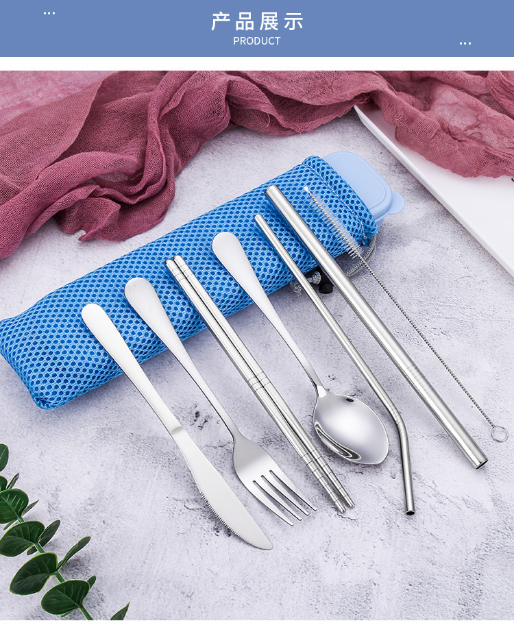 跨境便携式304不锈钢餐具刀叉勺筷子吸管户外礼品七件套餐具套装