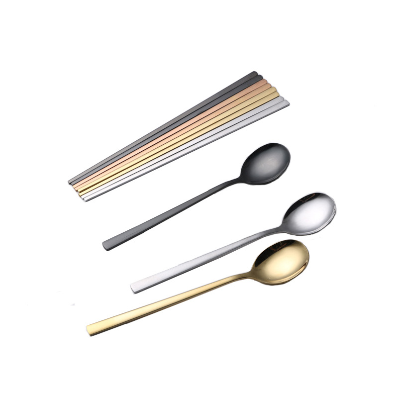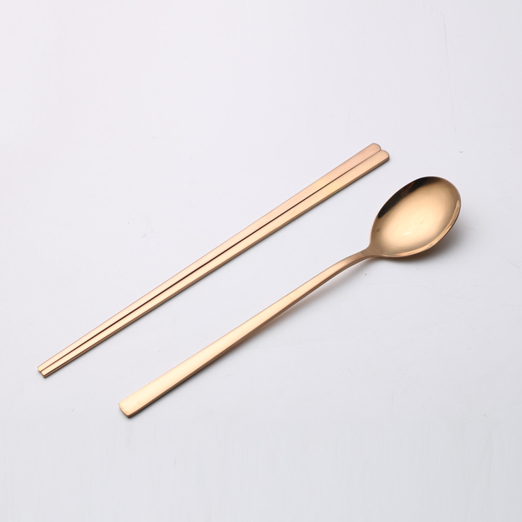 厂家批发韩式不锈钢勺子筷子套装 餐厅酒店金色汤勺实心扁筷子