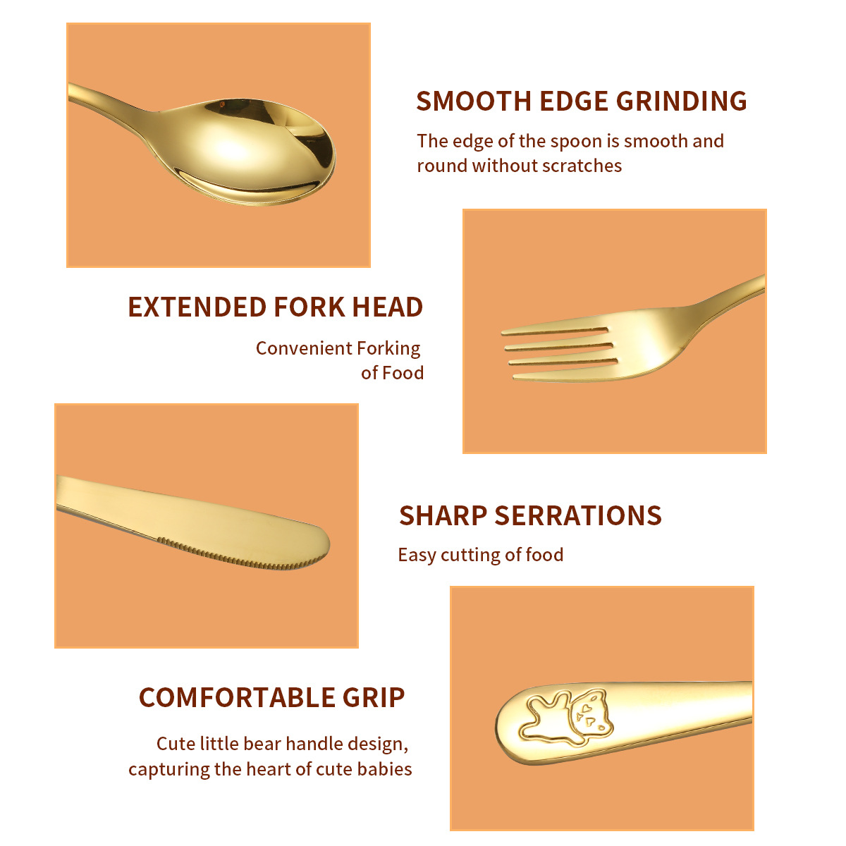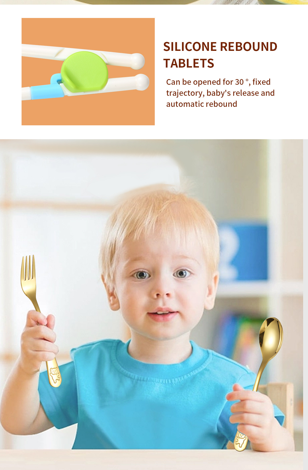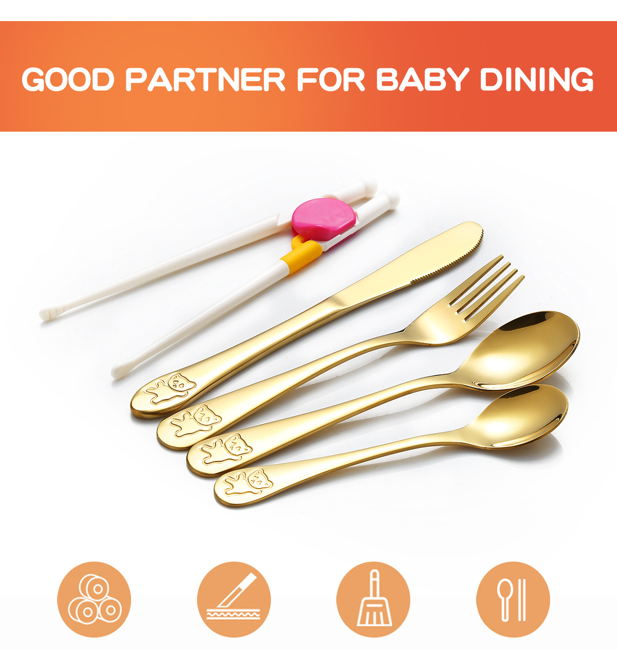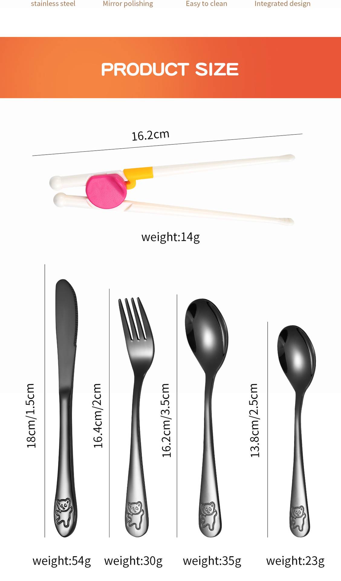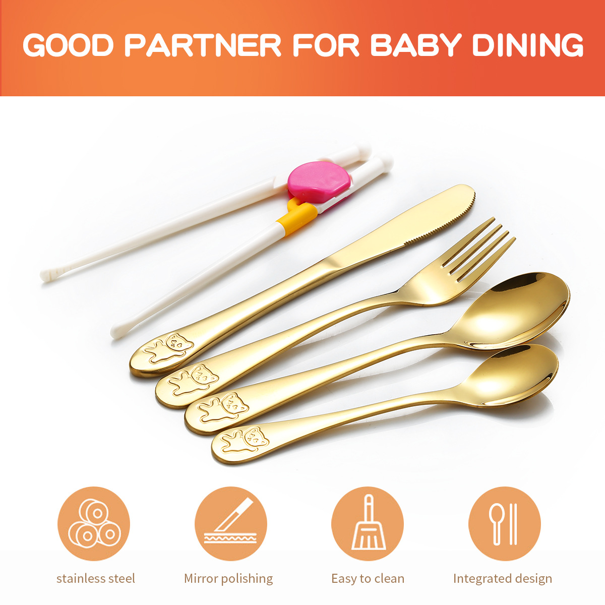 跨境 儿童小熊西餐牛排刀叉训练筷宝宝不锈钢餐具刀叉勺筷子5件套