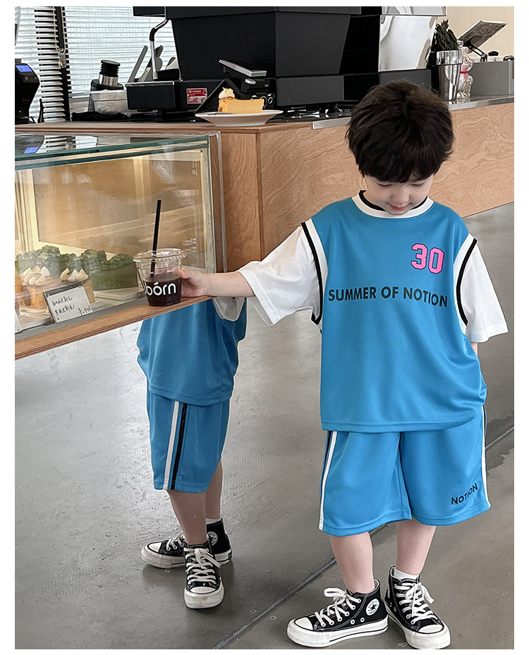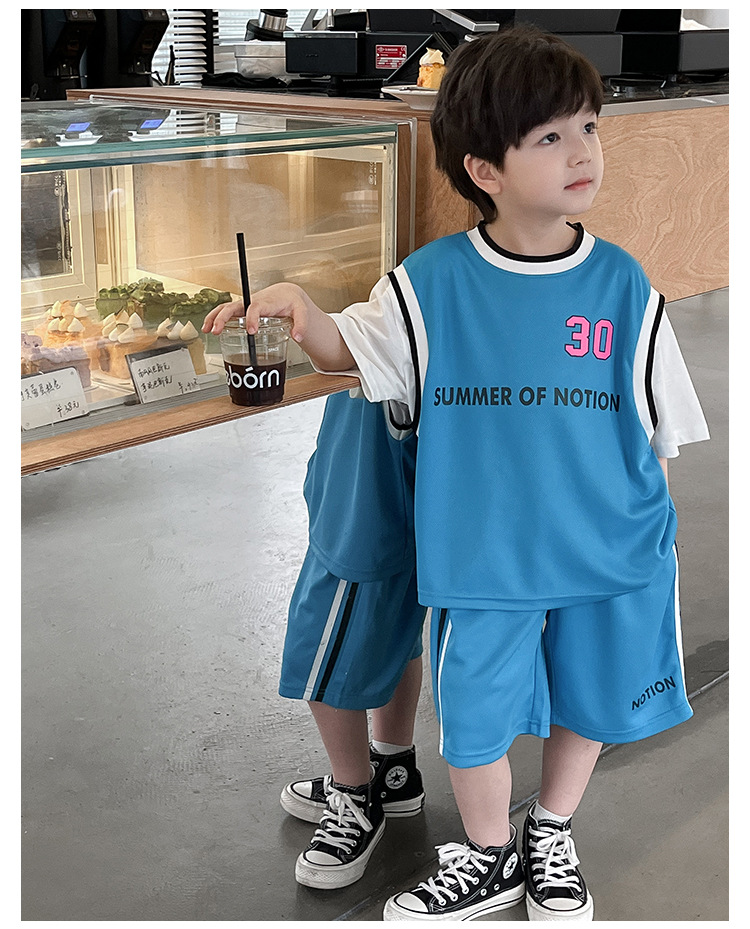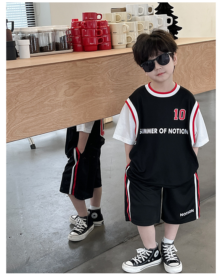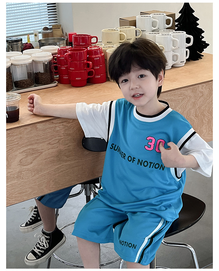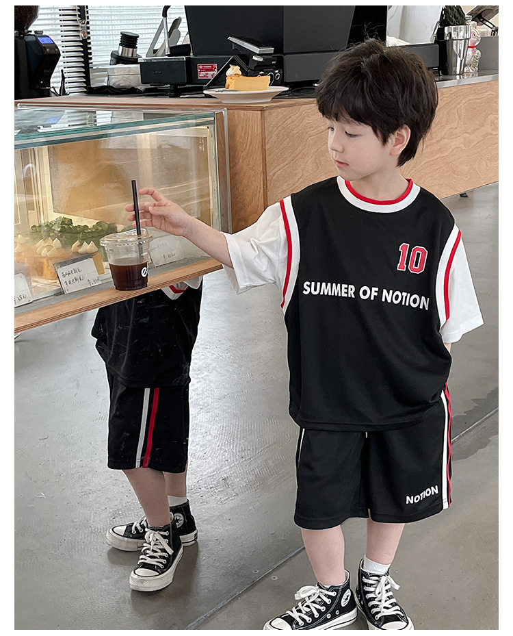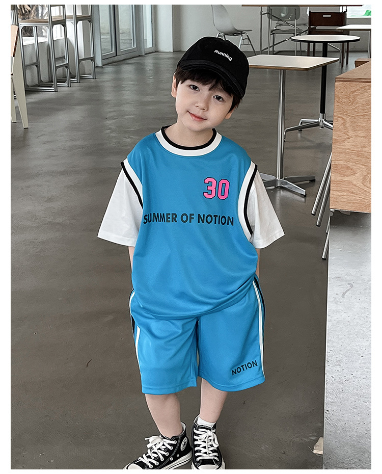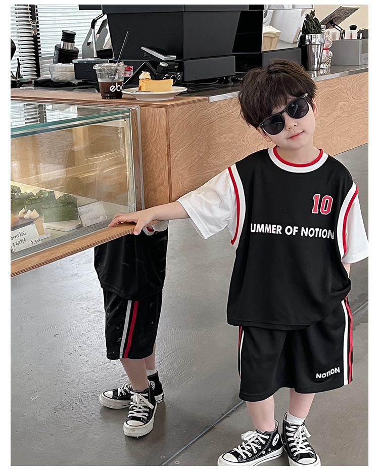 童酷2024儿童夏季新款韩版宝宝字母印花假两件短袖篮球服男童套装